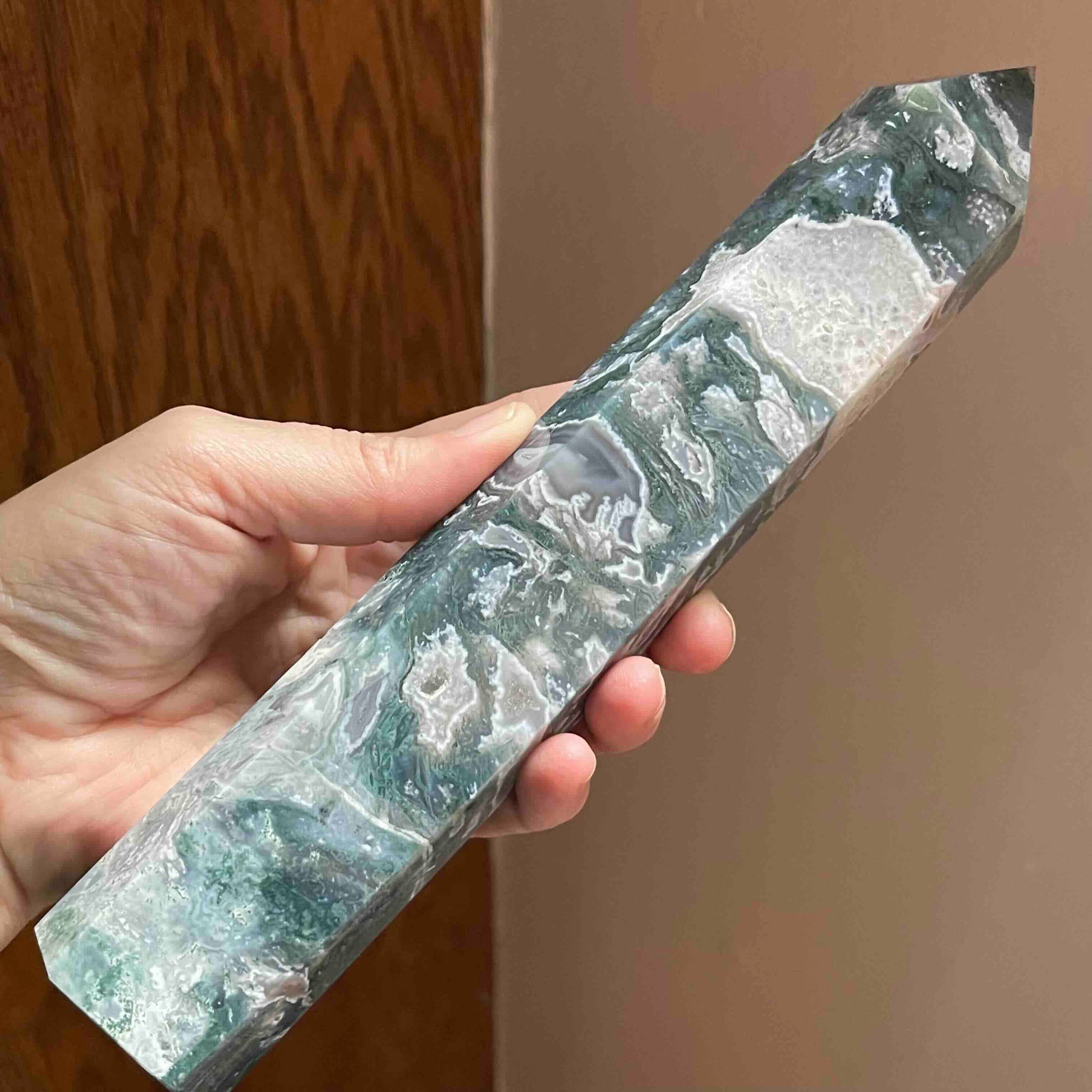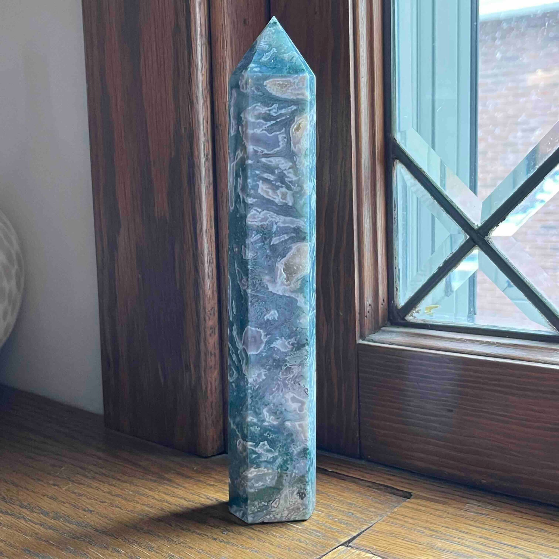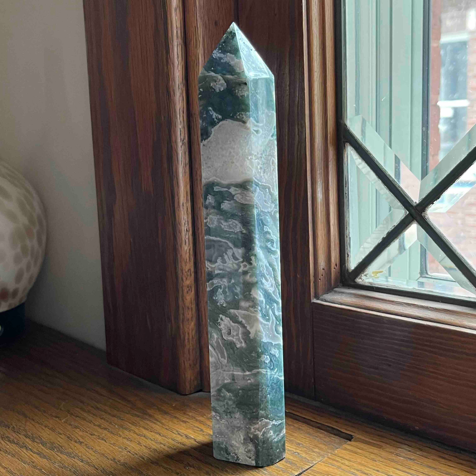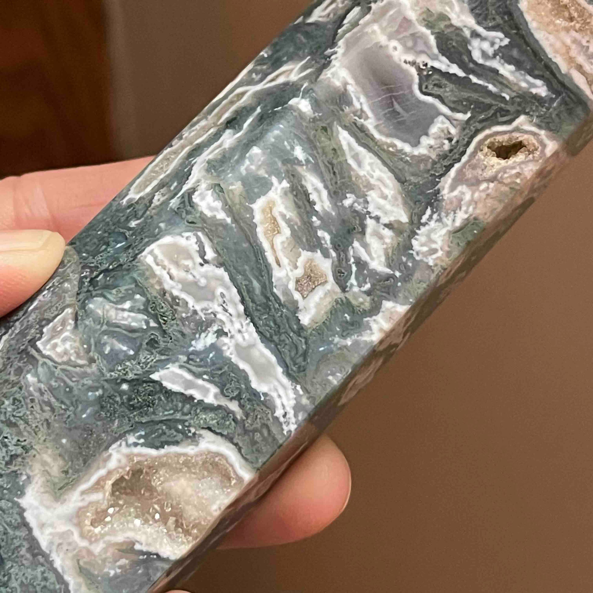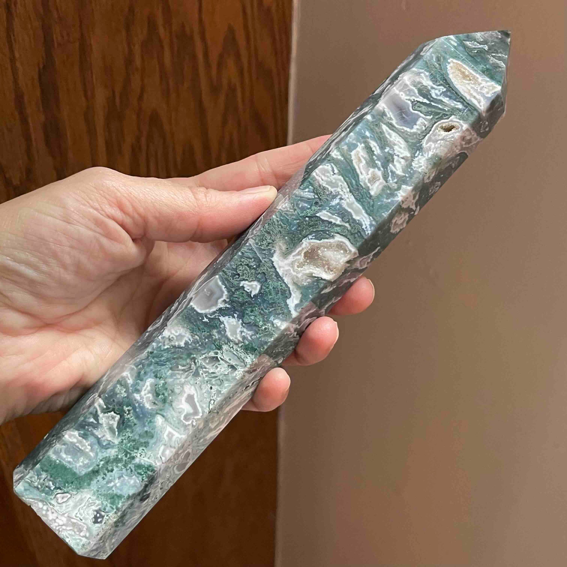 8.75" Large Moss Agate Tower // Sparkling Druzy + Quartz Pocket