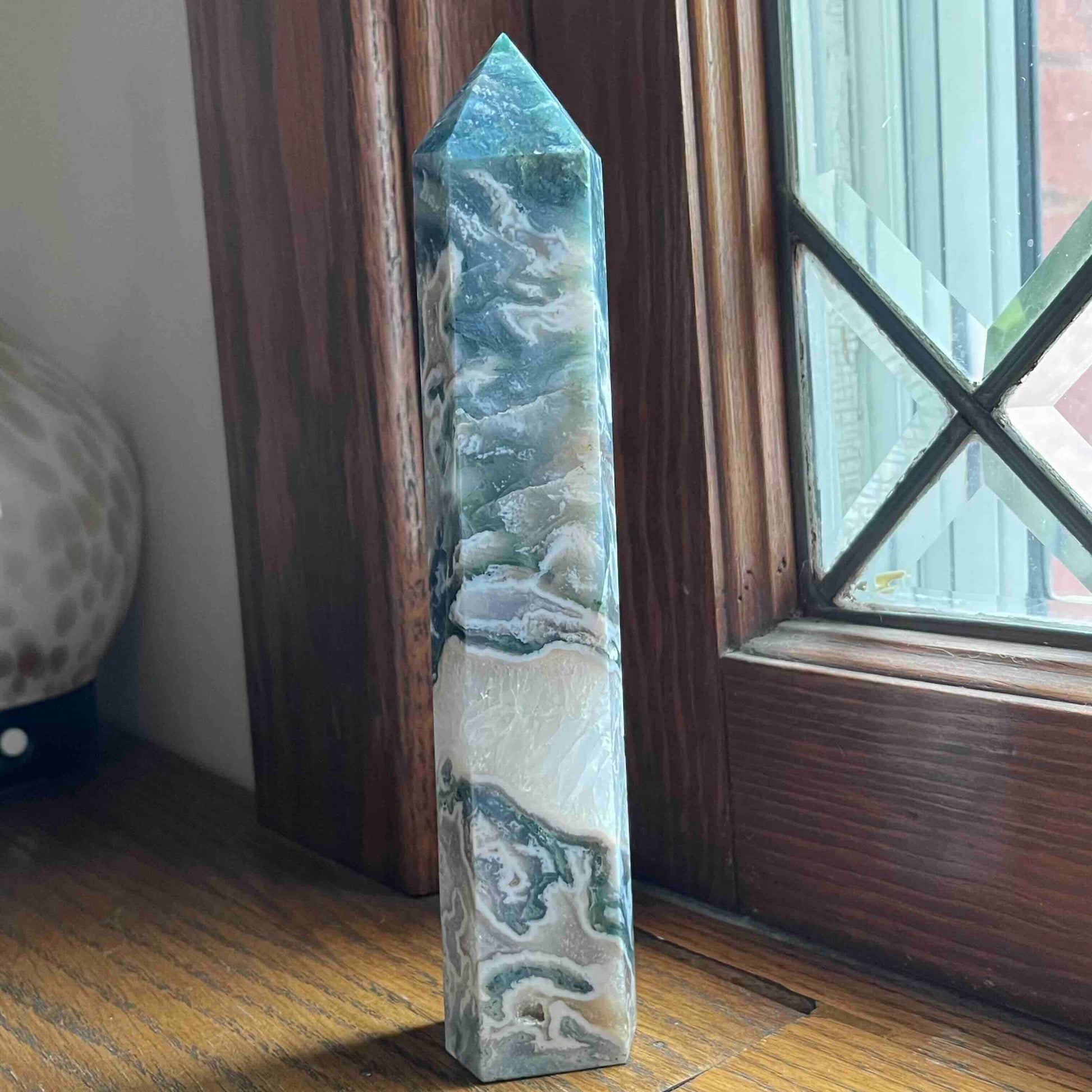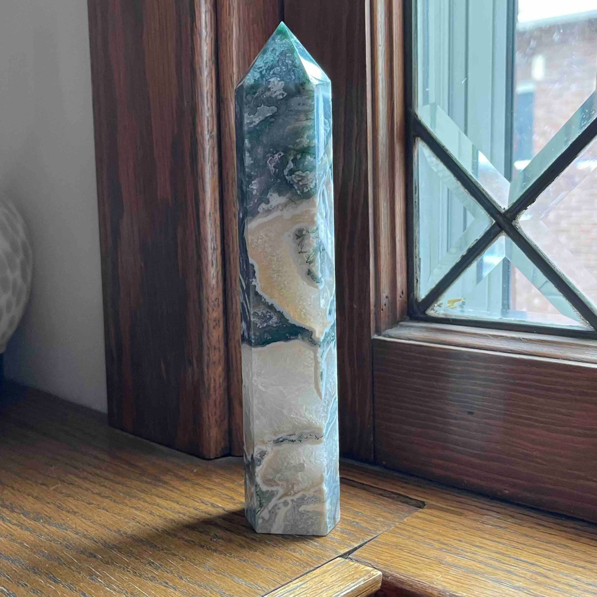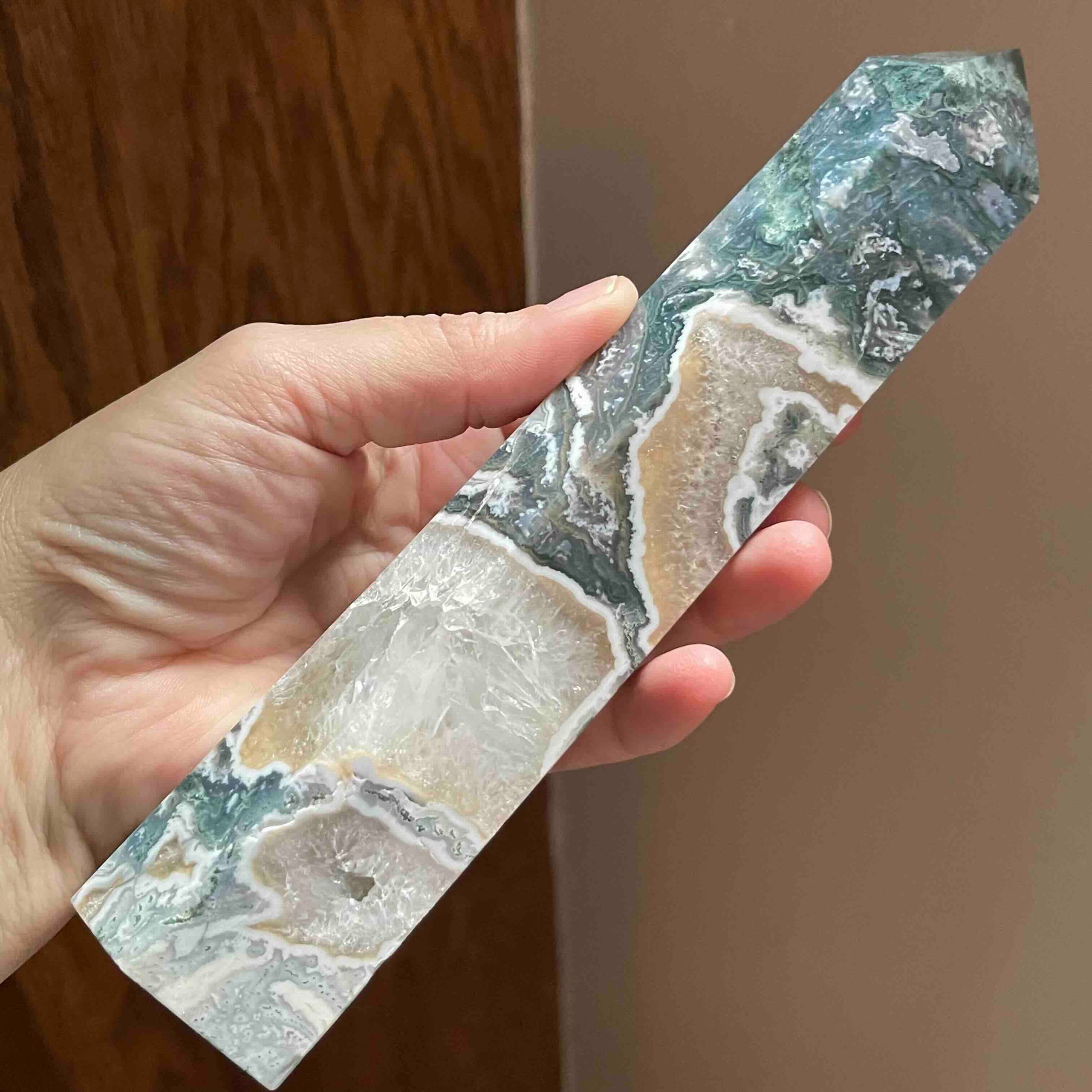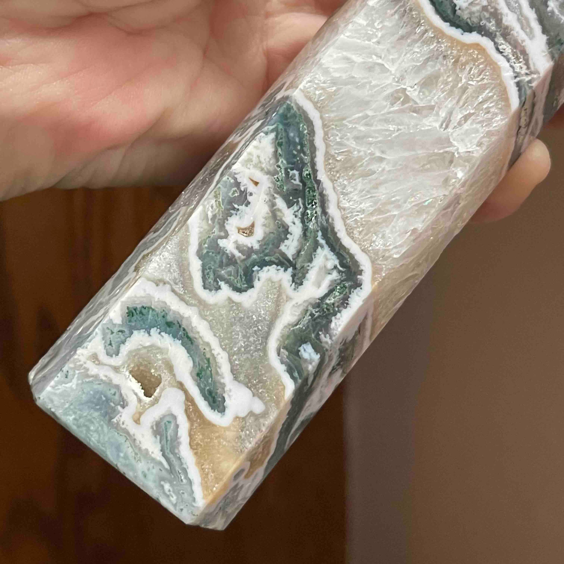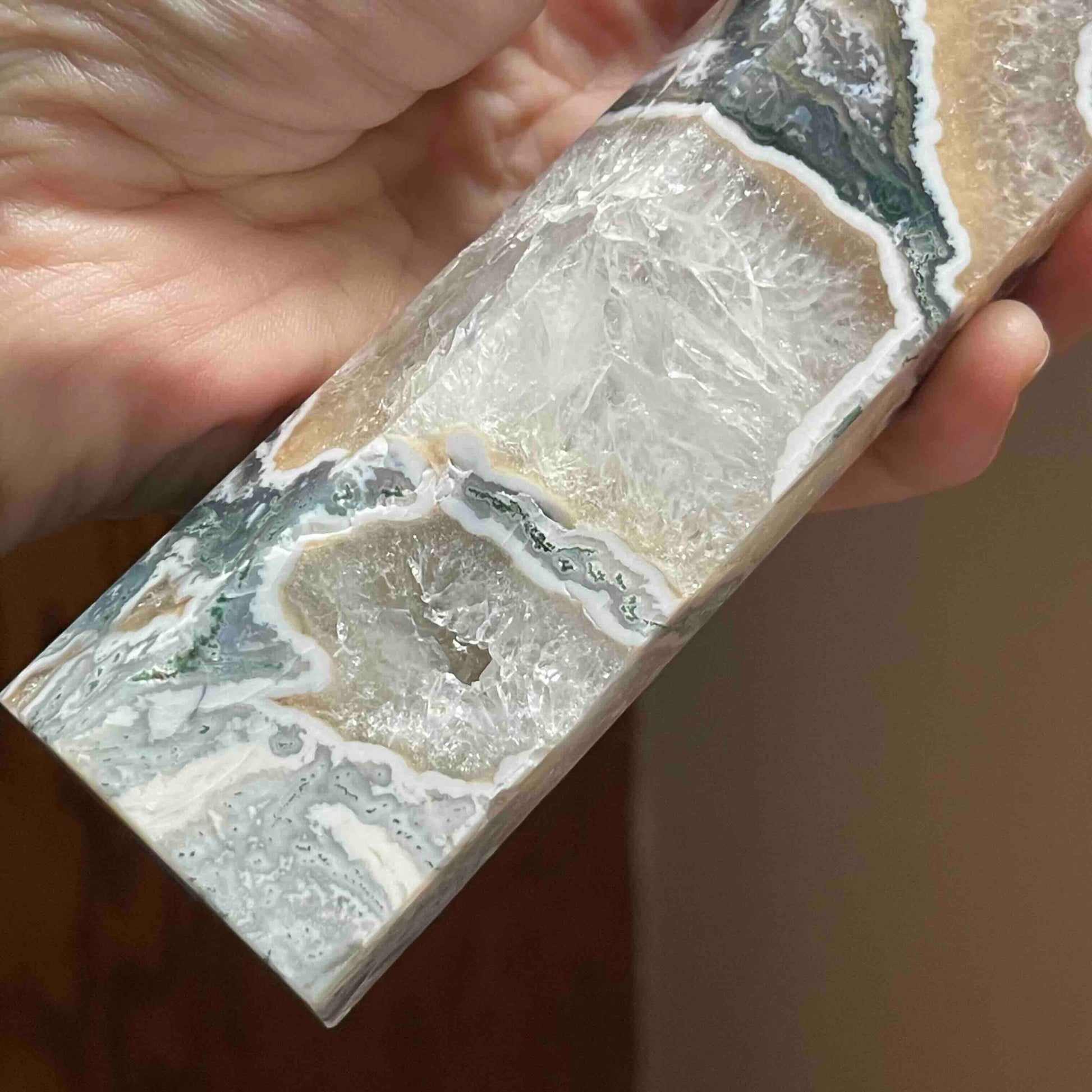 This batch of Moss Agate is breathtaking. It has amazing quartz with ribbons of green and white. You will get lost looking at these earthly delights.