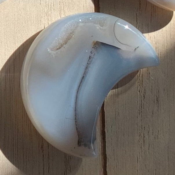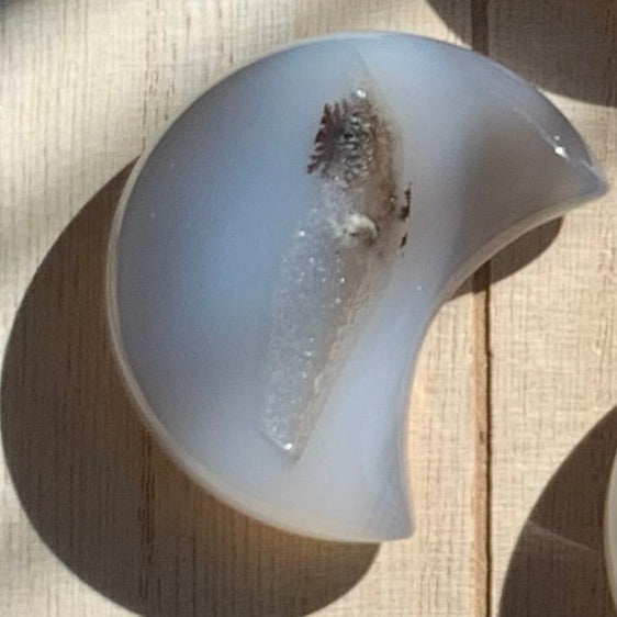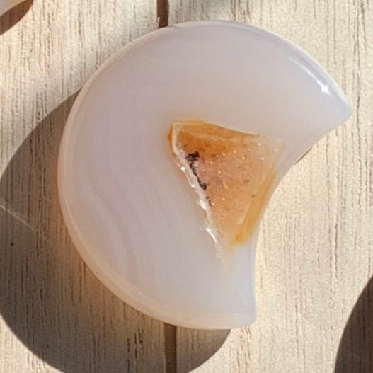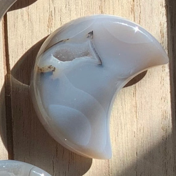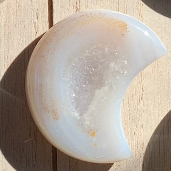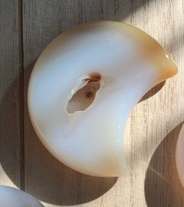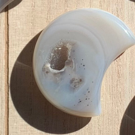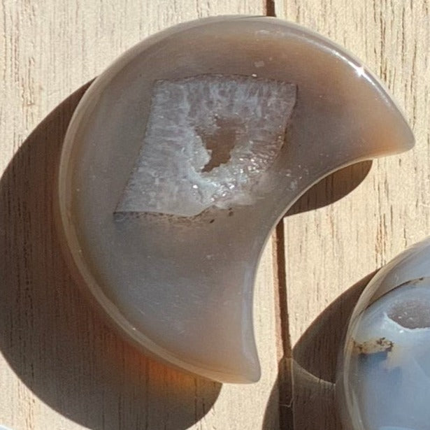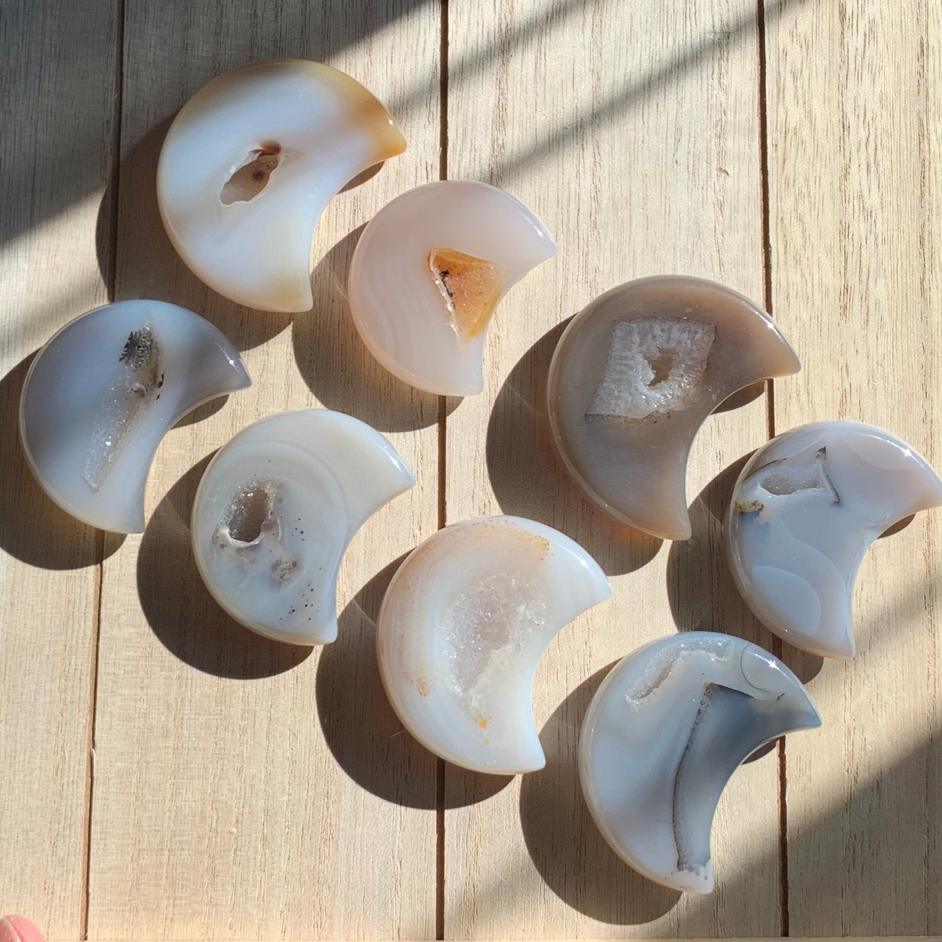 These sweet little moons are carved from a buttery agate, have sophisticated banding and have dainty little druzy pockets. They each fit in the palm of your hand. They are approx. 2"-2.5".