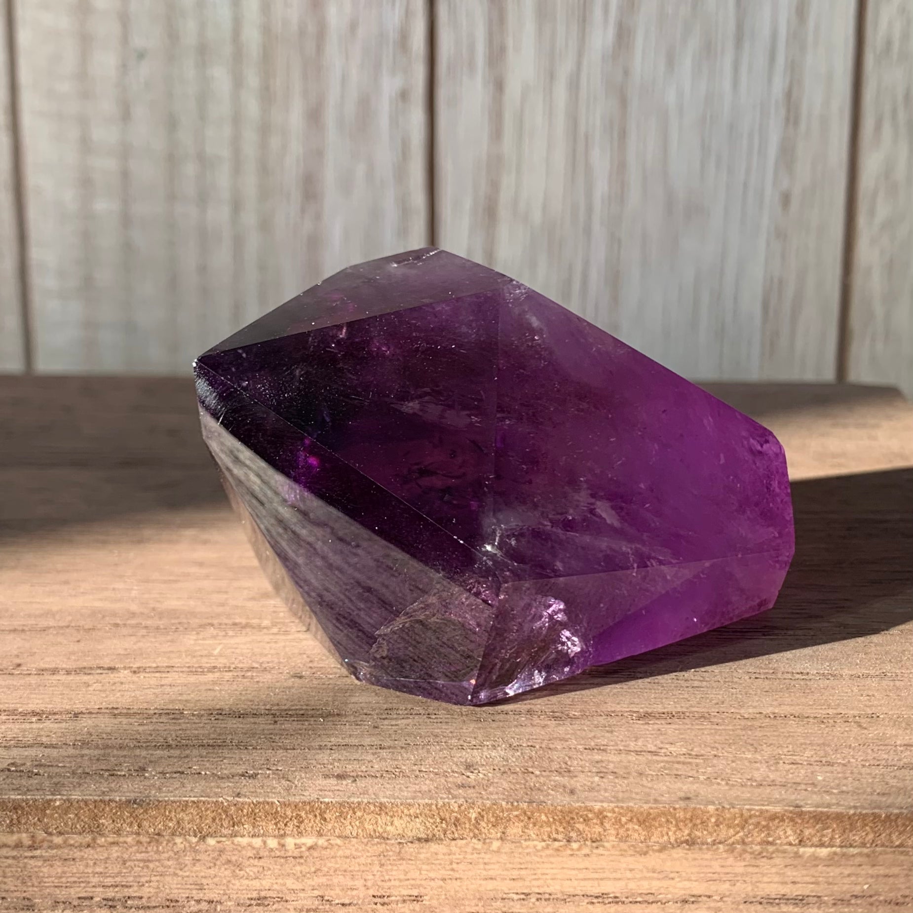 This gorgeous freeform/point is dark and has beautiful phantoms. There are also golden smoky hues that could possibly be citrine.