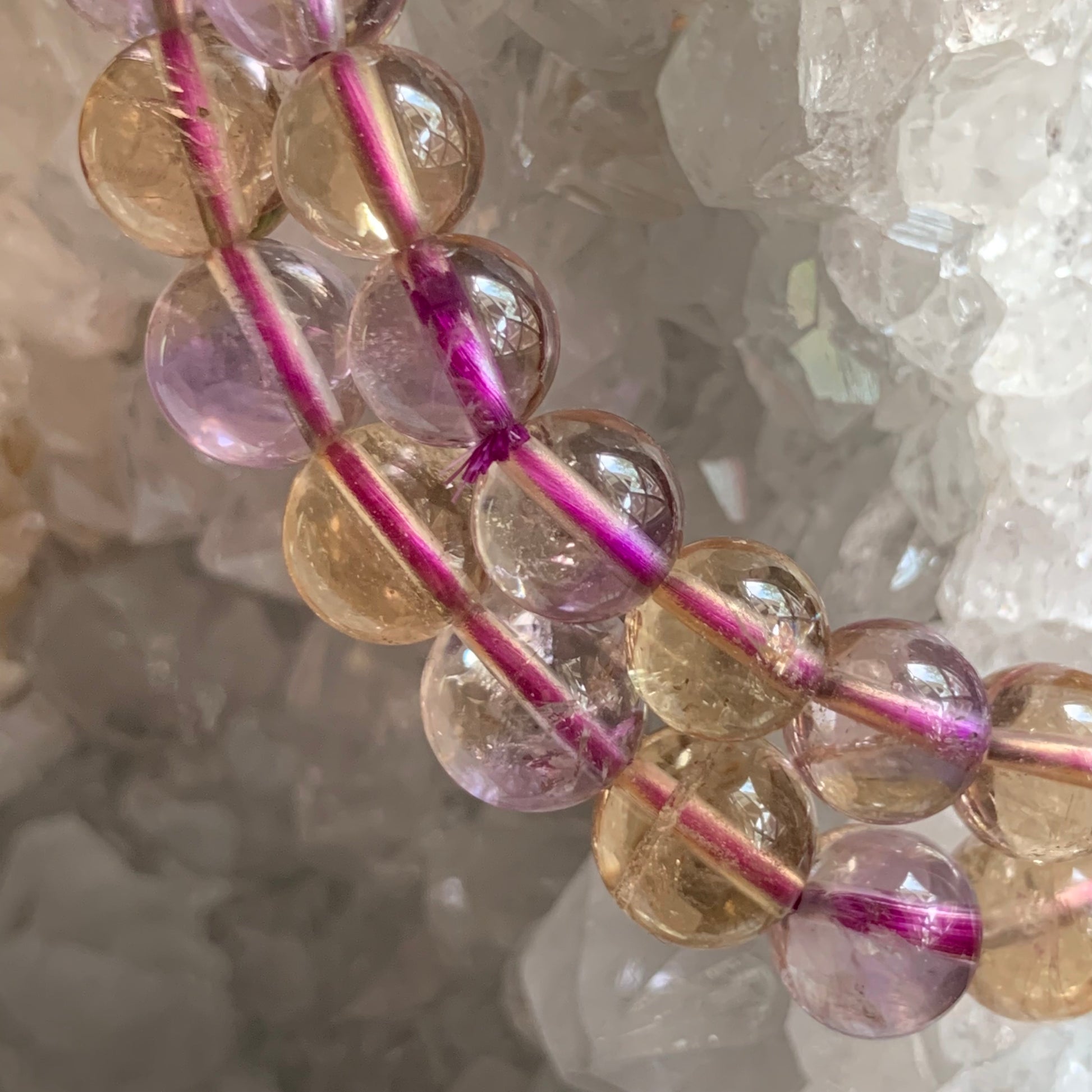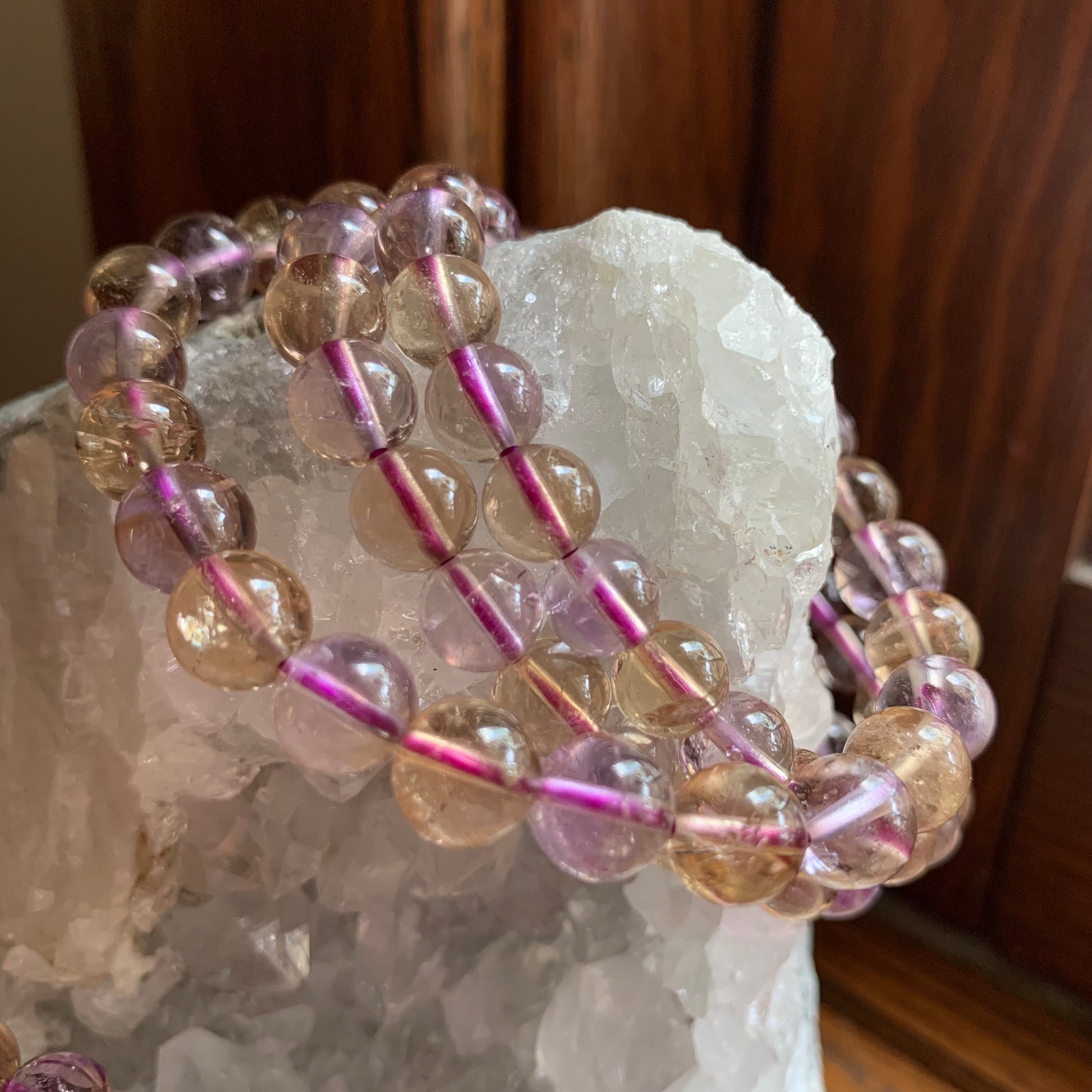 Check out these high quality Ametrine Bracelets. Each bead is made of high quality Ametrine. Since this is a natural mineral, not all beads are uniform. Some beads may havbe more purple and some may look more yellow. These are 7-8 mm bead and 7".