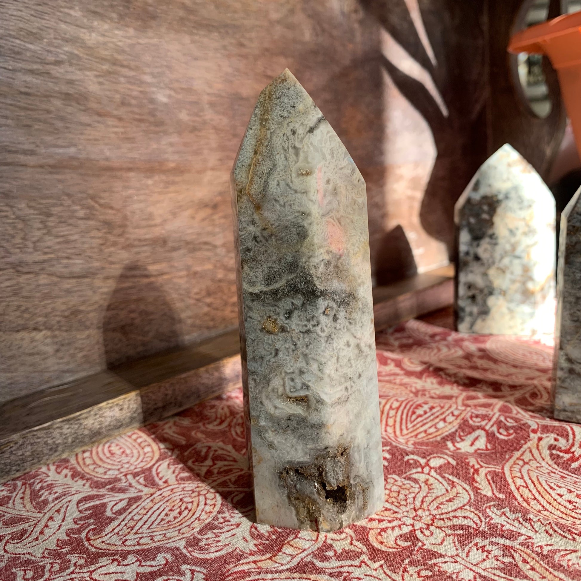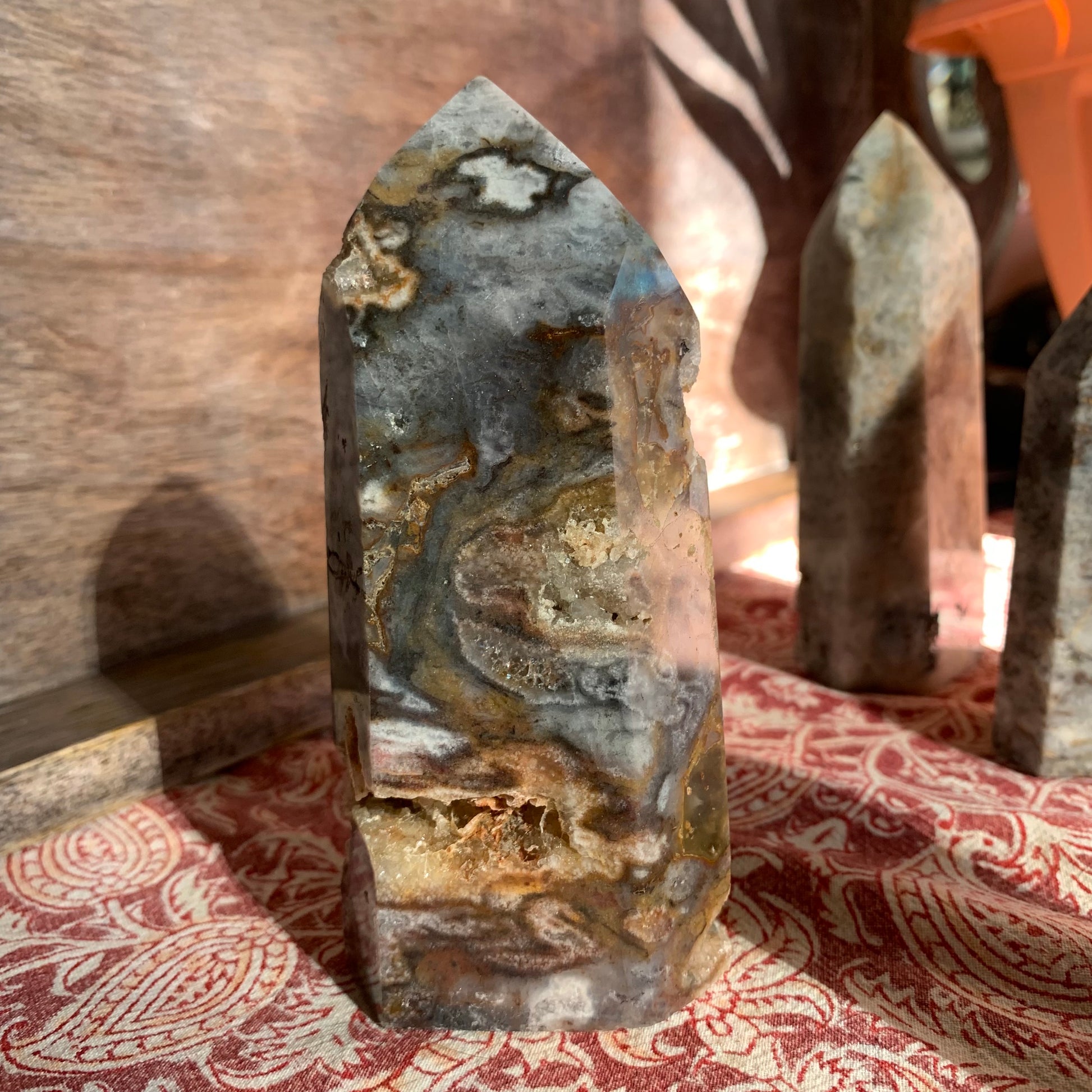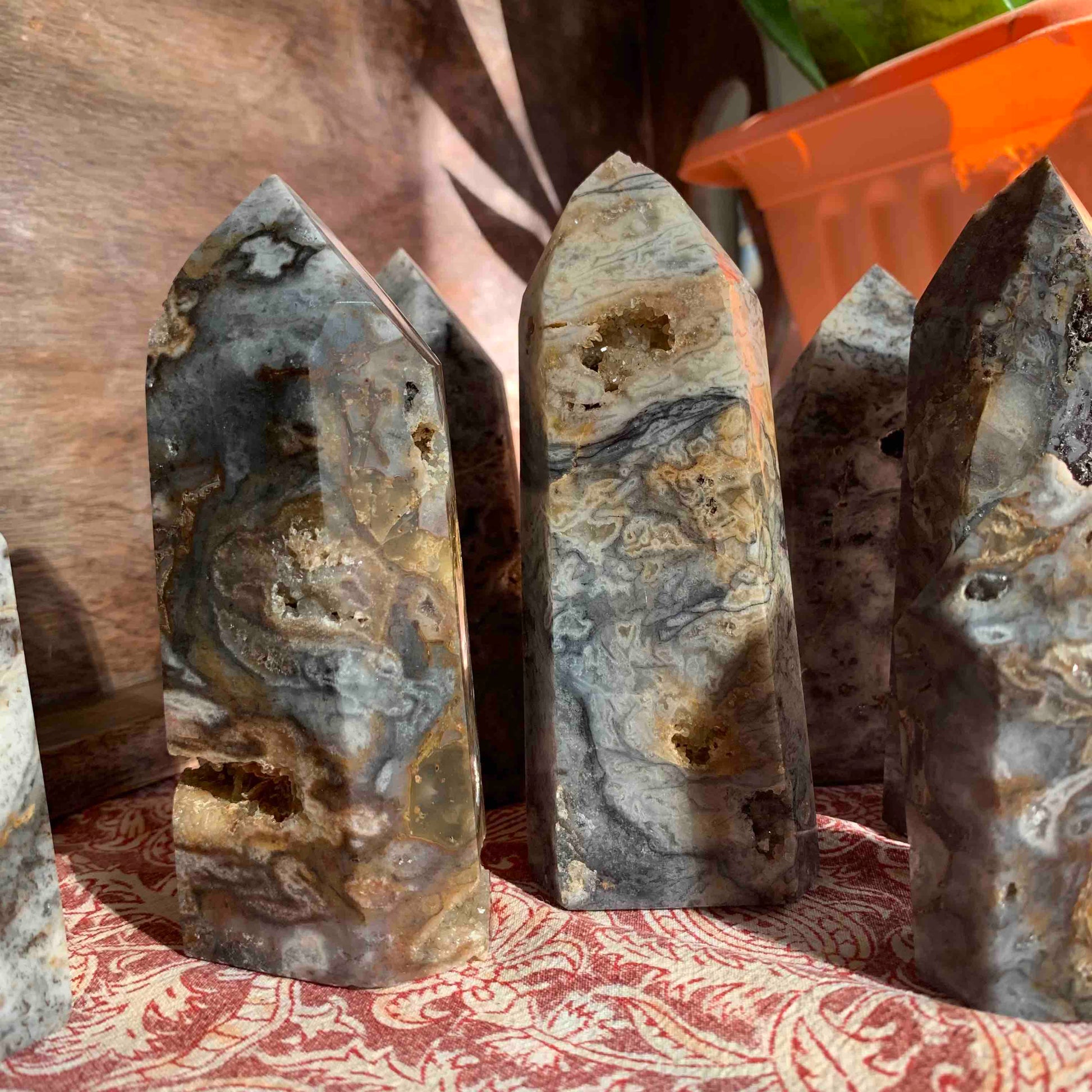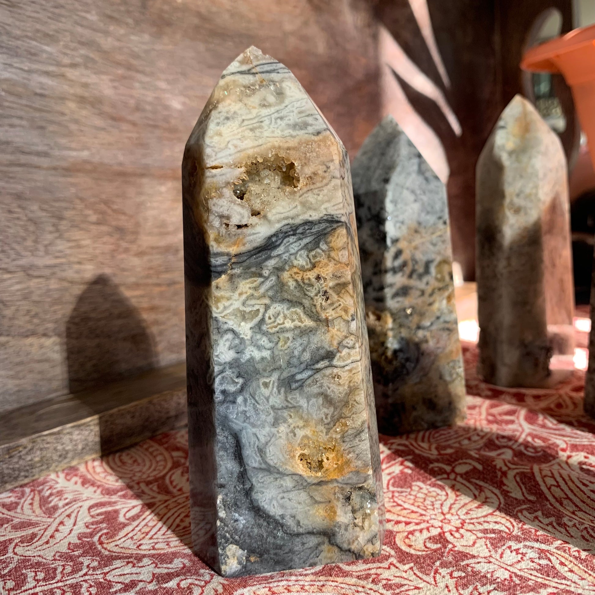 Brazil produces some of the most amazing and interesting pieces. These towers have the most interesting patterns of Crazy Lace and Druzy pockets. We are in love!