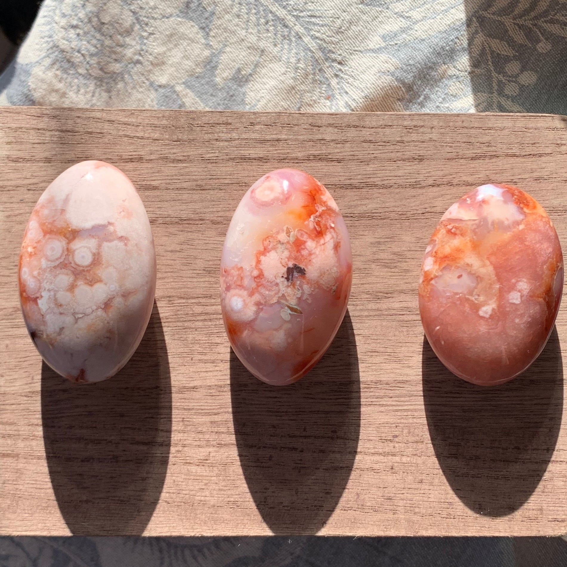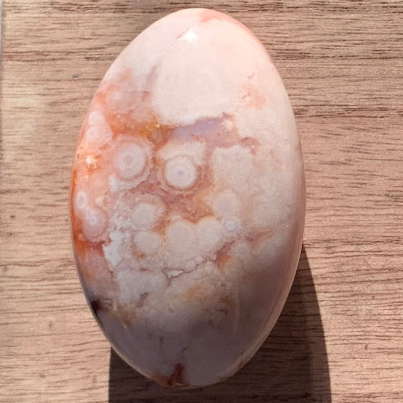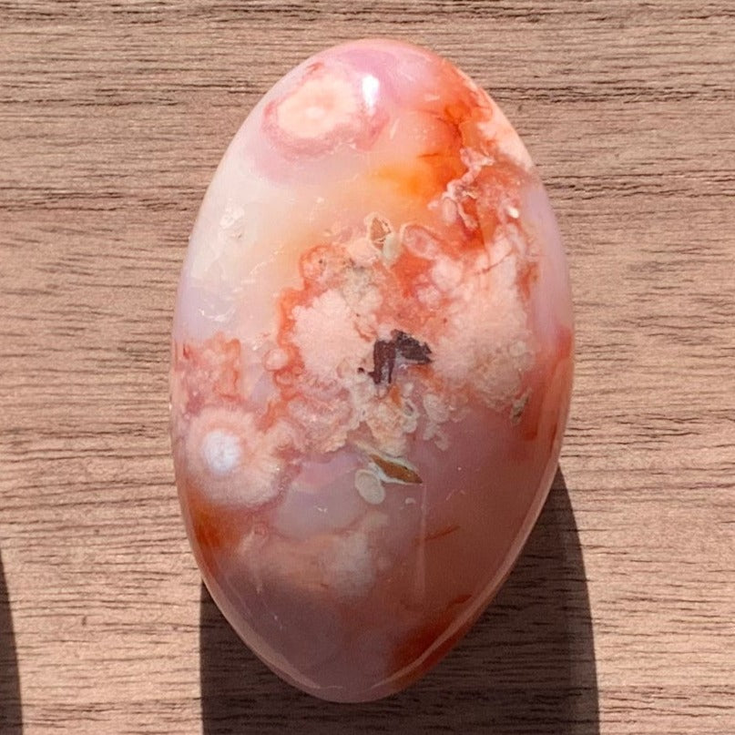 These gorgeous Carnelian Flower Agate Palm Stones are the perfect size. Not too large, not too chonky. Each has gorgeous plumes and beautiful pink and red coloring.