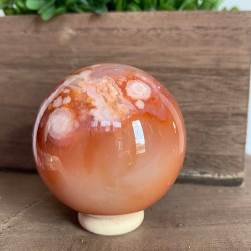 This Carnelian Flower Agate Sphere is dark and juicy tomato red with flowers that have defined centers. Her base is very silky and rich with larger amounts of base color vs. flowers. 52mm