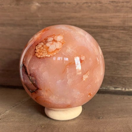 This Carnelian Flower Agate Sphere is milky and rich with larger amounts of base color and banded agate, with a slight amount of white dotting and plumes. 51mm
