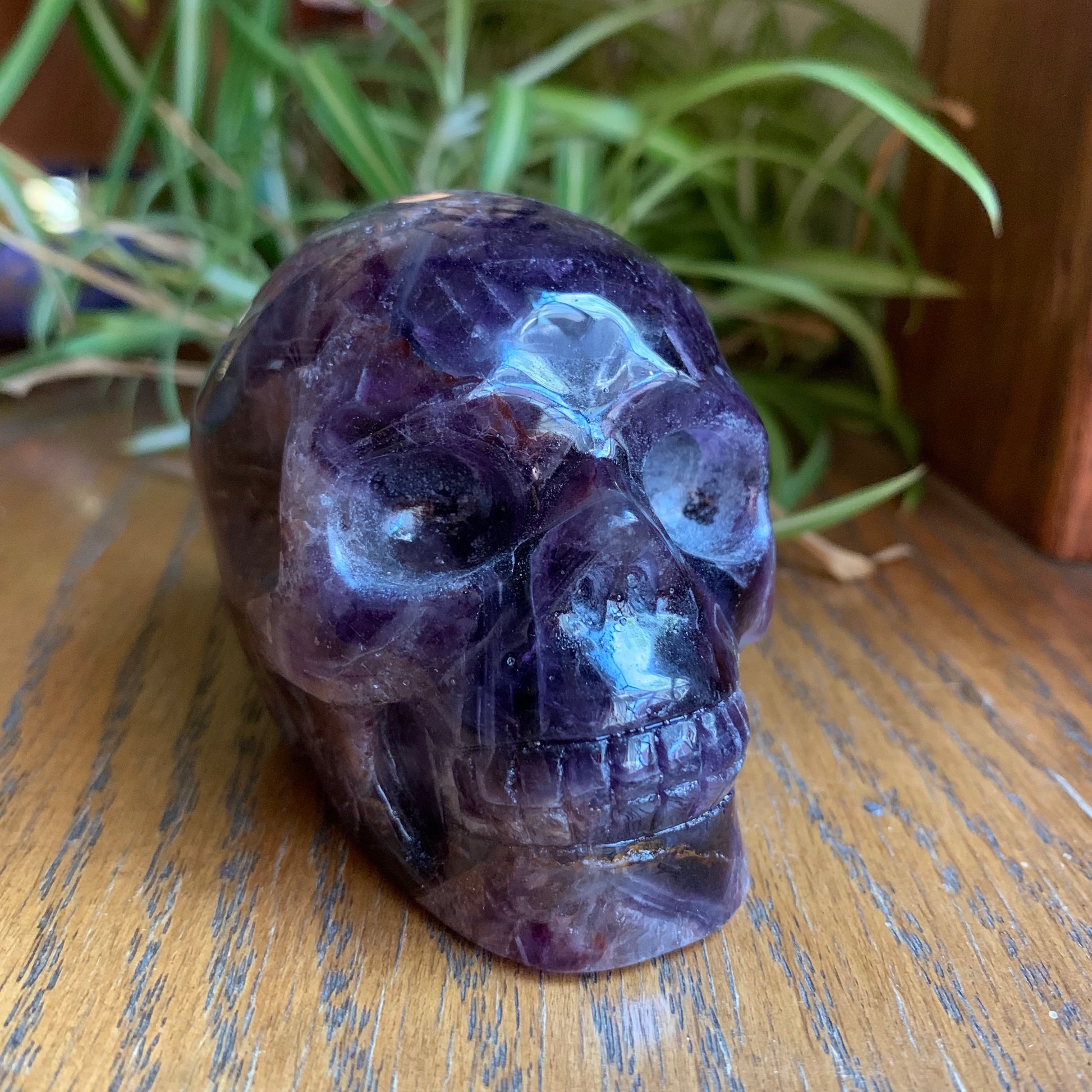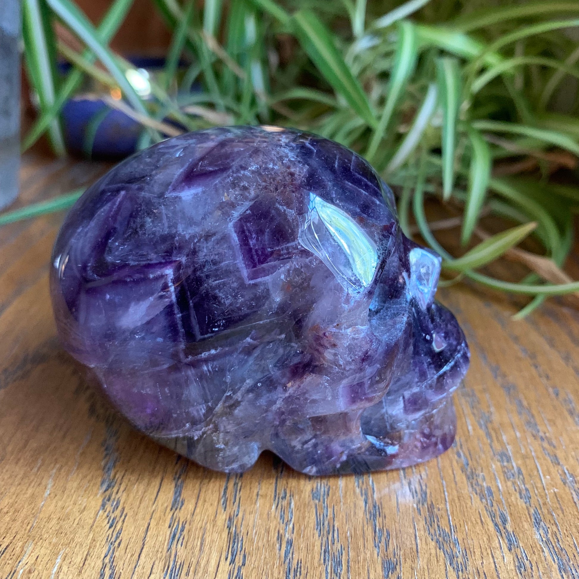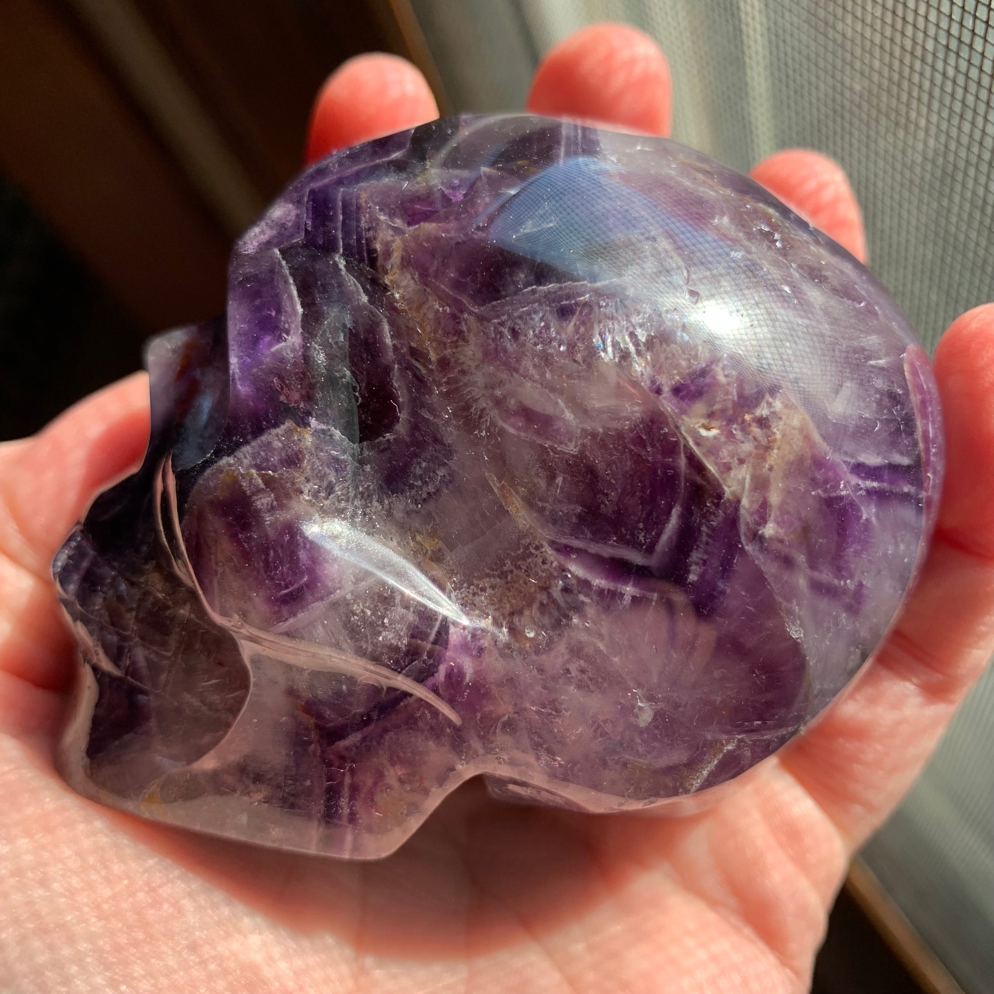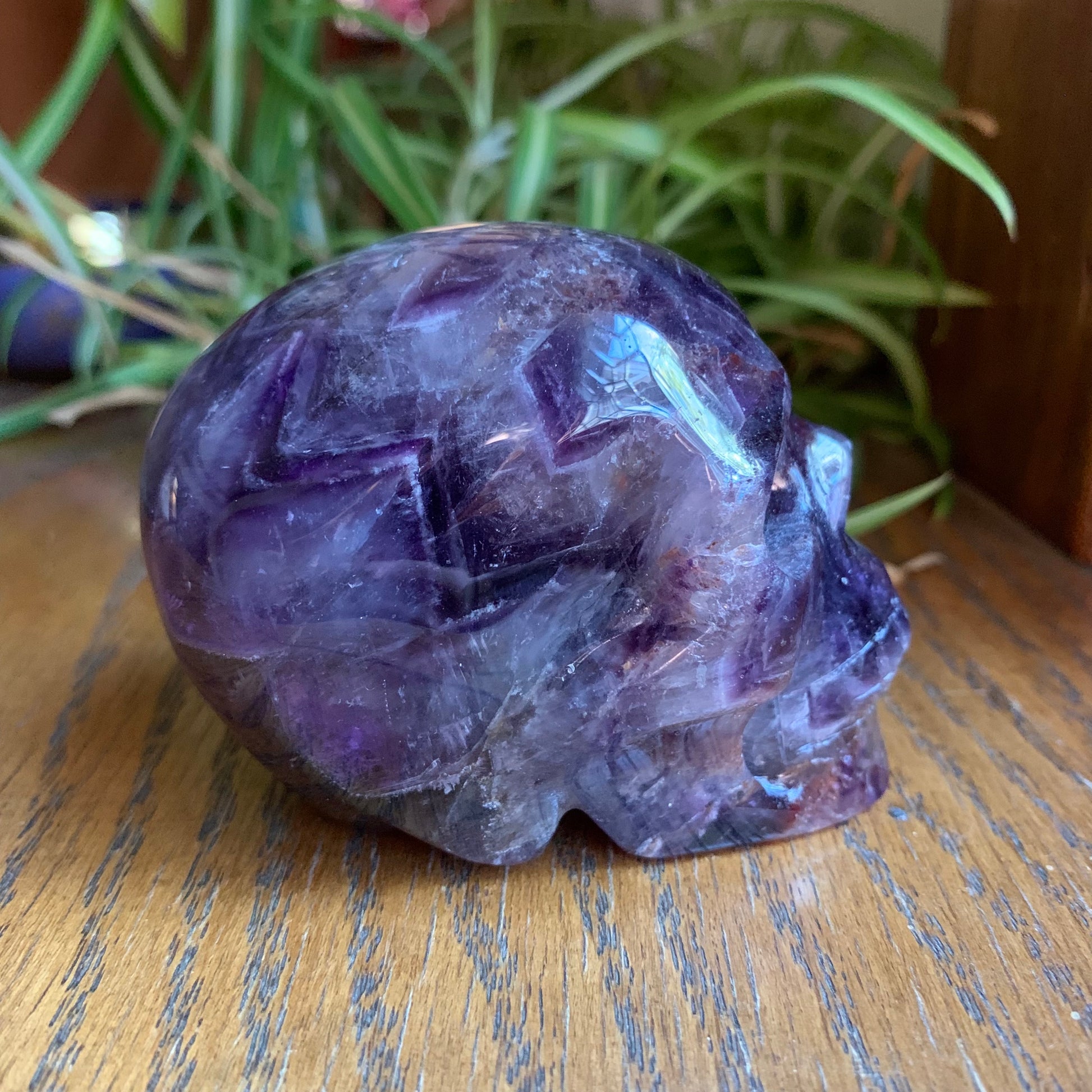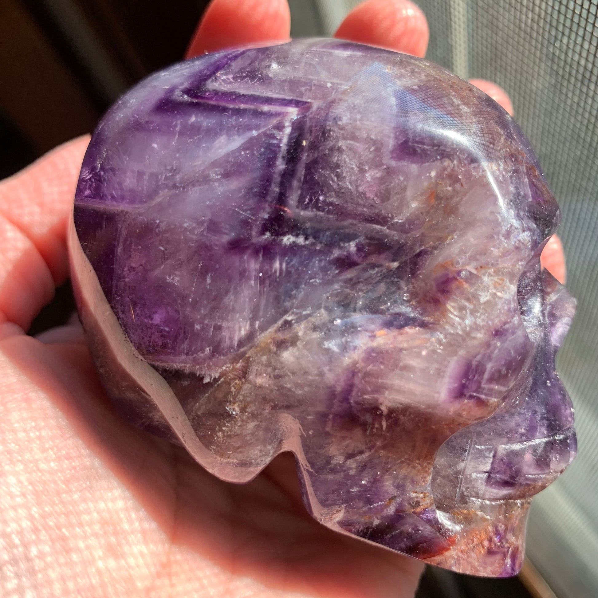 The definition on this Chevron Amethyst Skull is so gorgeous. It has amazing rainbows, some smoky quartz and some hematoid inclusions.