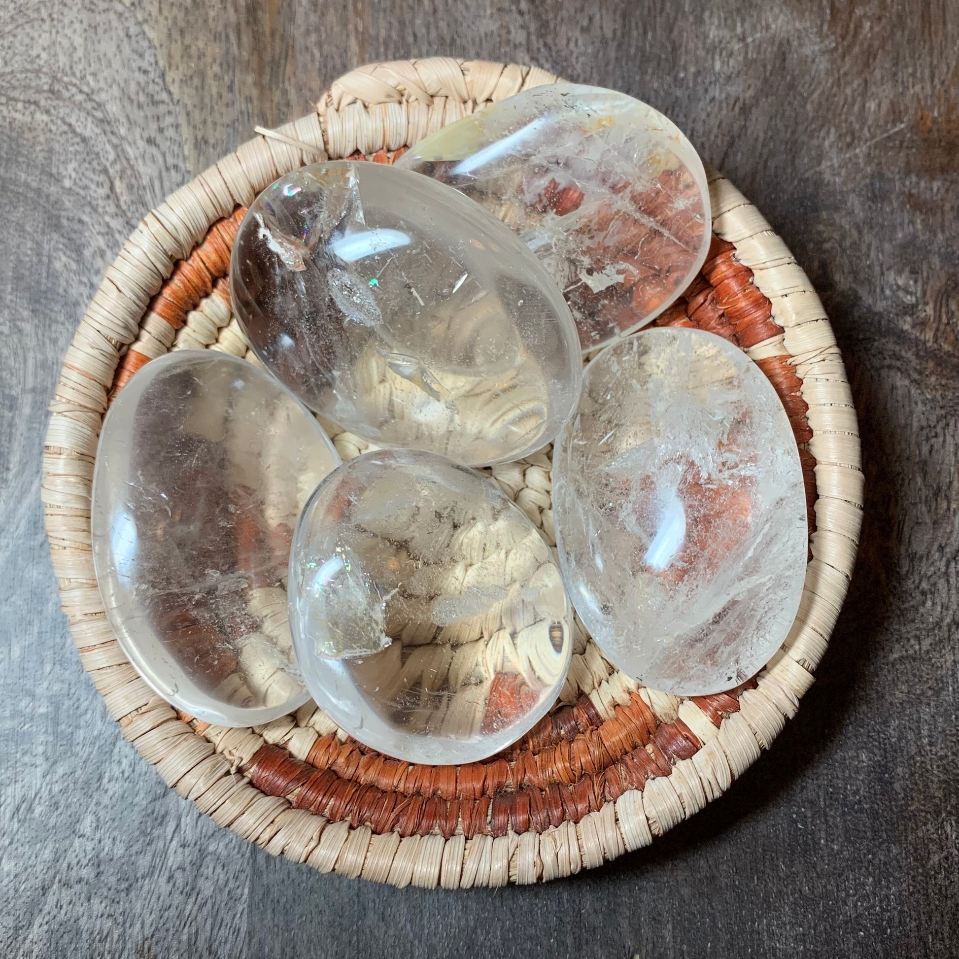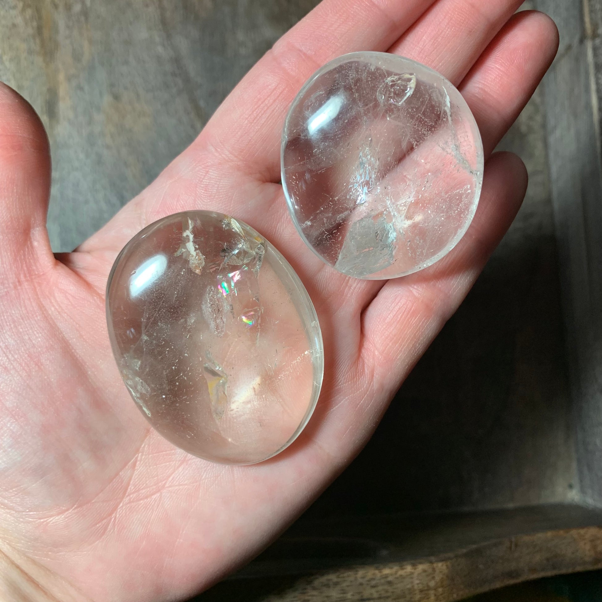 Check out the clarity and rainbows on these Clear Quartz Palmstones! Some have golden healer streaks. They come in two sizes, small and large. They will be intuitively chosen.