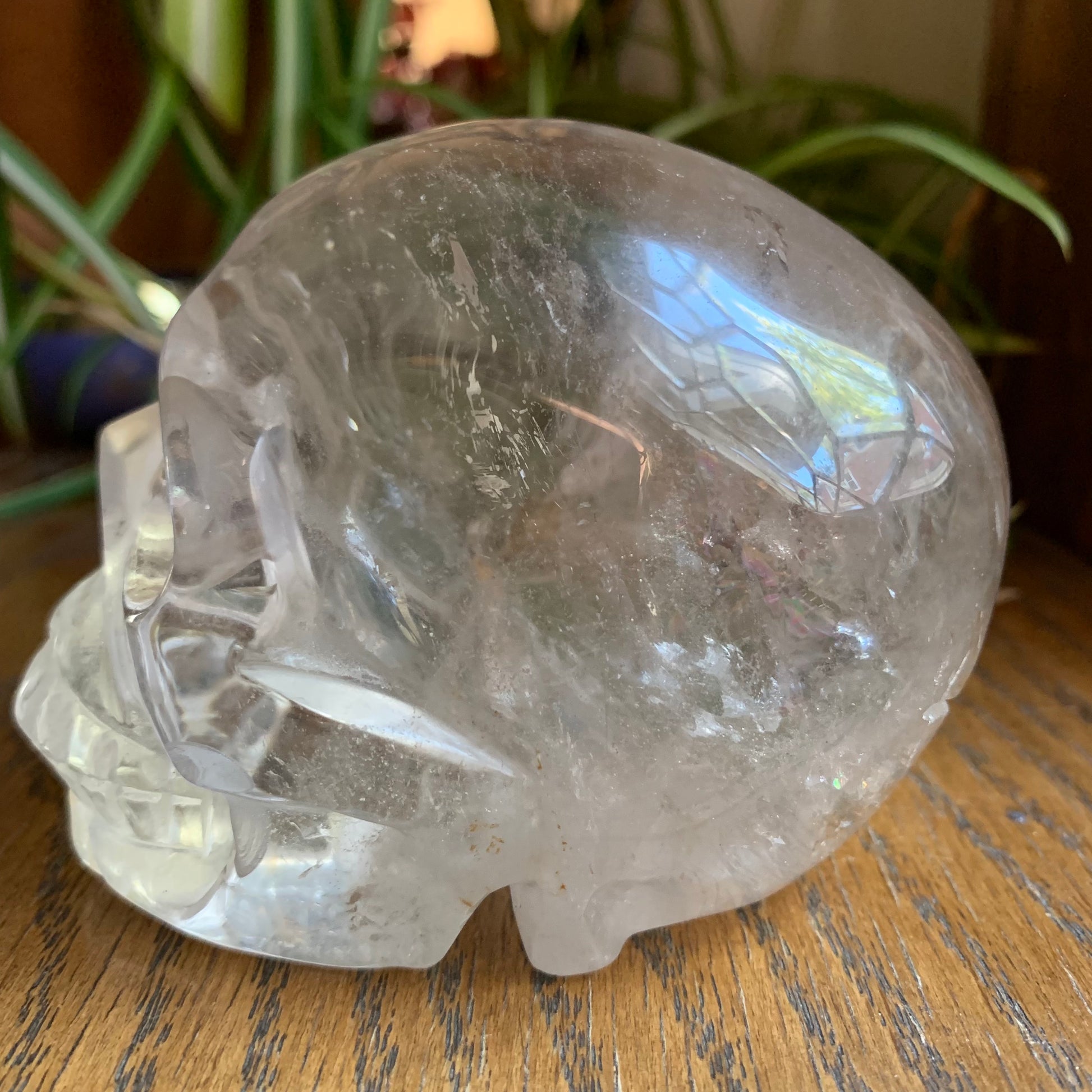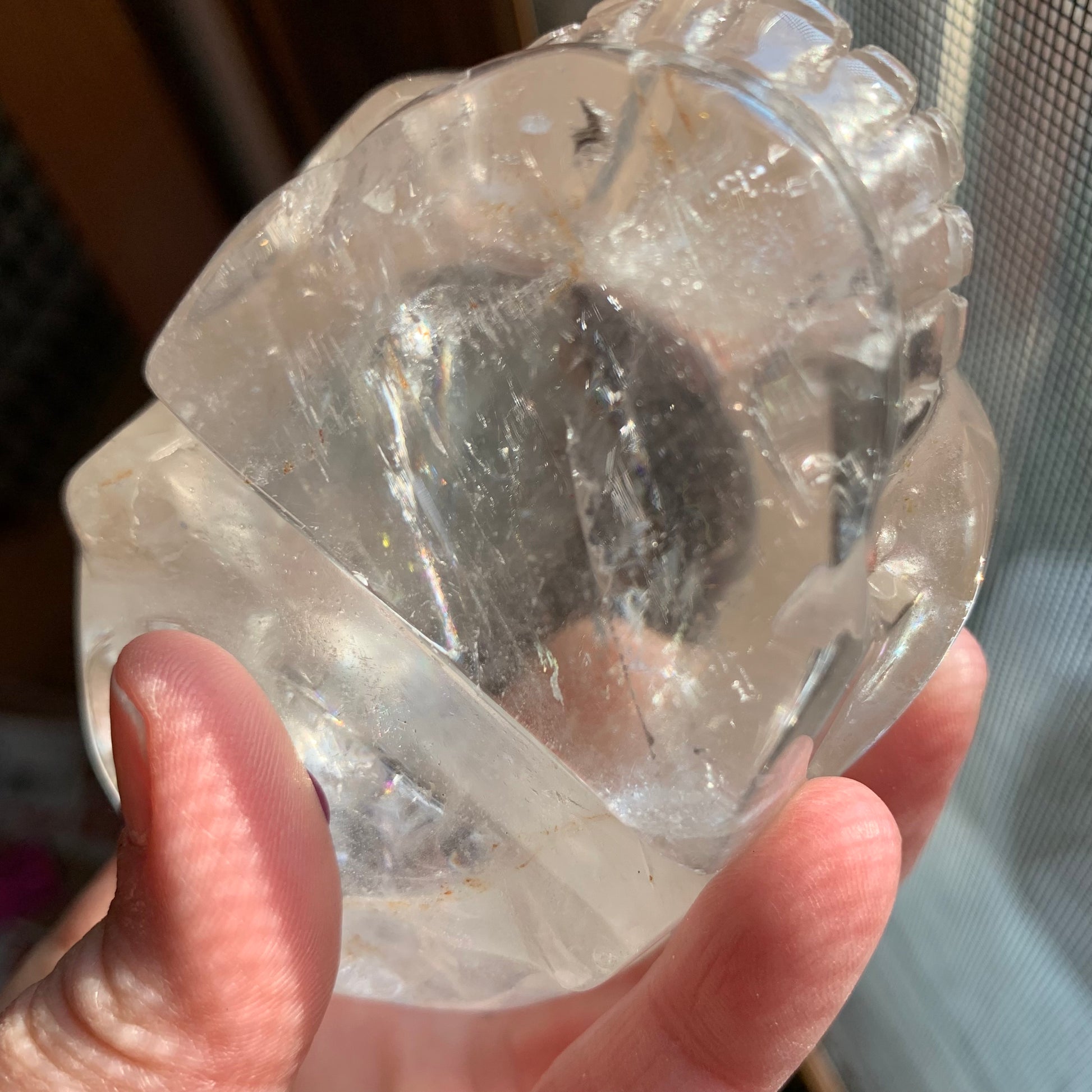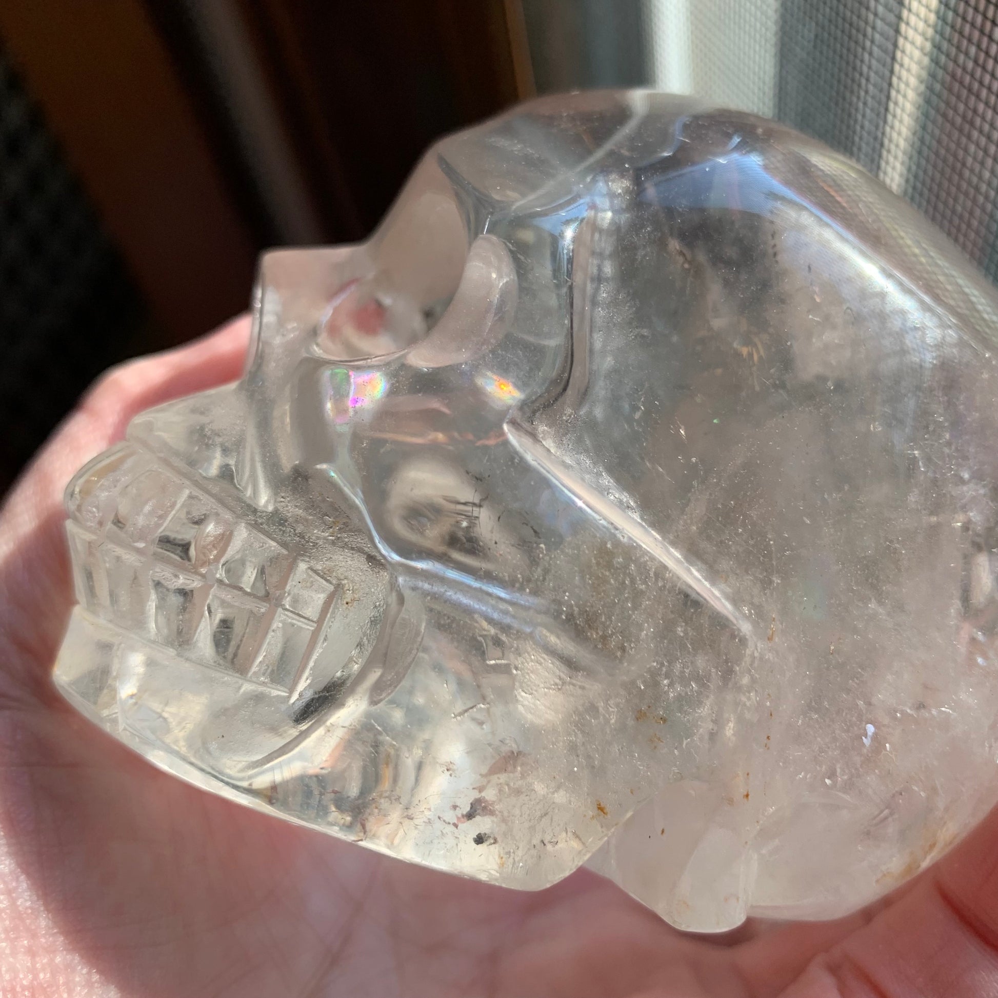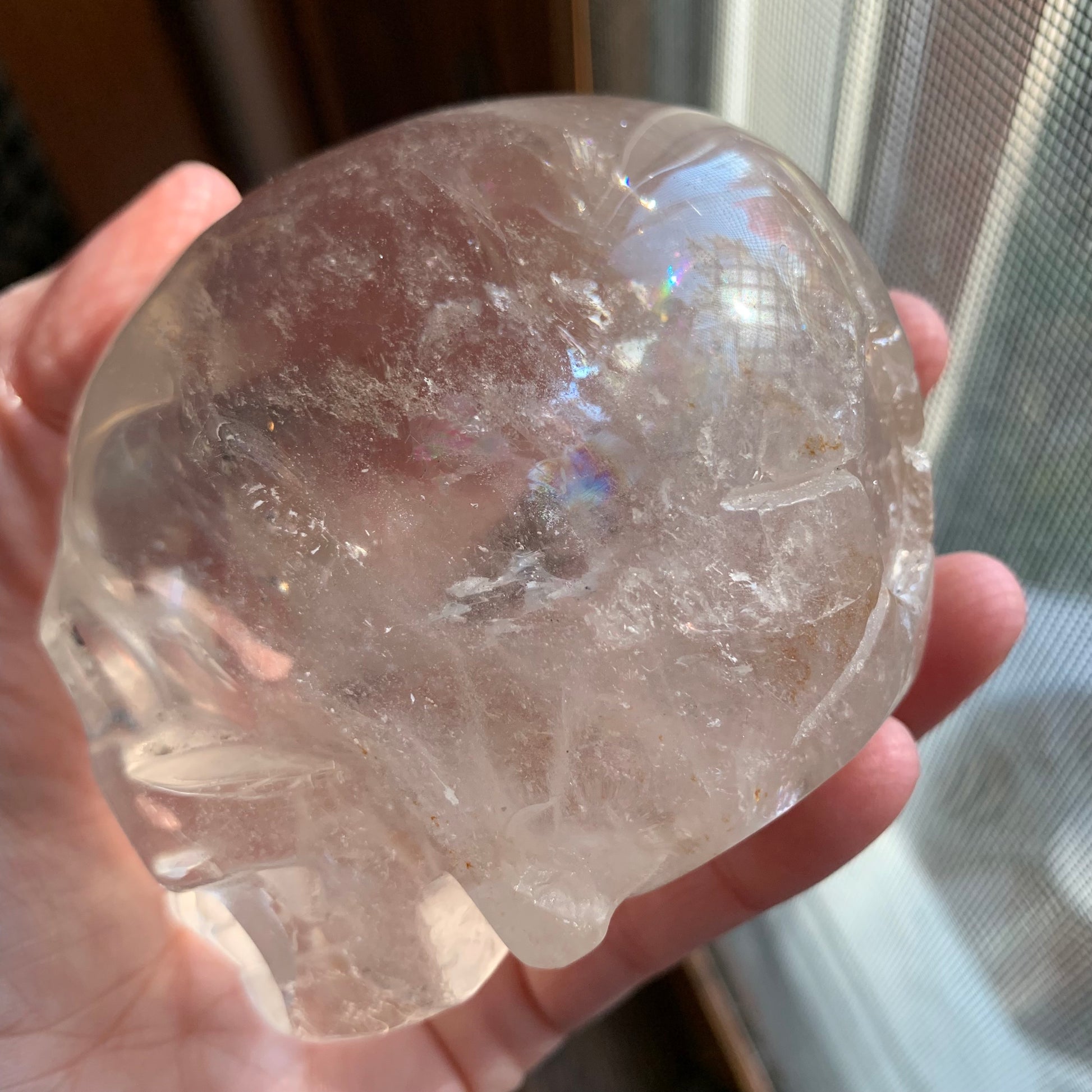 This Clear Quartz Skull is beautifully clear, has many rainbows and iron inclusions.