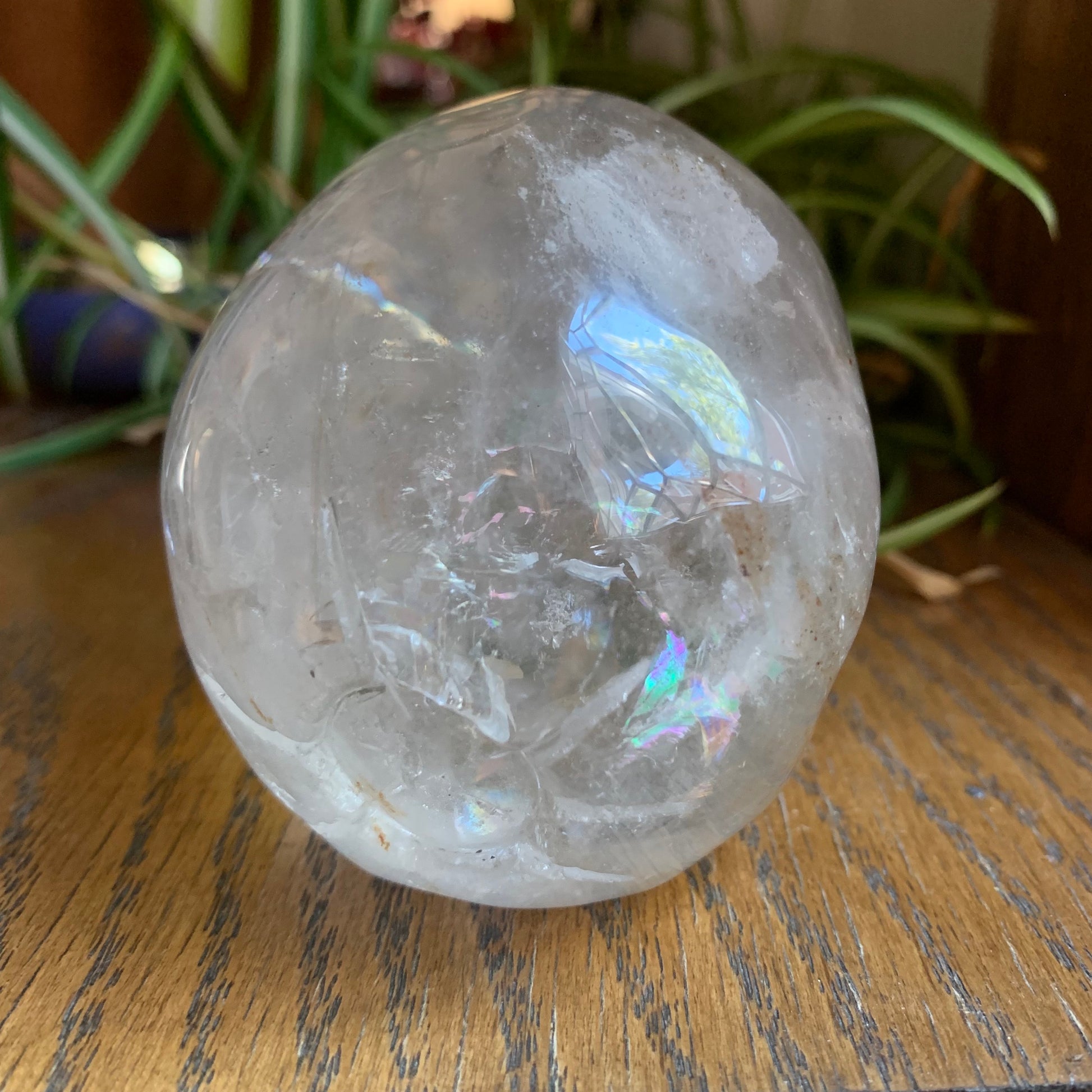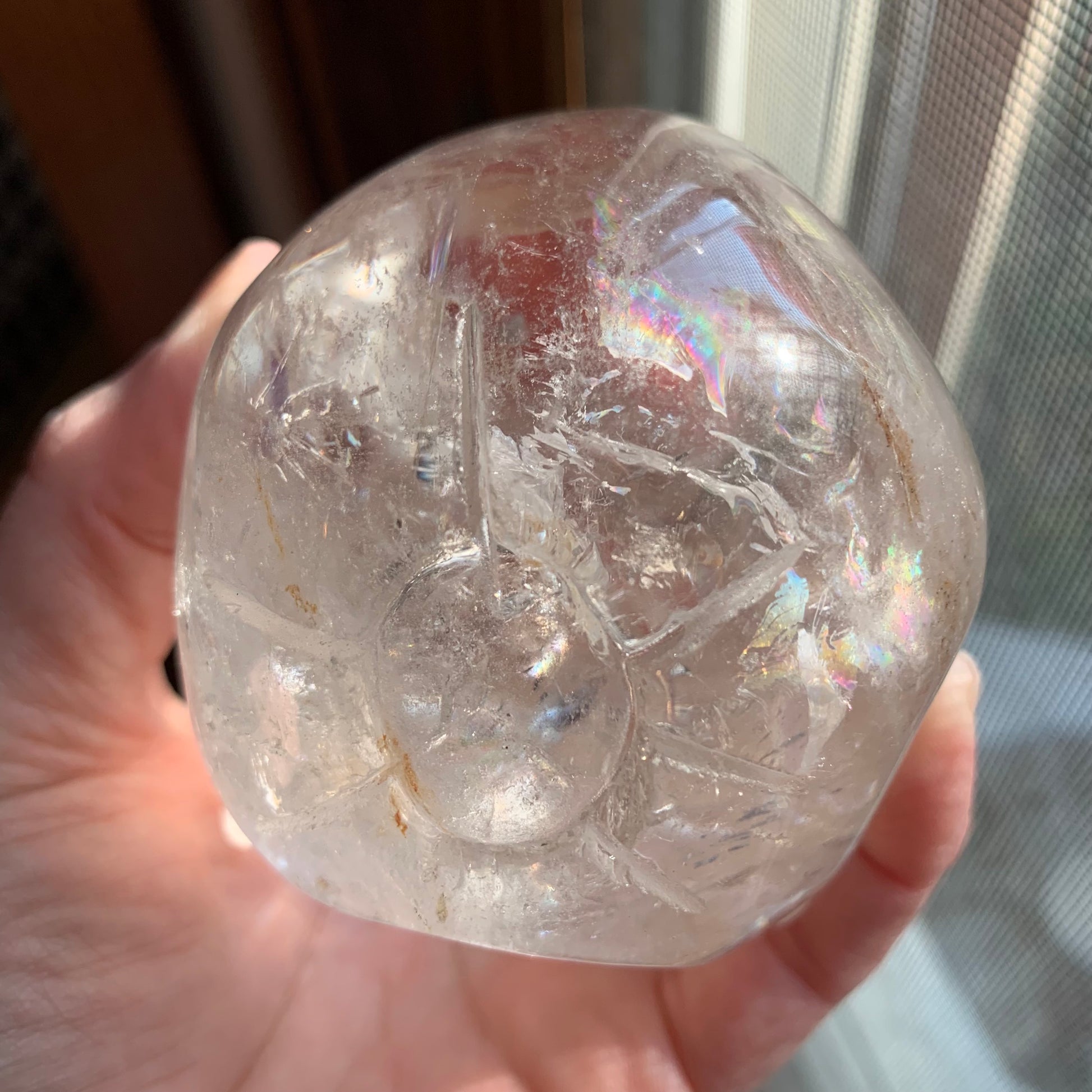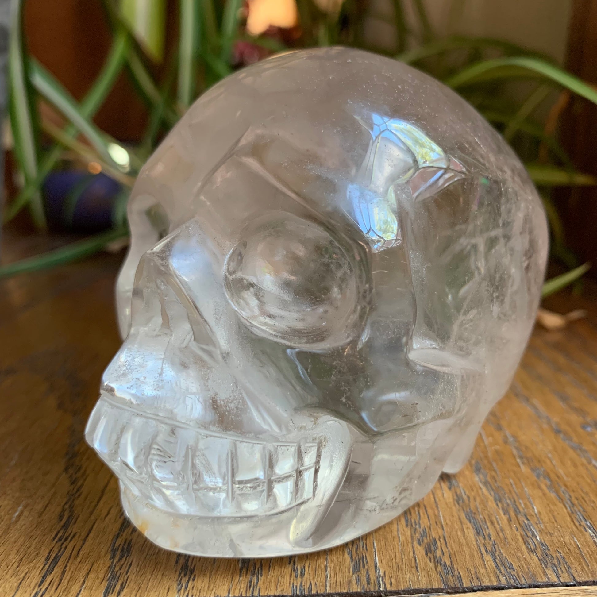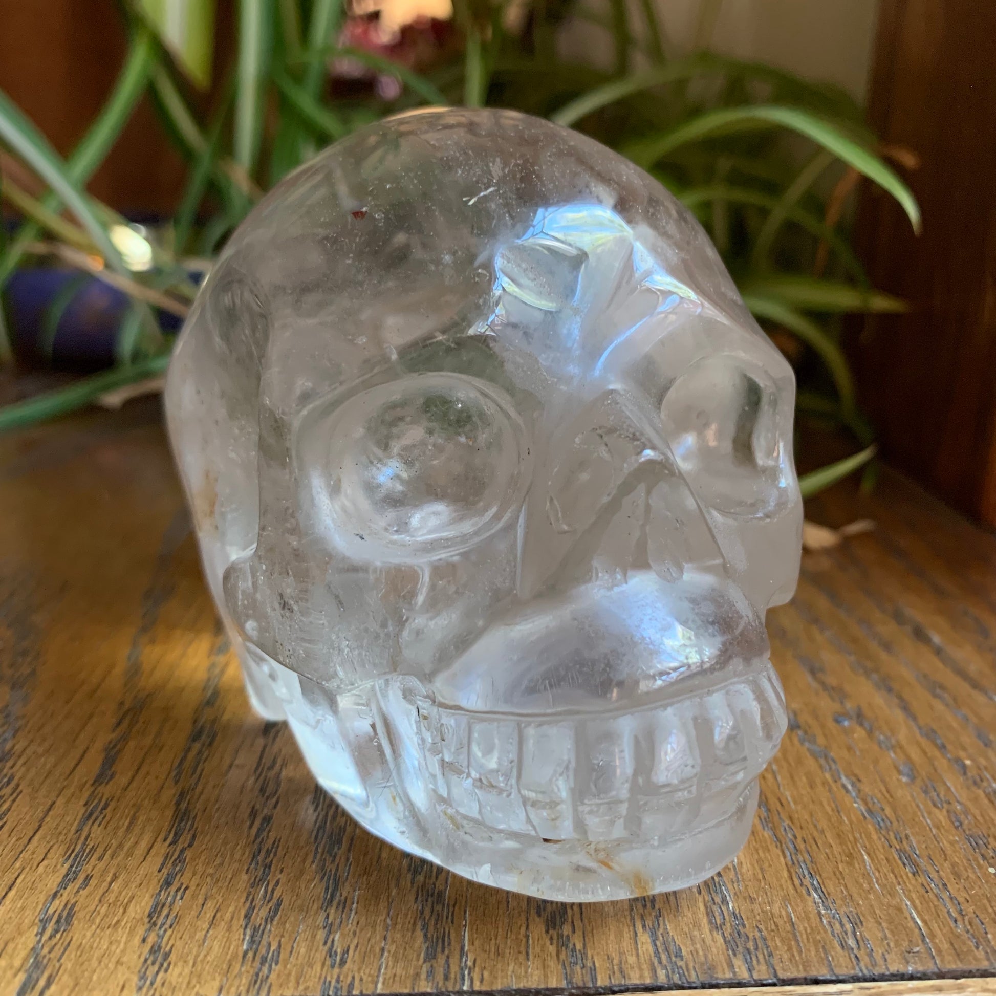 This Clear Quartz Skull is beautifully clear, has many rainbows and iron inclusions.