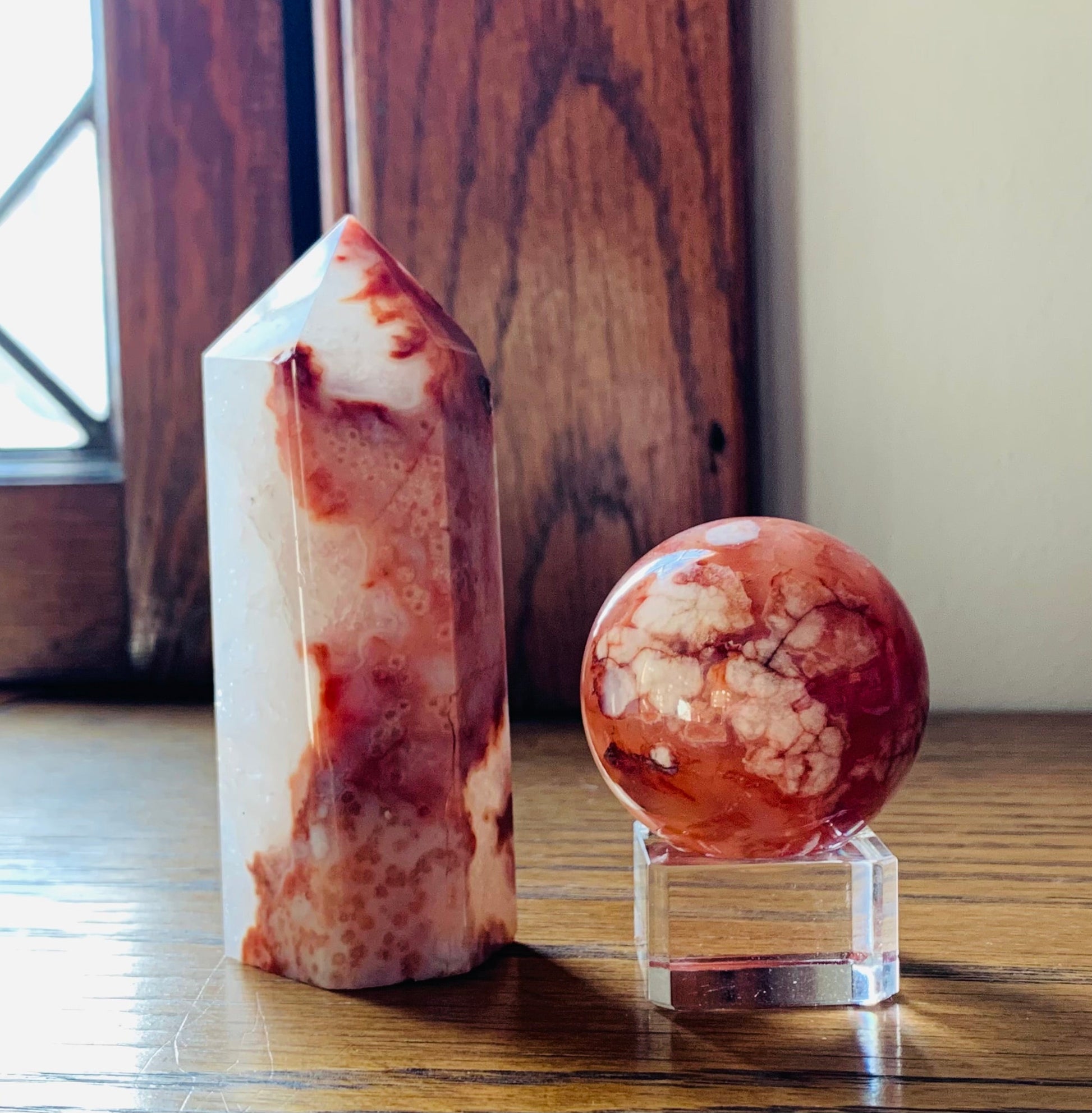 Ruby Carnelian Flower Agate Sphere + Tower Set