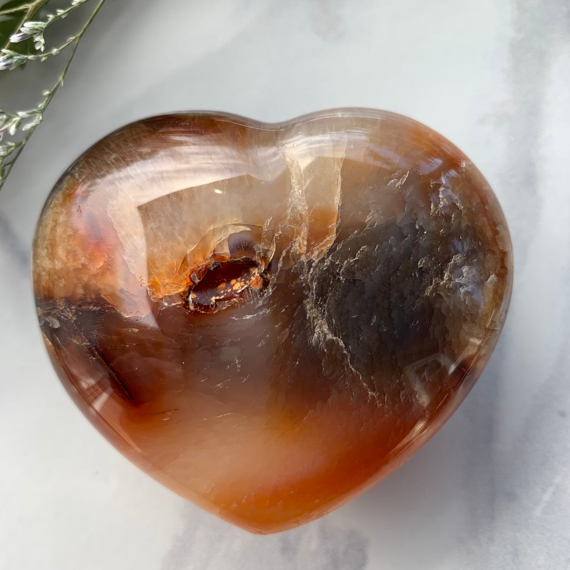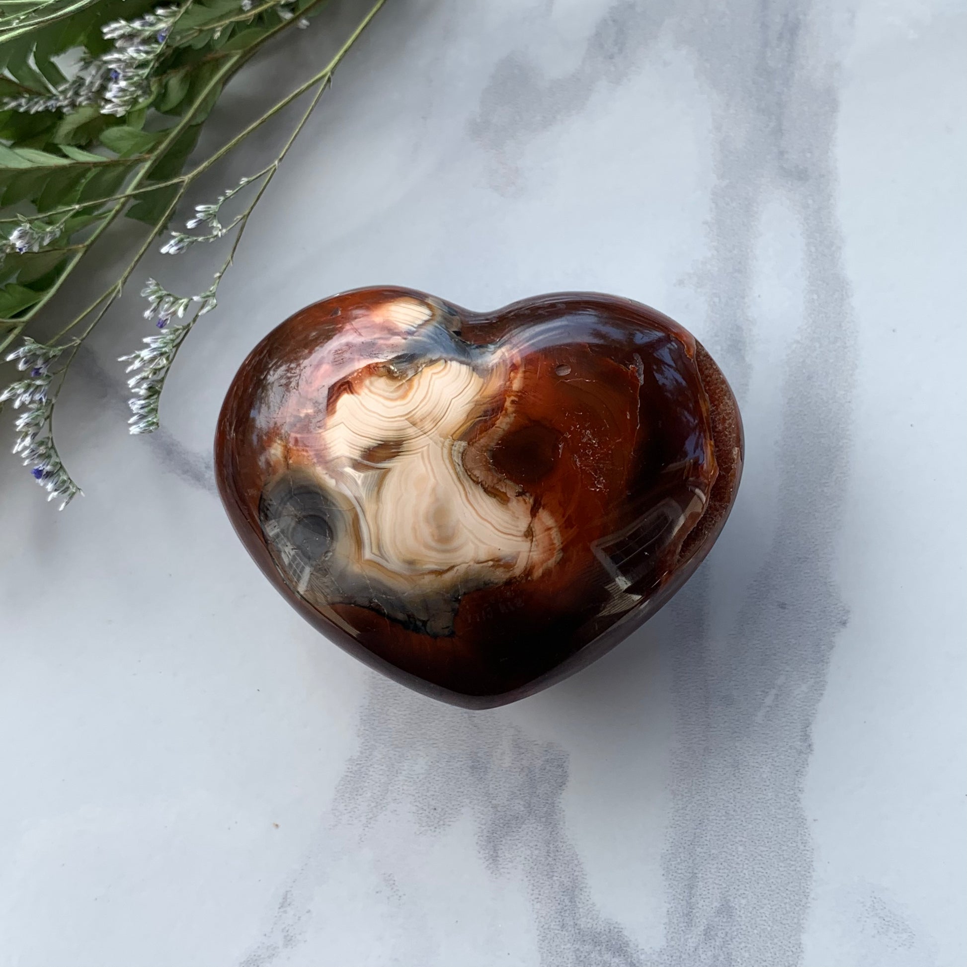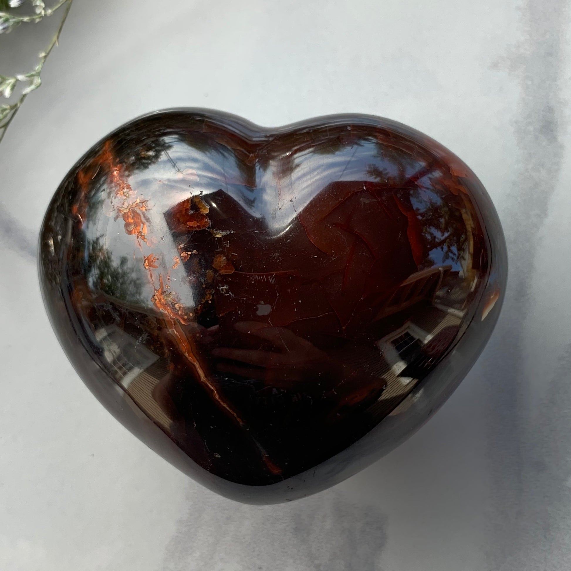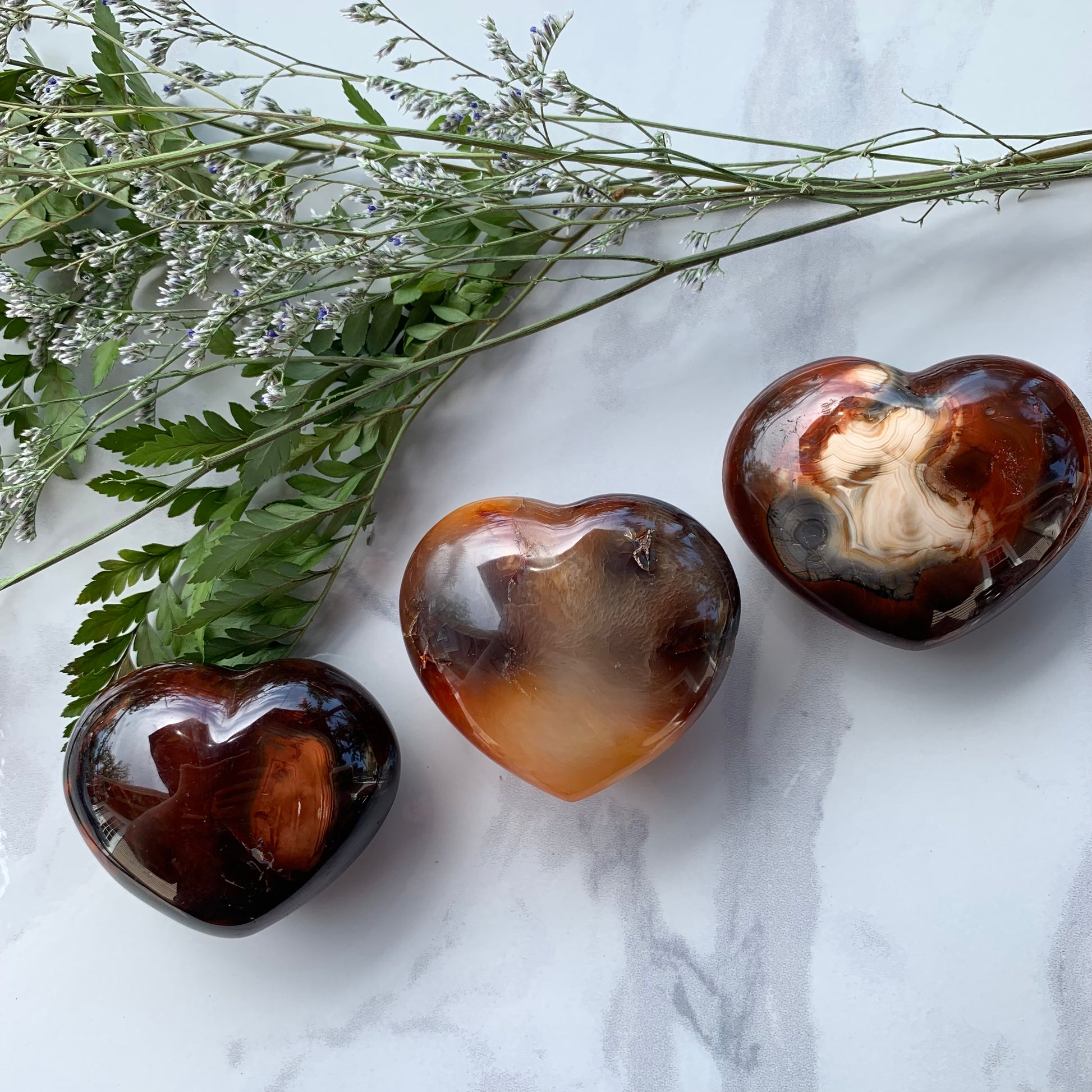 These deeply colored carnelian hearts are so rich in color. Each one has gorgeously patterned deep dark black-toned reds and are very sophisticated.