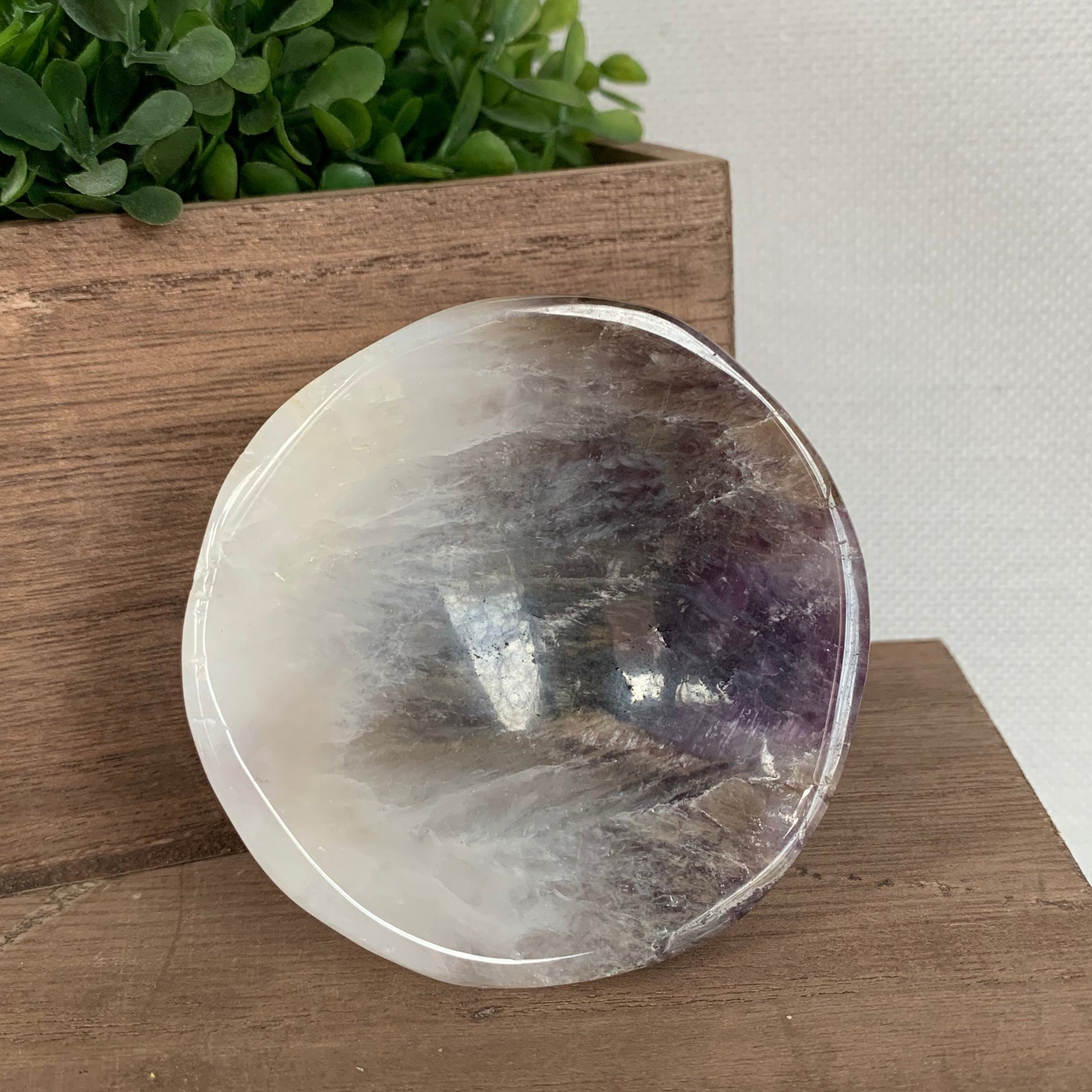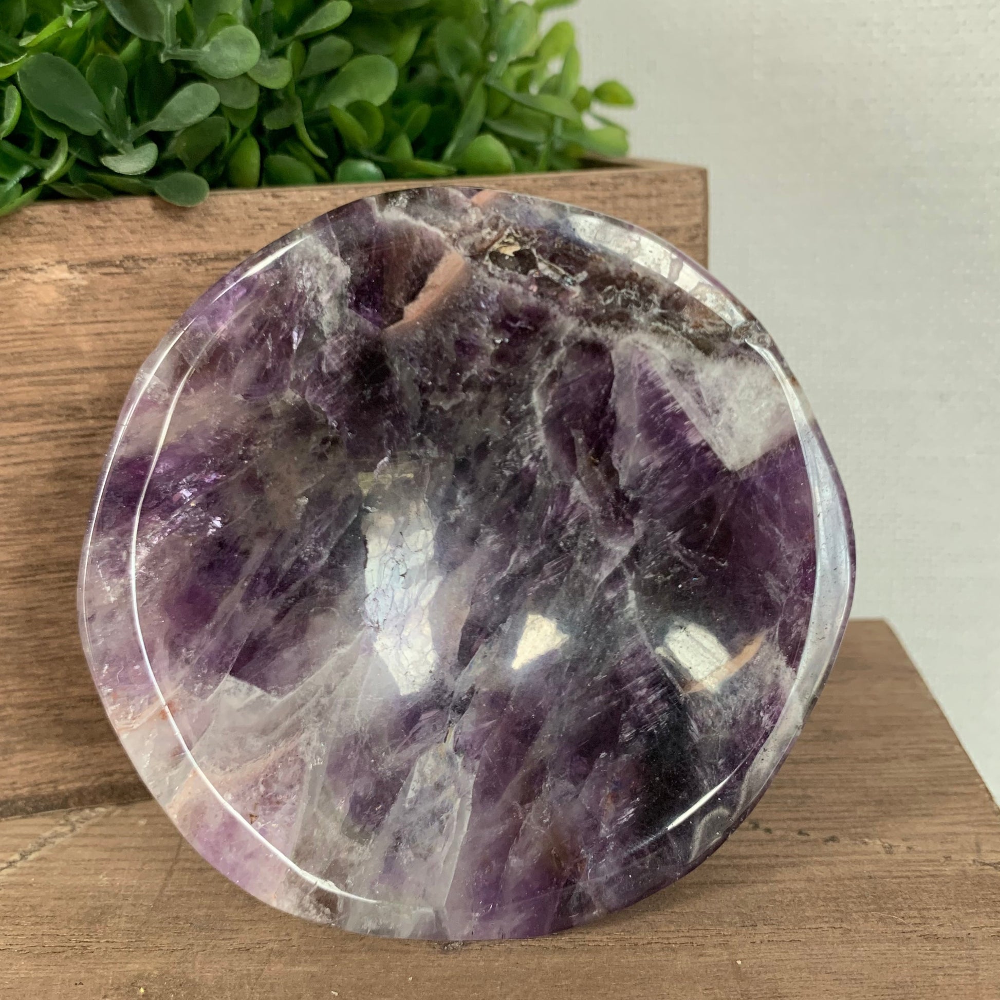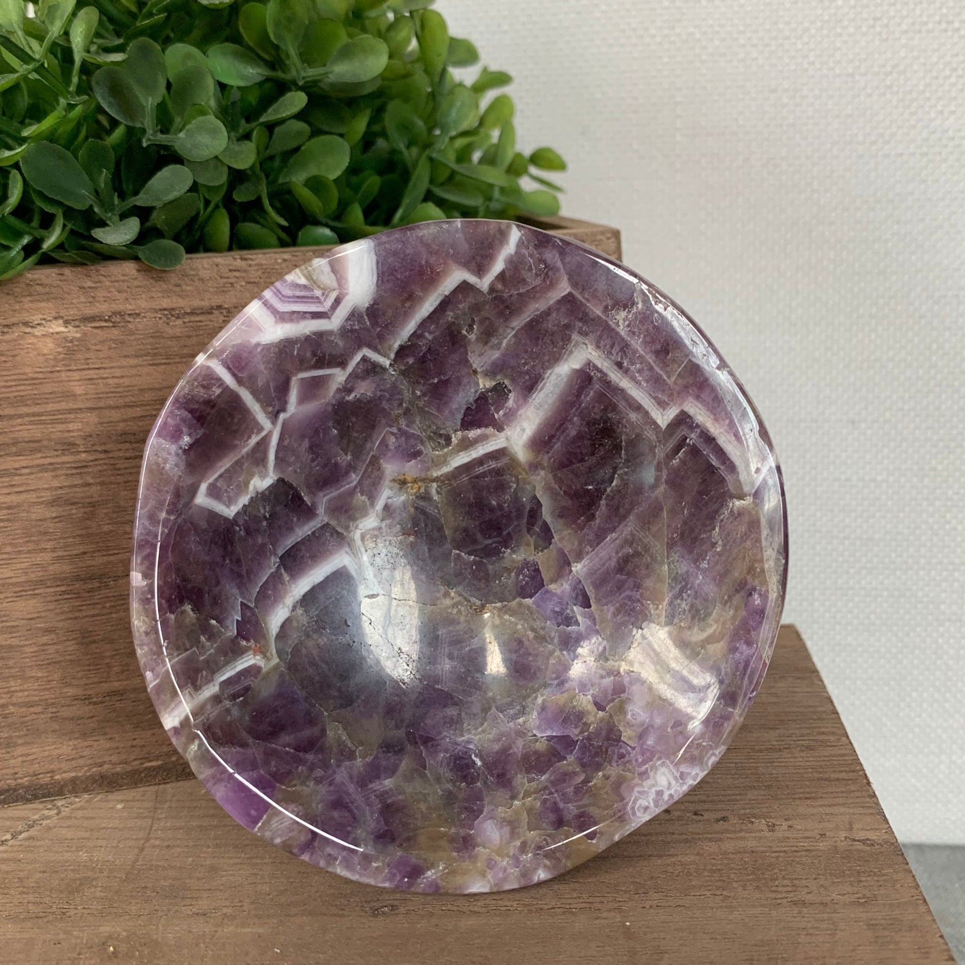 Dream Amethyst Bowls are beautiful on their own, you may not want to use them for anything! They each have unique patterning and some have clear spots and smoky bits and rainbows. They range in size from 3" - 3.5" wide.