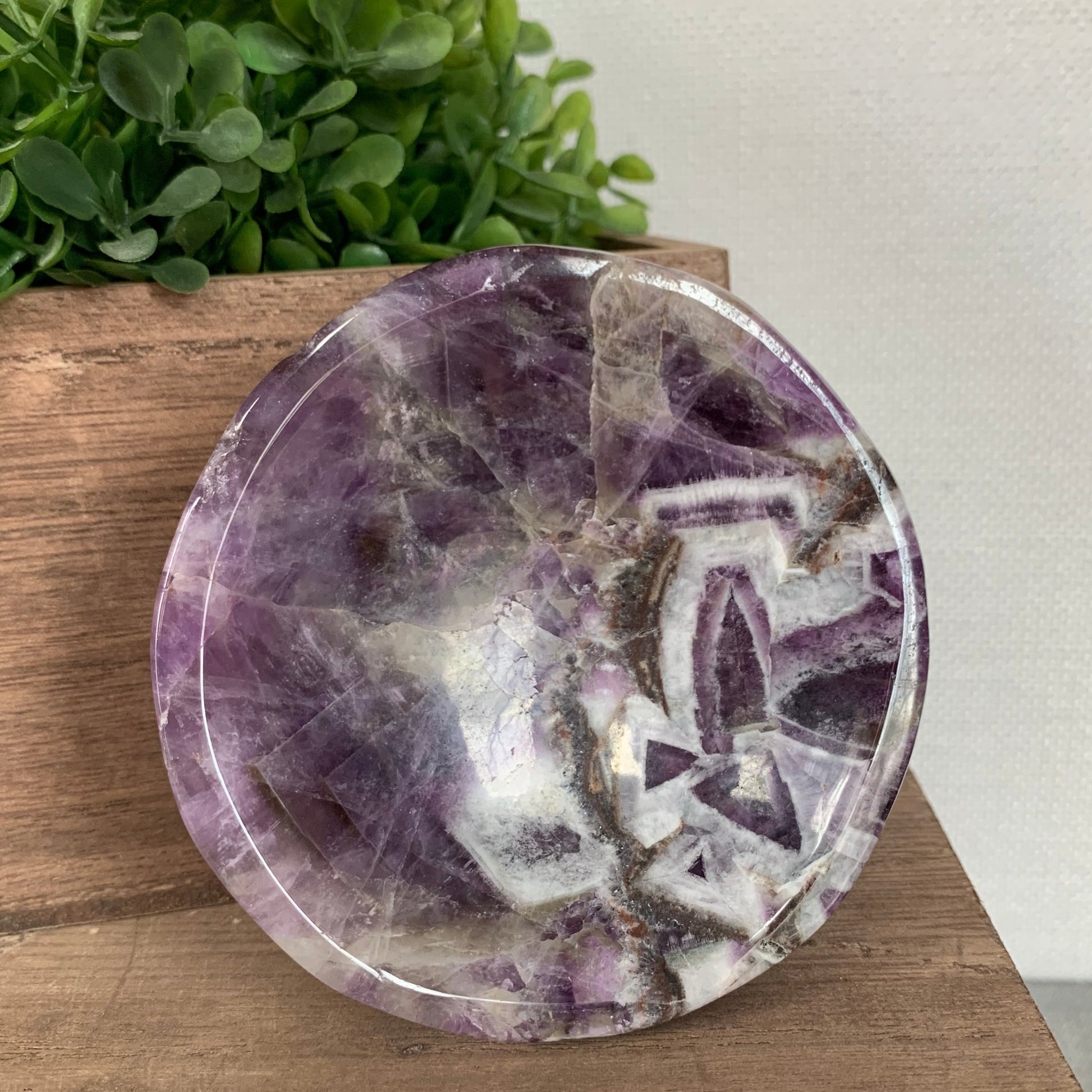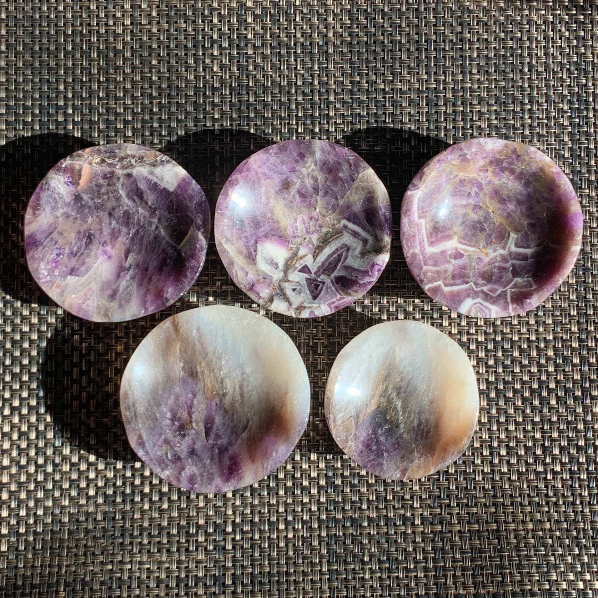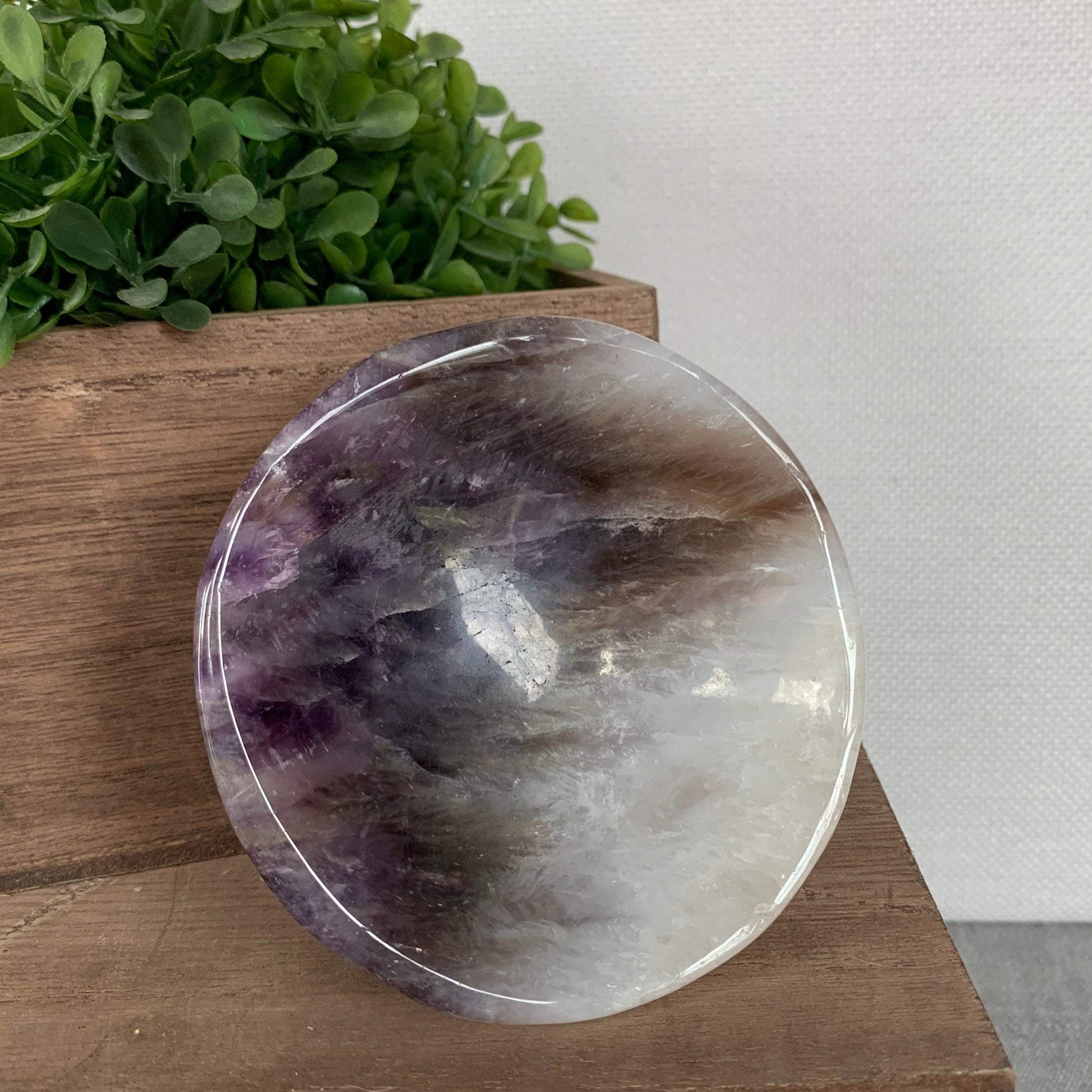 Dream Amethyst Bowls are beautiful on their own, you may not want to use them for anything! They each have unique patterning and some have clear spots and smoky bits and rainbows. They range in size from 3" - 3.5" wide.