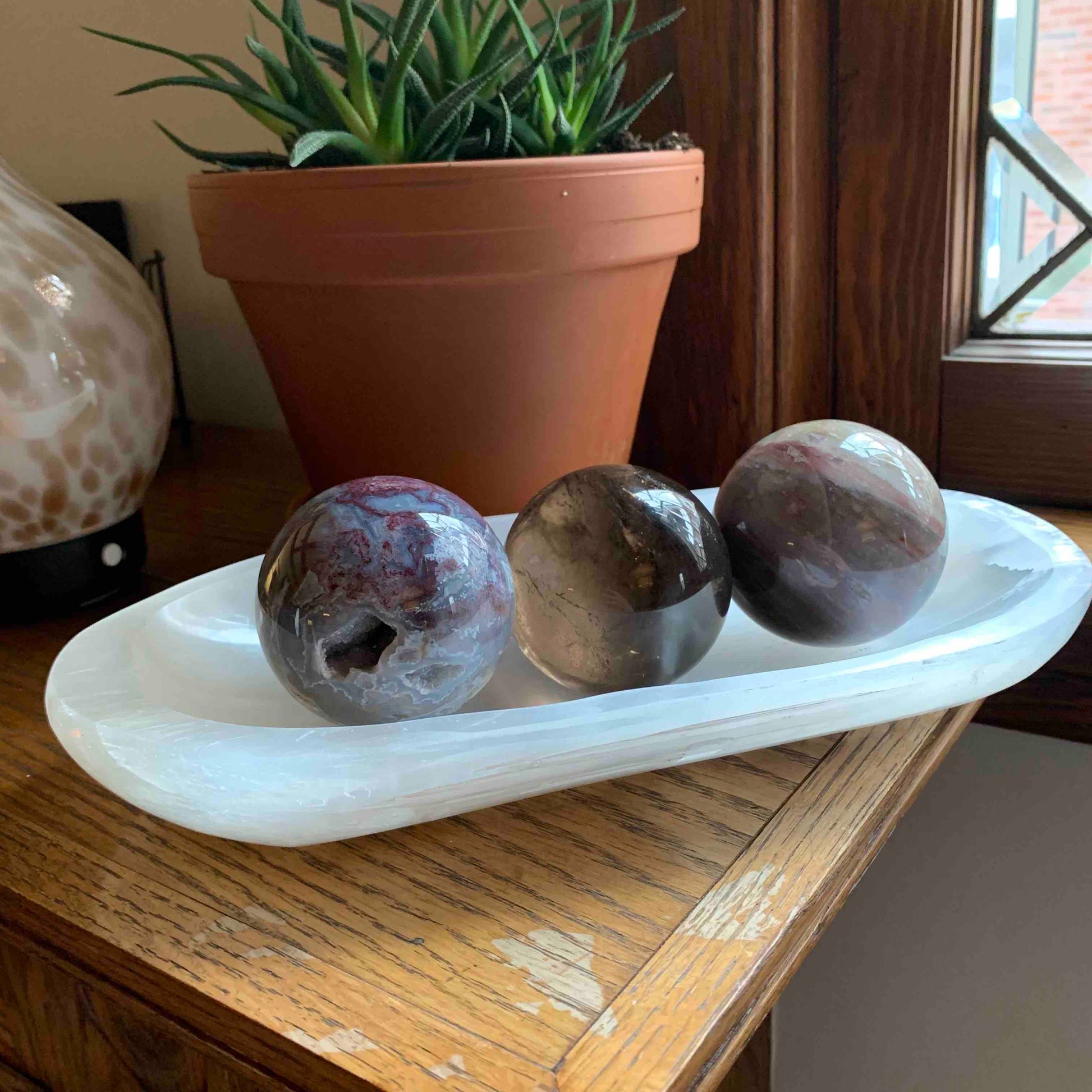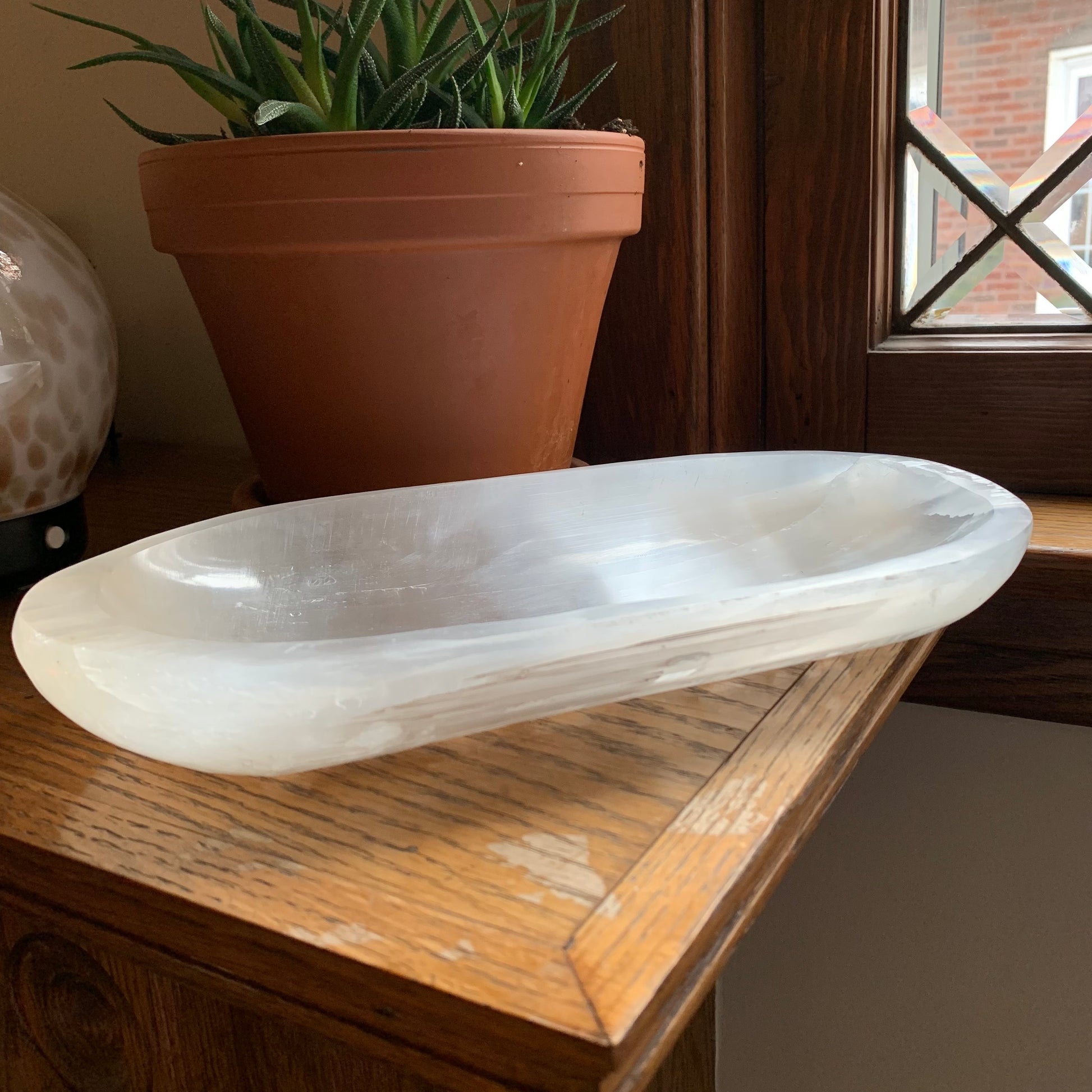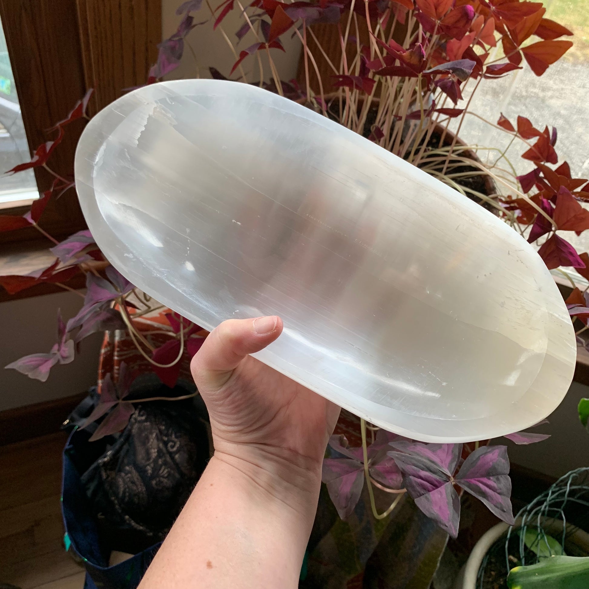 These HUGE Selenite / Satin Spar bowls are the largest we've ever seen! They measure 12" long x 5" wide.