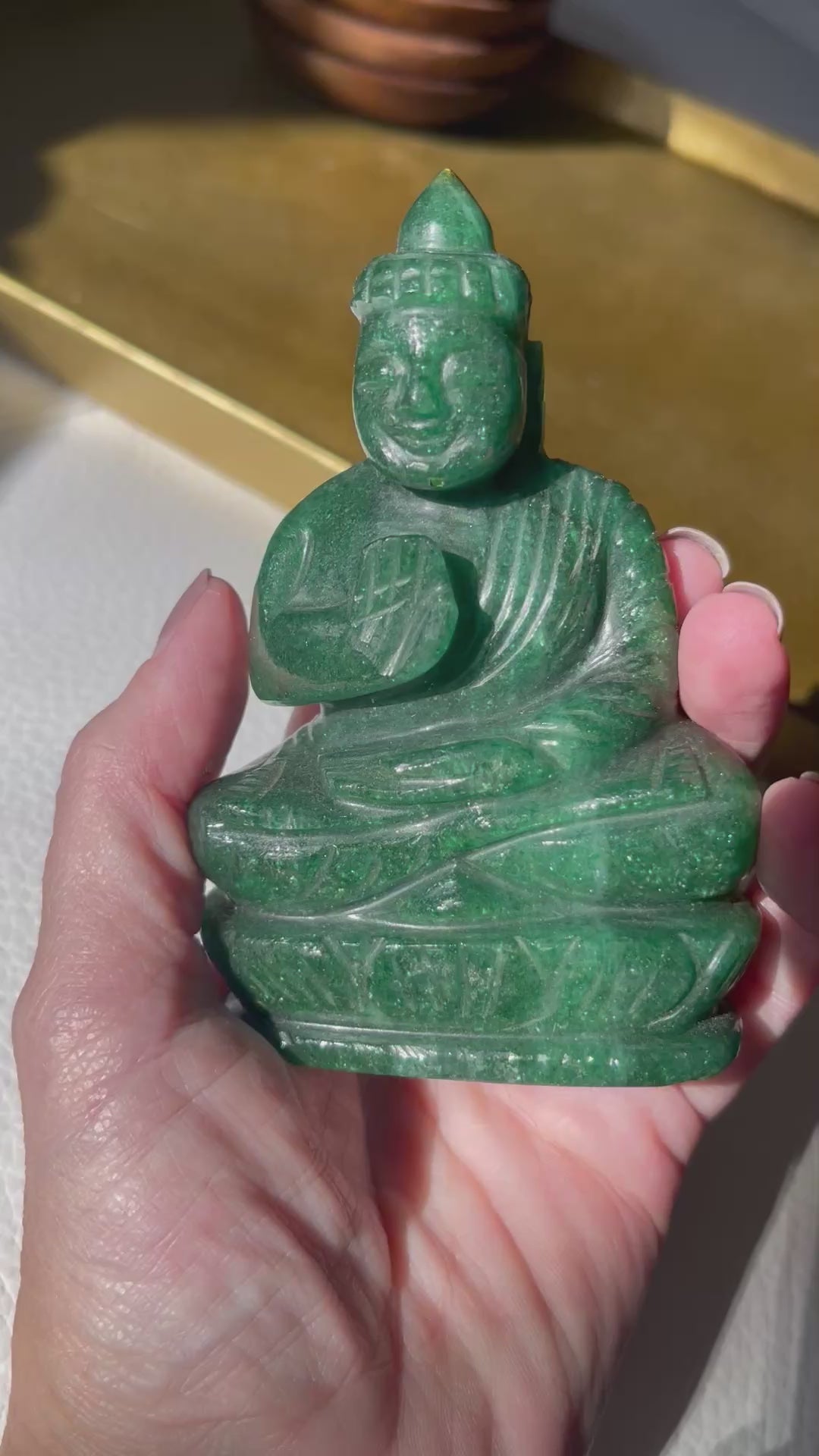 We are so honored to offer this hand carved Buddha carving from India made of Green Aventurine.