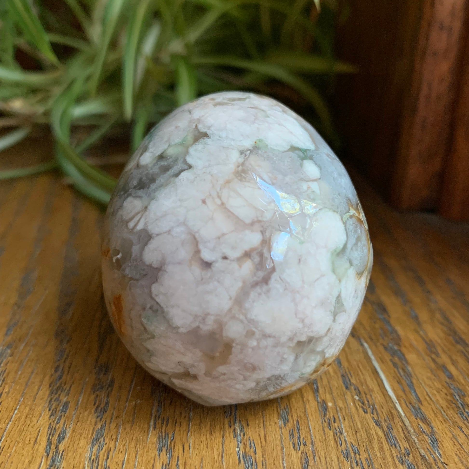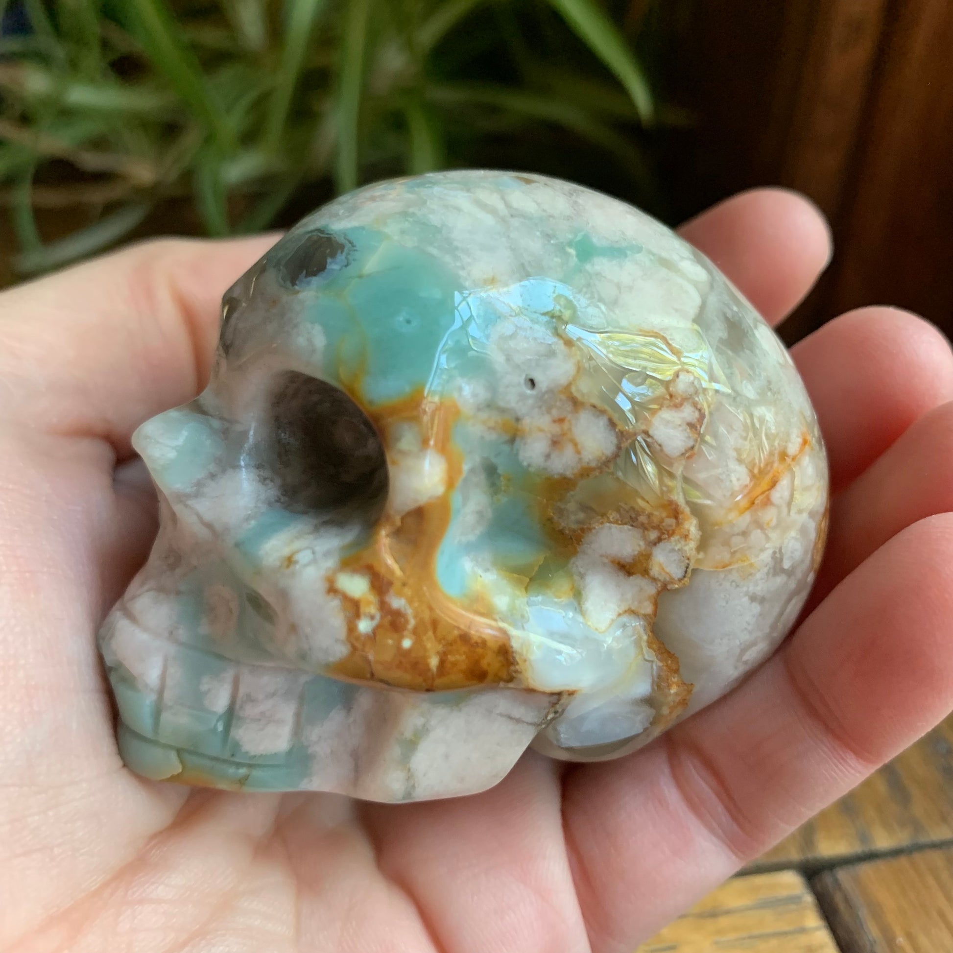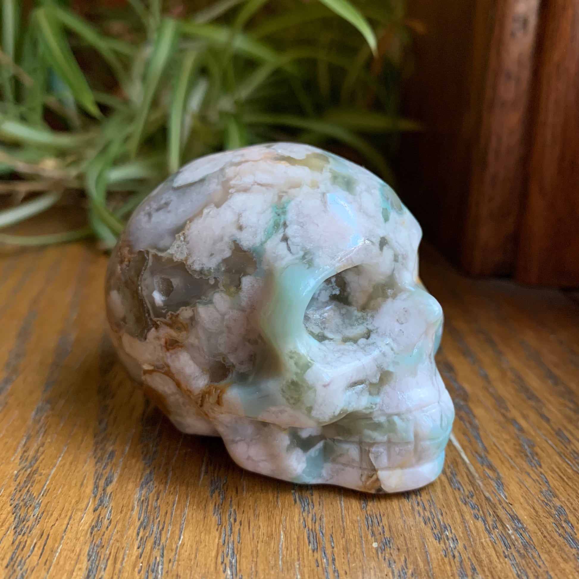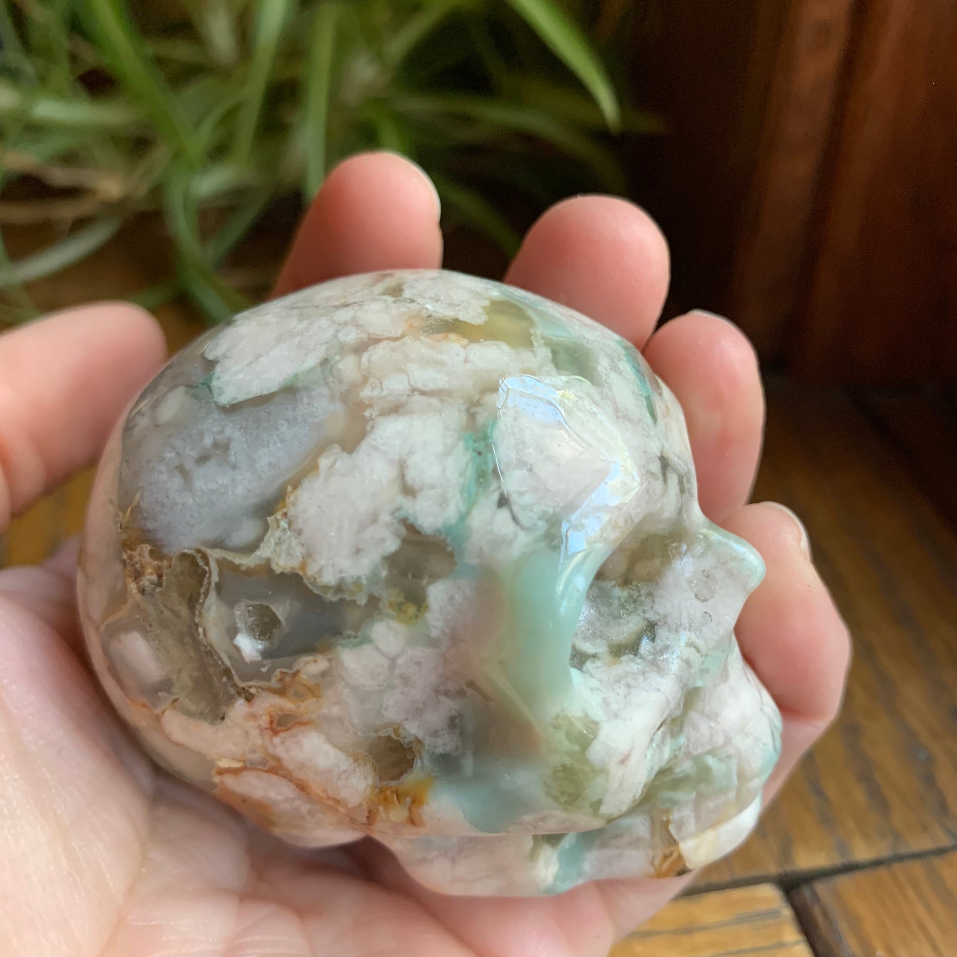 This moody flower agate skull has gorgeous plumes and banding. She also has a cute little sparkly patch of druzy.