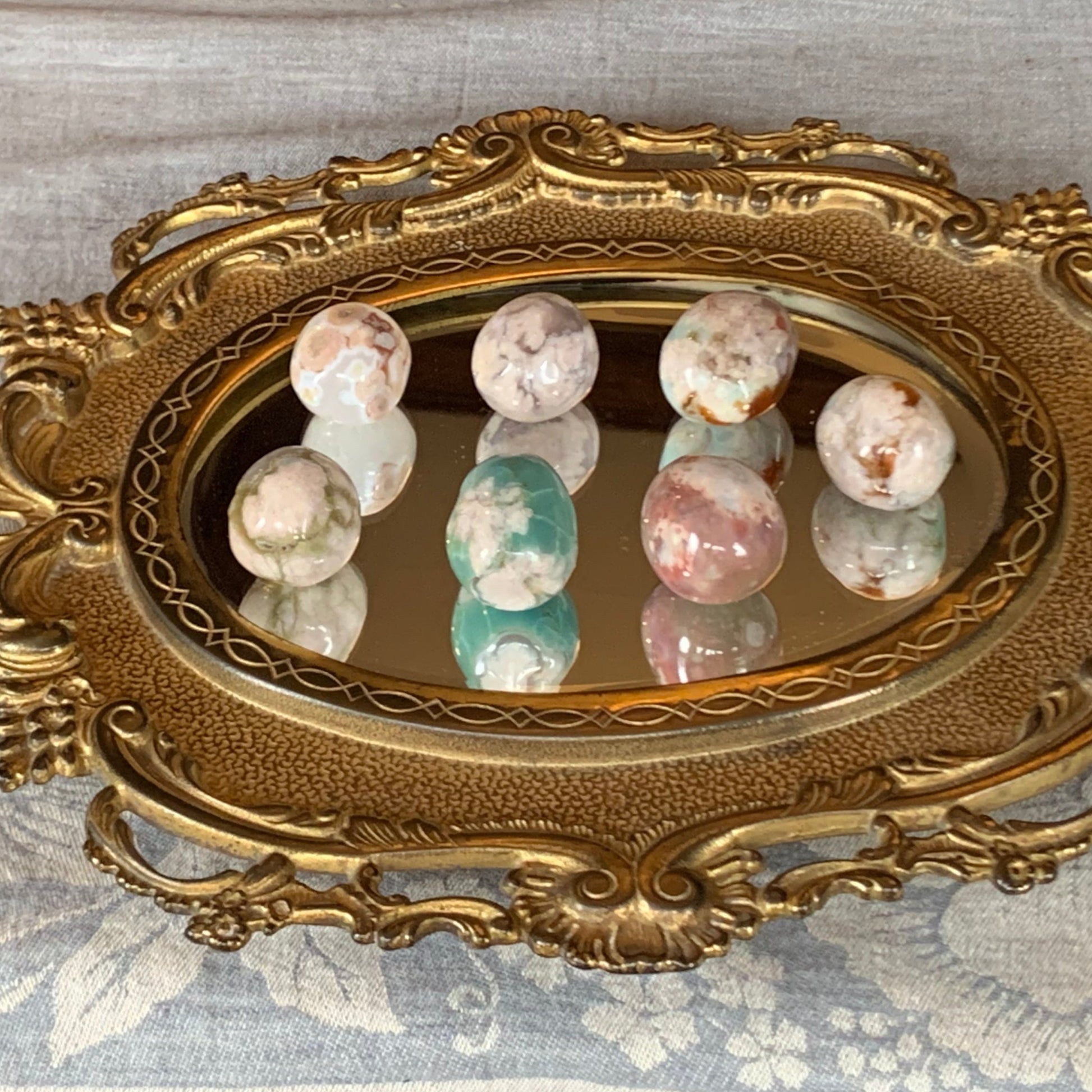 We've never seen such amazing quality and color clarity on these Green Flower Agate Tumbles. They are a large tumble or could be considered a small palm. The perfect shape to display in a dish. Delish like candy!