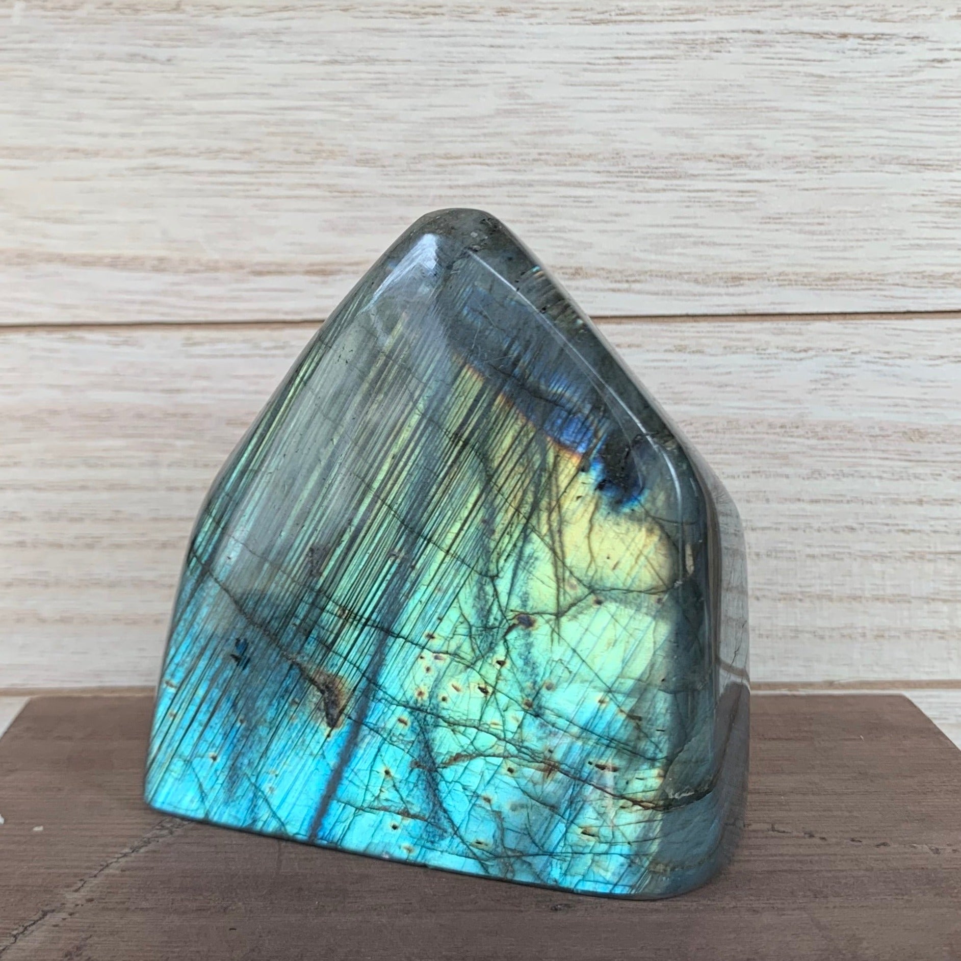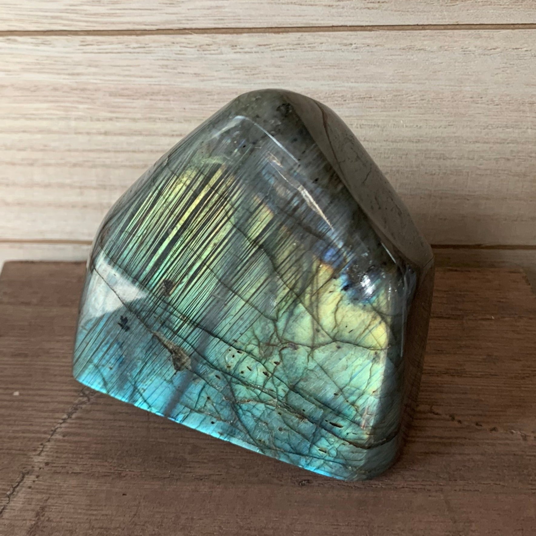 We typically will only Labradorite, only because it's hard to find *good* high-flash. These freeforms deliver. No special lighting was used in the photography--only natural indirect light! This one serves up a high quality aqua and golden flash. 3.75" h