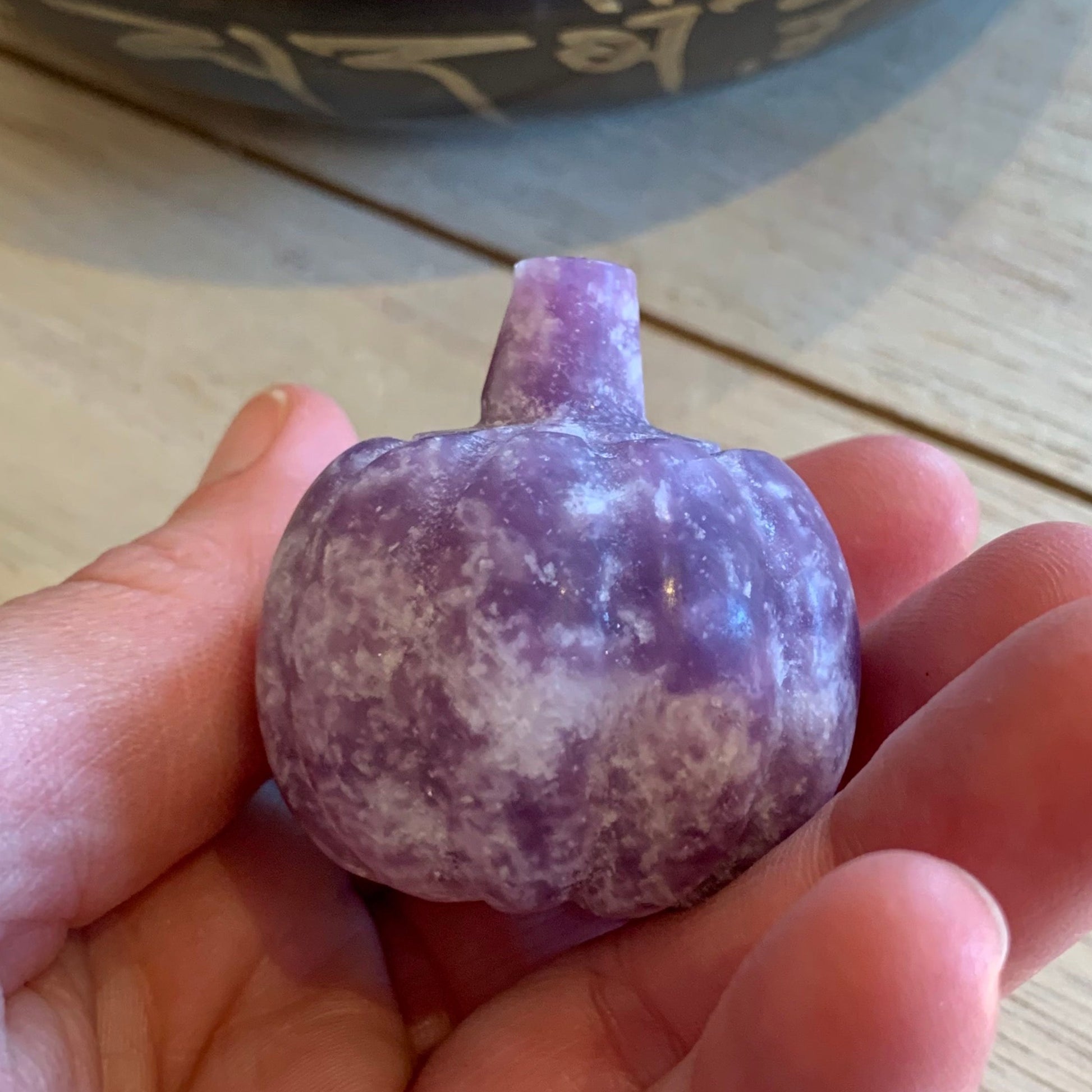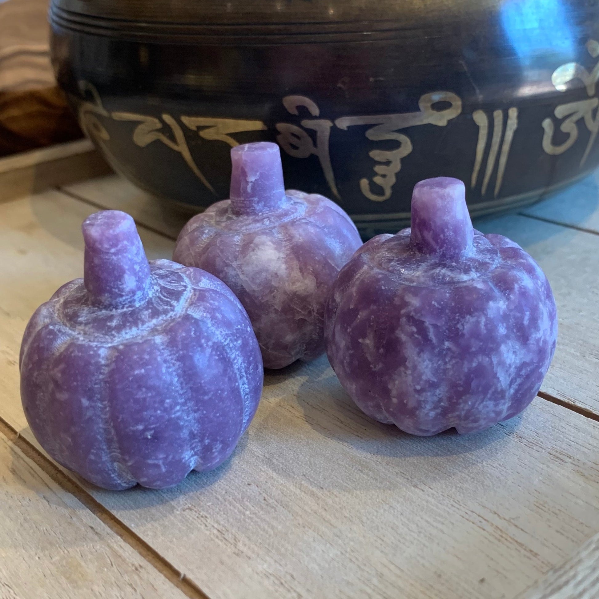 These cute Lepidolite Pumpkin carvings will last you through the Fall holidays. So sweet. They are 1.5".
