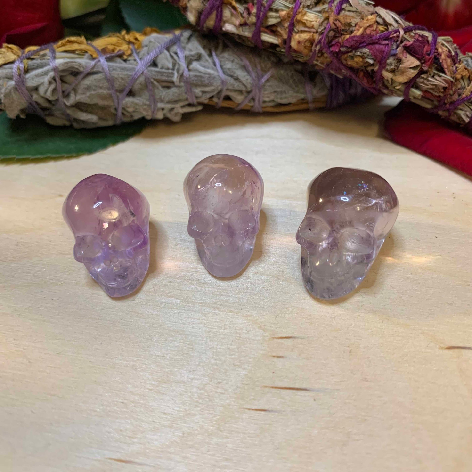 Check out these super sweet Mini Amethyst Skulls. The Amethyst is high-quality and very clear, and some have phantoms or rainbows.