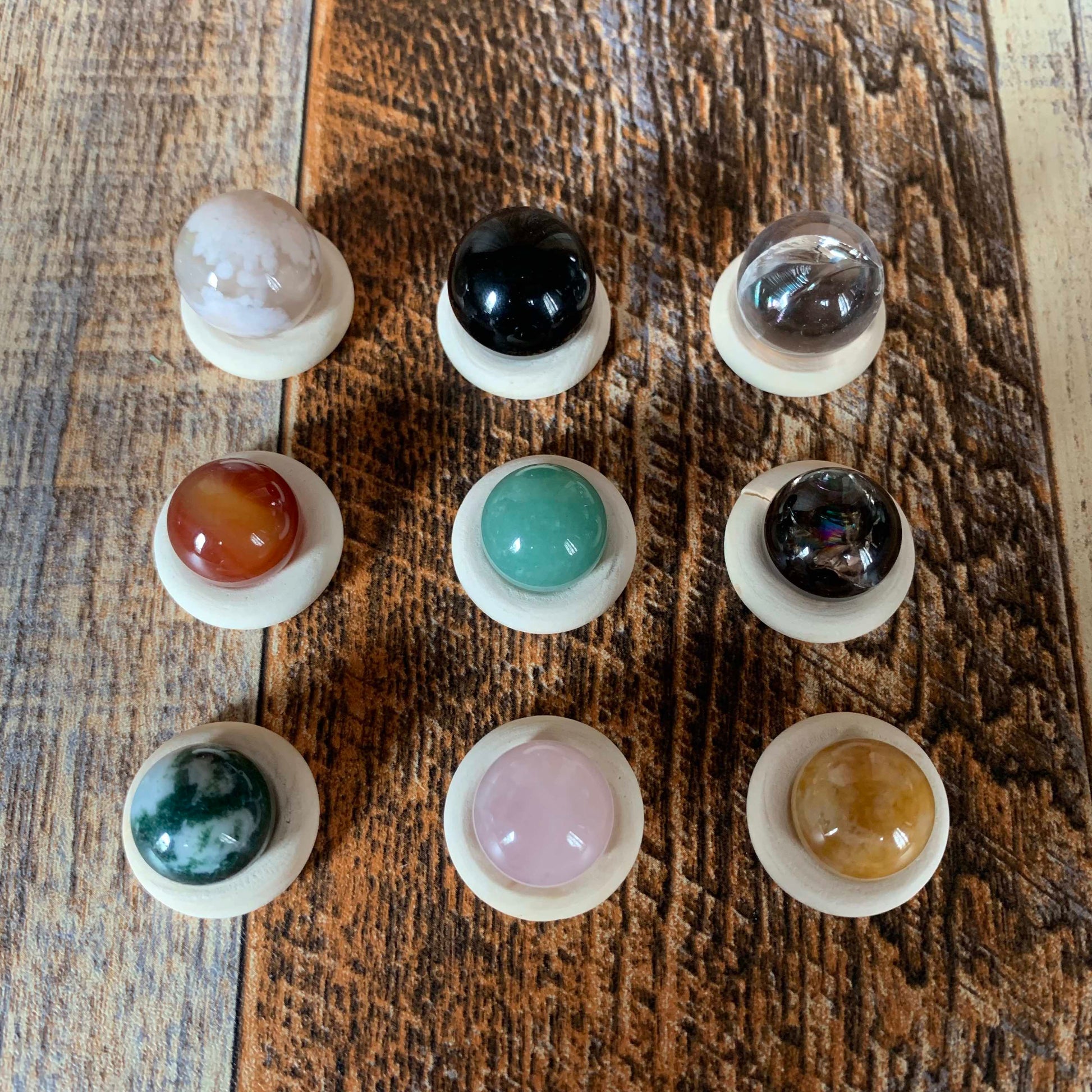 Moss Agate, Rose Quartz, Golden Healer, Carnelian, Green Aventurine, Smoky Quartz w/Rainbow, Flower Agate, Black Obsidian, Clear Quartz w/Rainbow