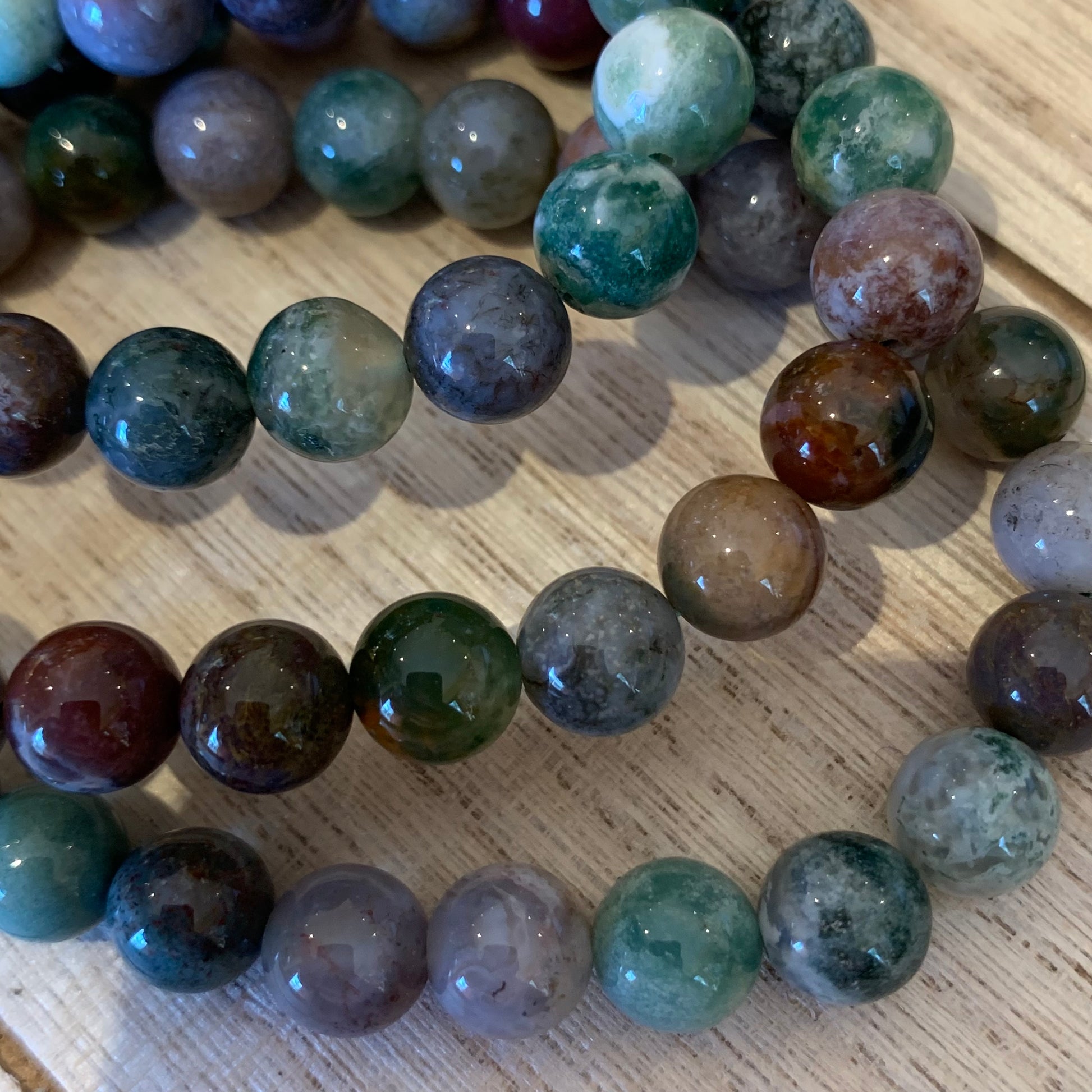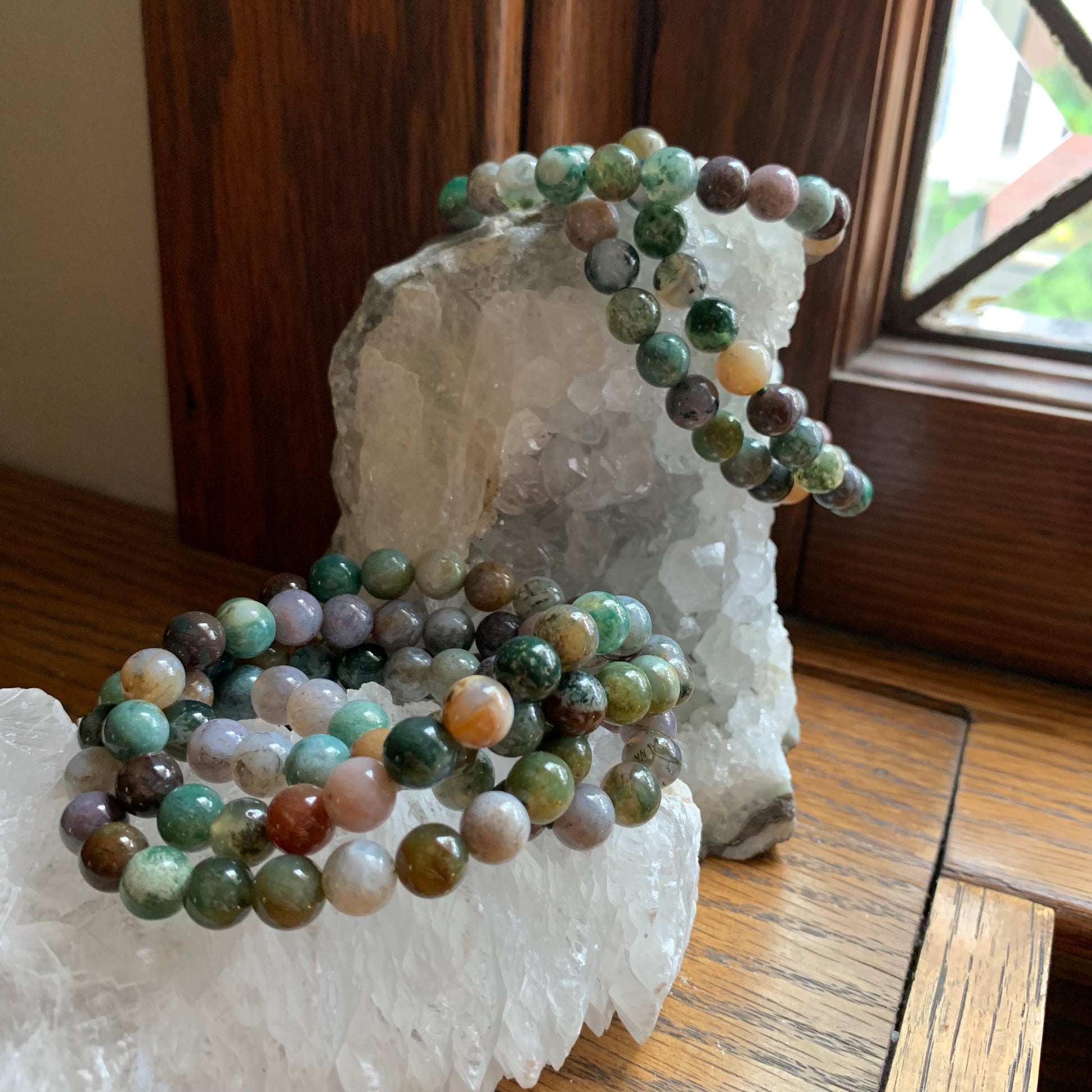 These Moss Agate Bracelets are amazing as the beads capture all the visual varieties that Moss Agate has. Some beads are purple, some are green, some are white, some are solid, some are veined...each one is unique. These are approx. 8.5mm bead and 7.5" bracelet.