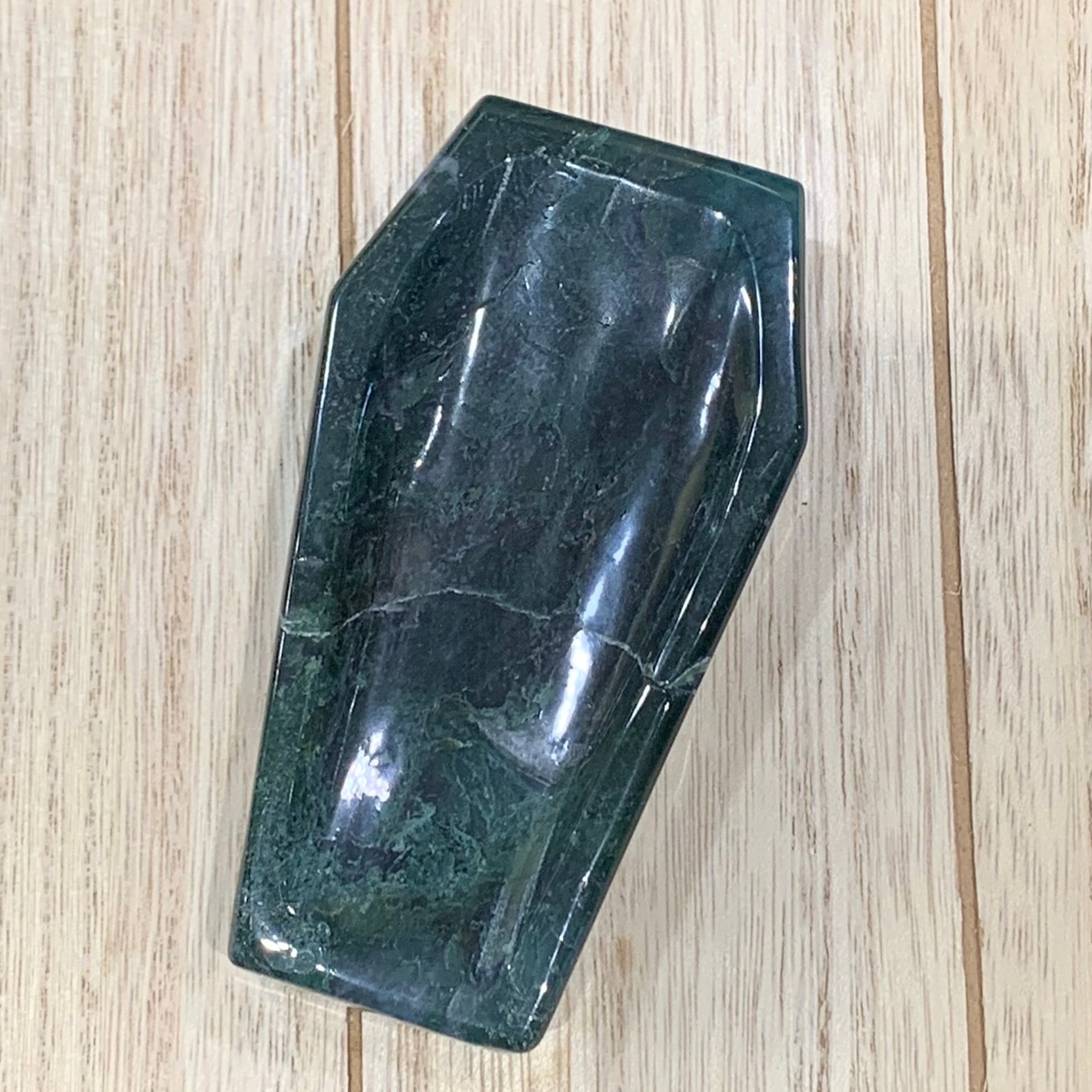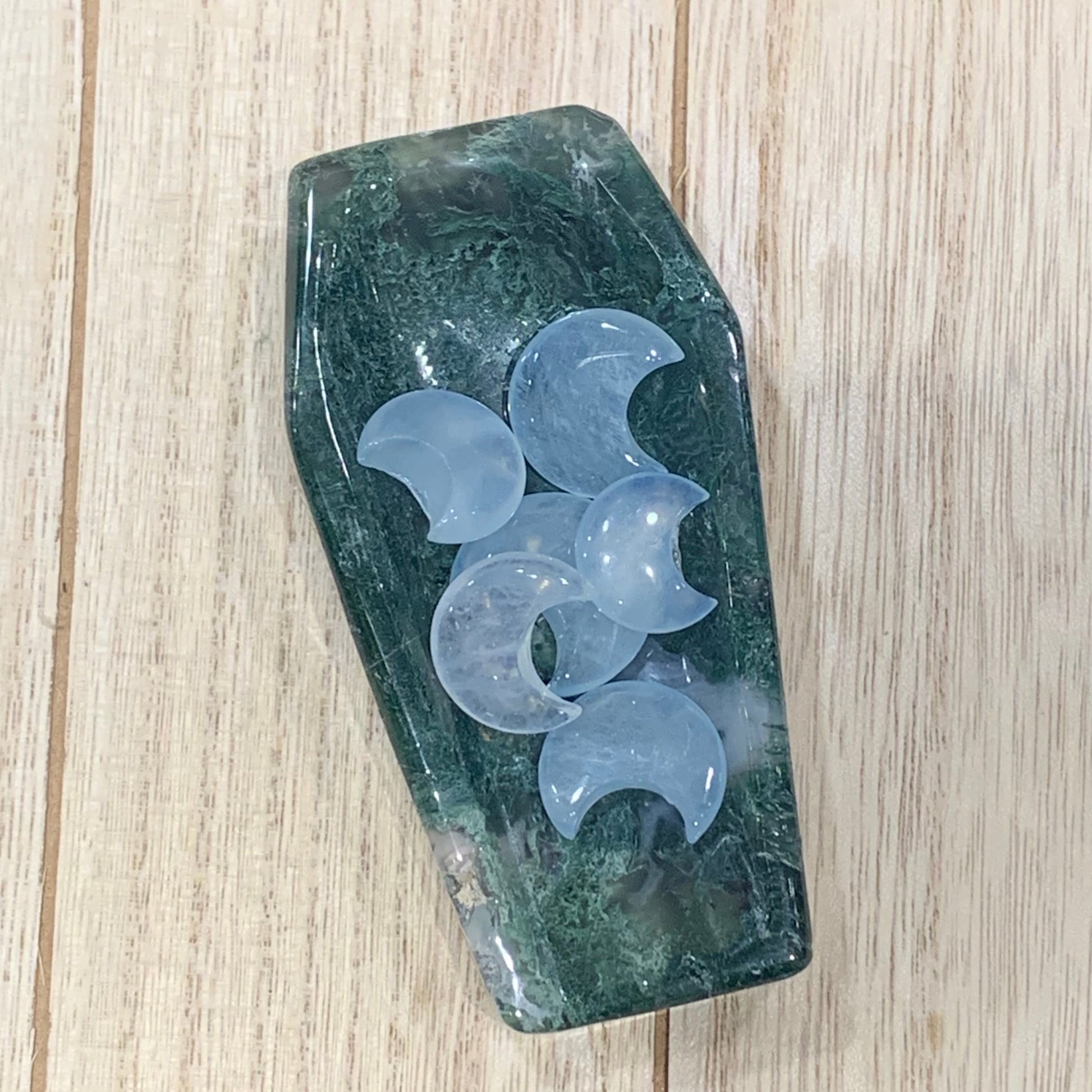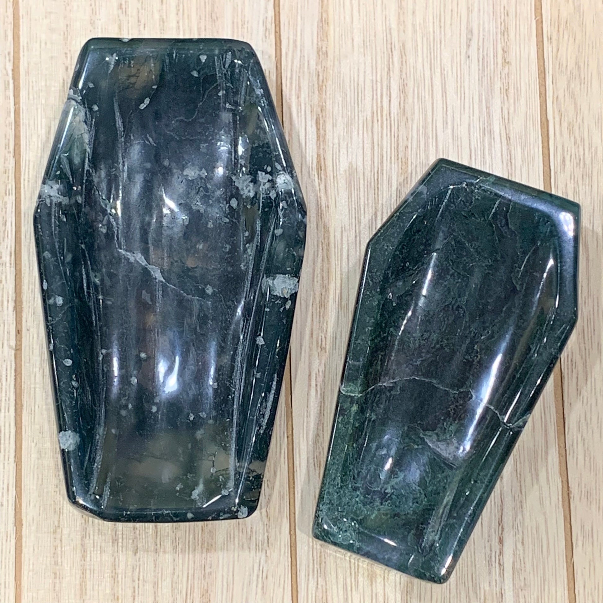 Trick out your Halloween decor with one of these Moss Agate Coffin Bowls. They are one of a kind. Perfect for little candies or crystals.