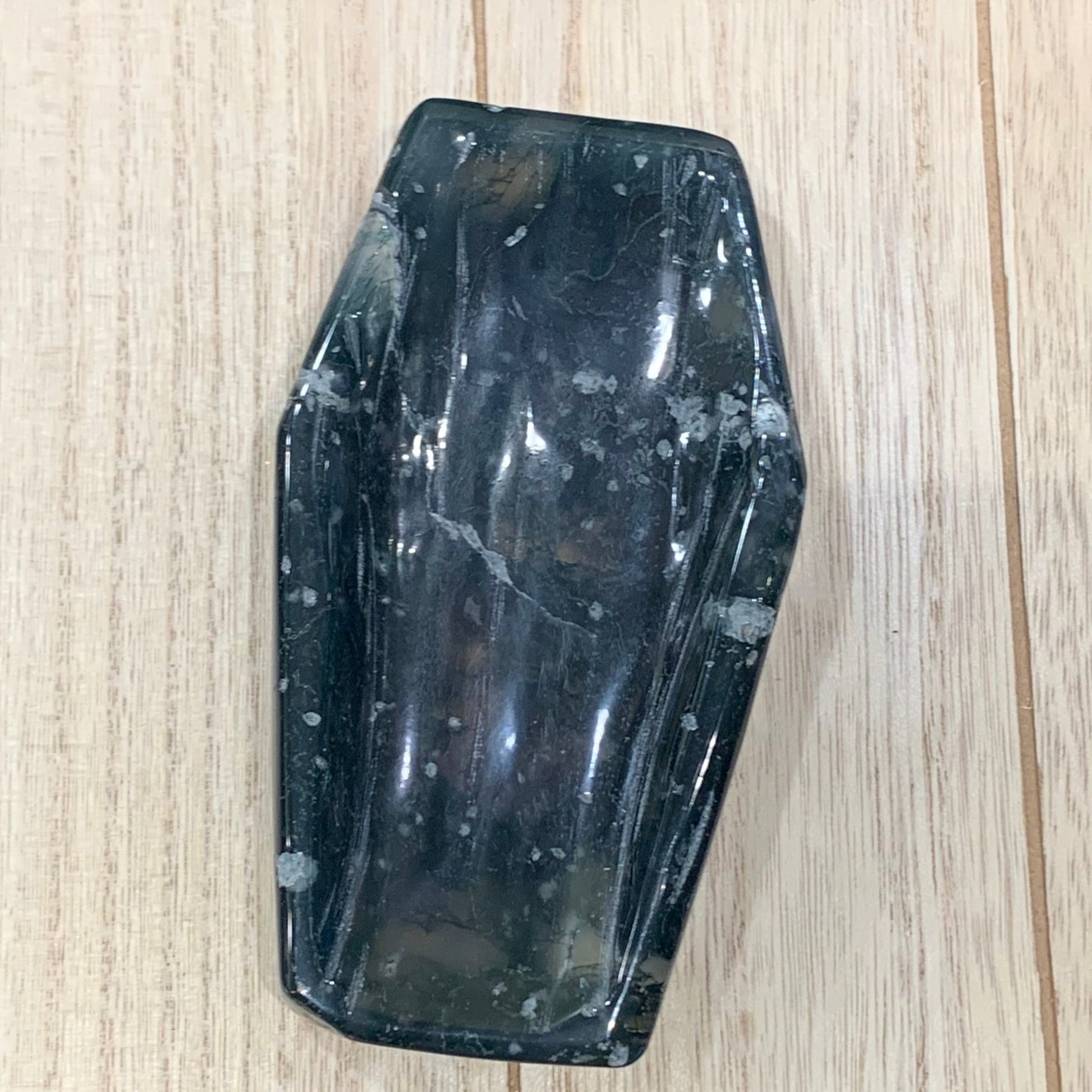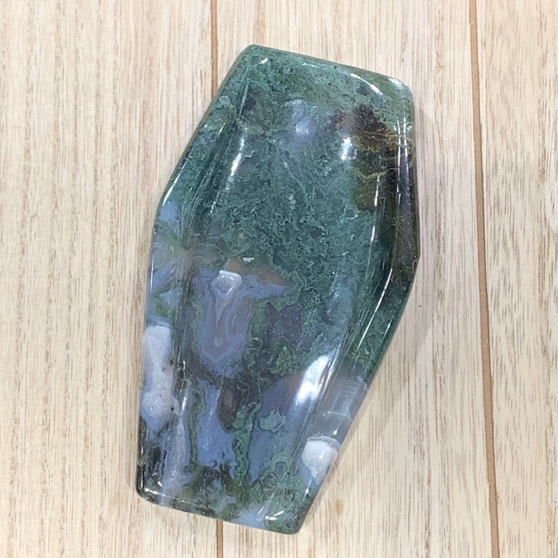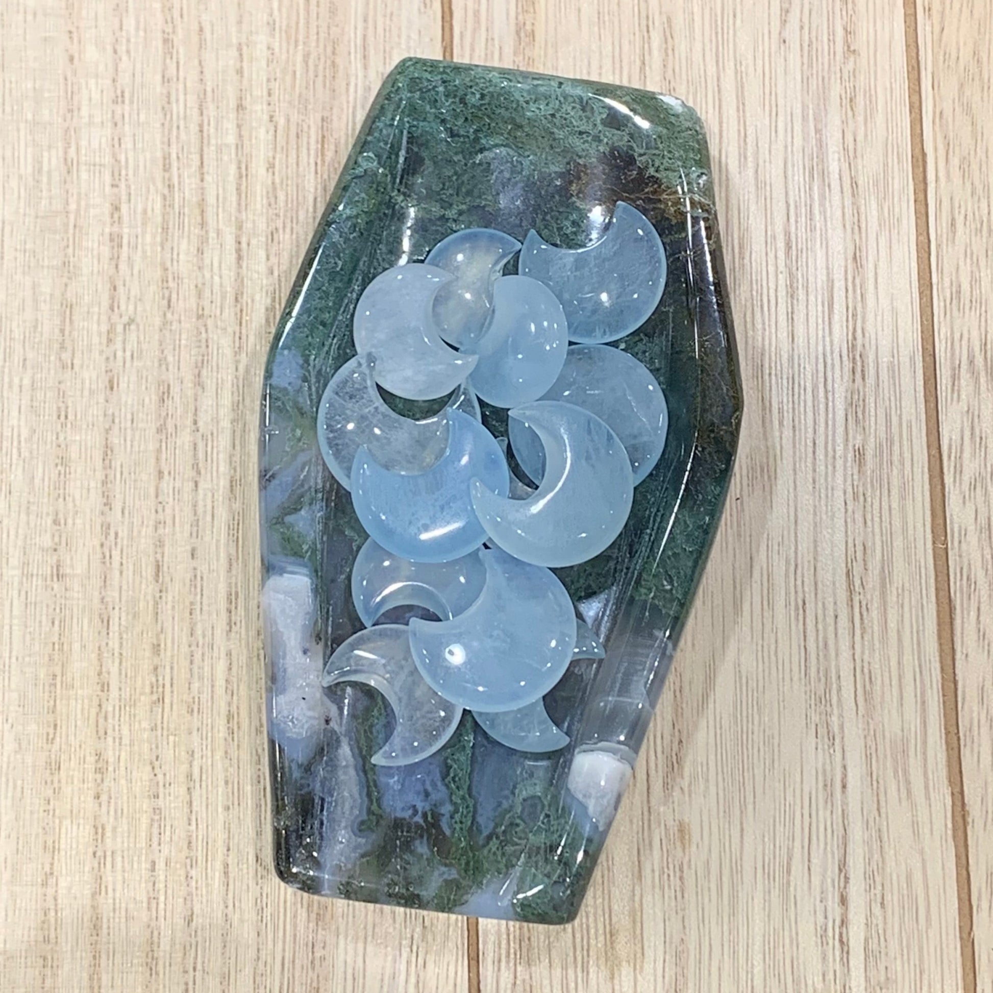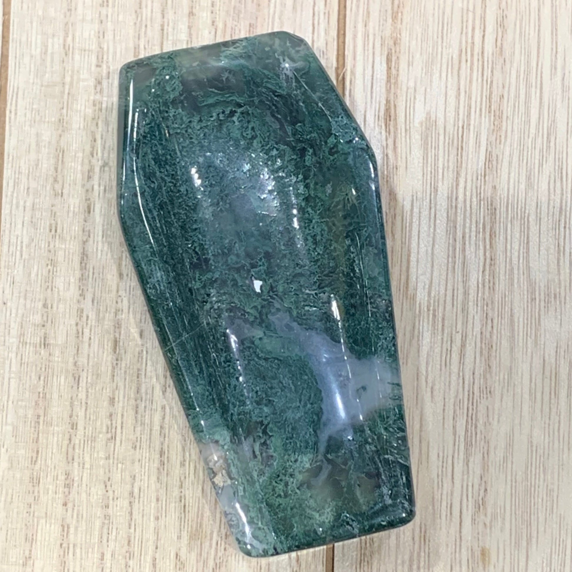 Trick out your Halloween decor with one of these Moss Agate Coffin Bowls. They are one of a kind. Perfect for little candies or crystals.
