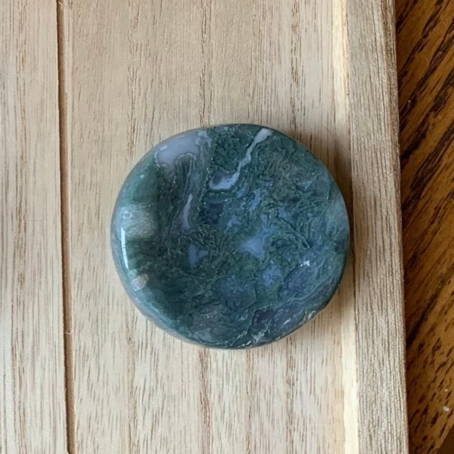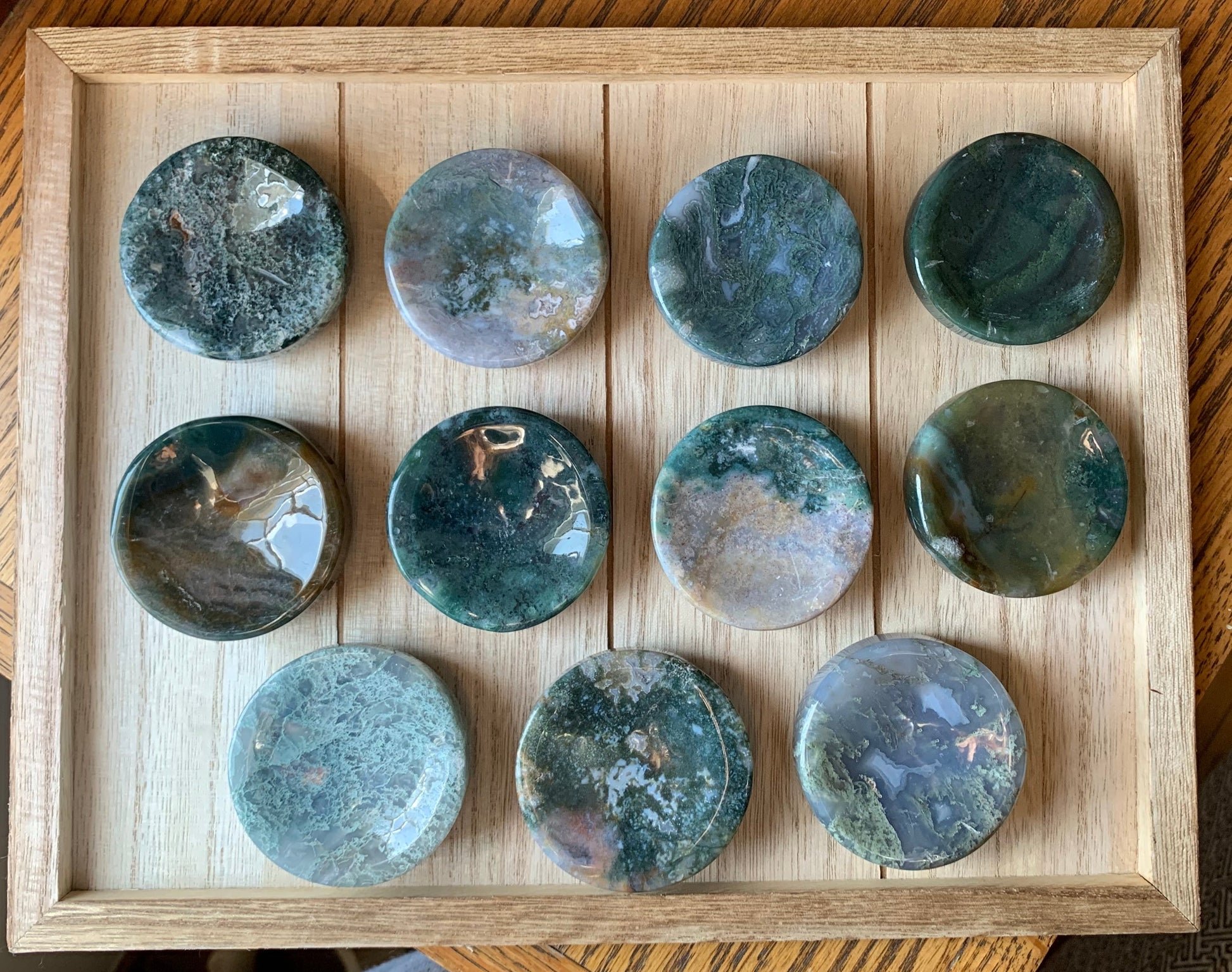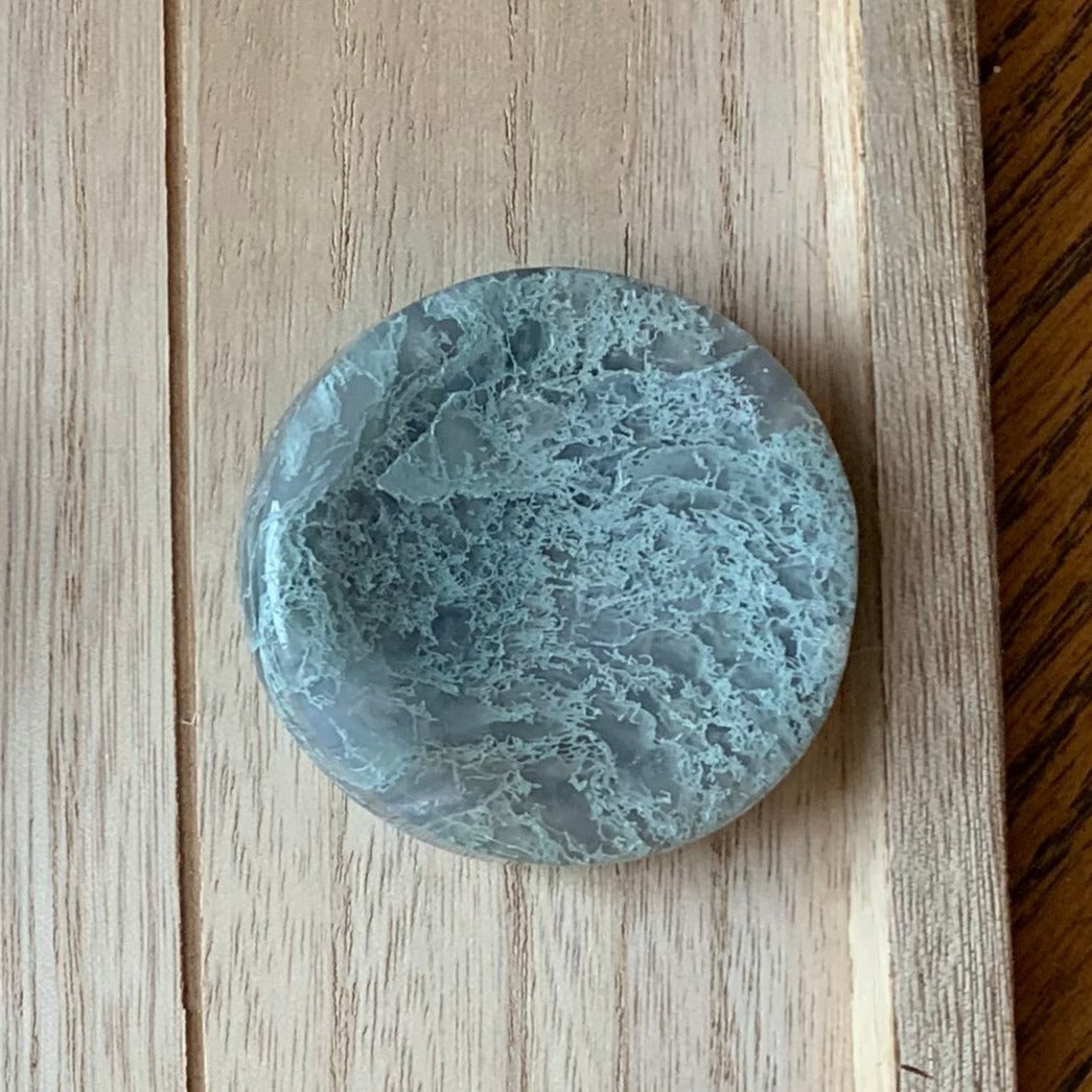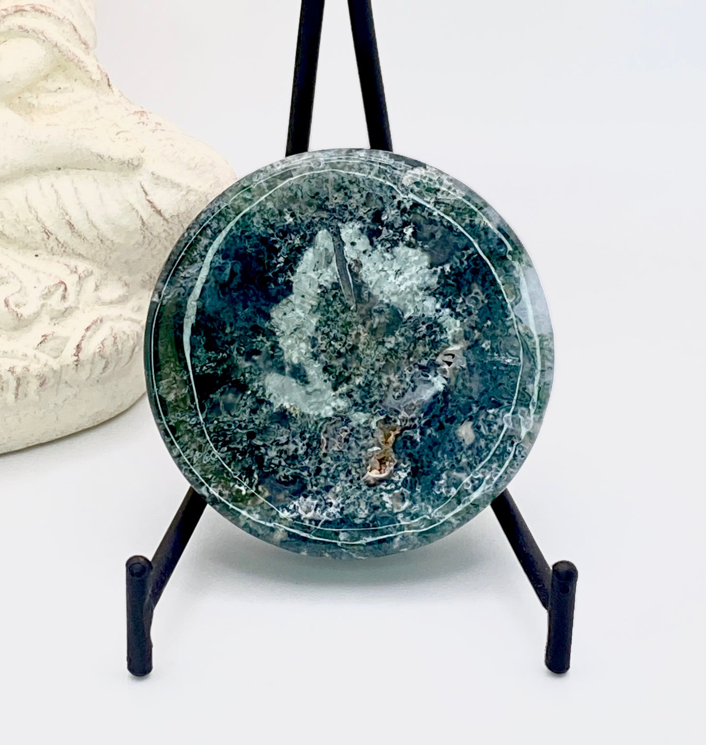 These adorable 2.5" Moss Agate multi-use plates are so adorable you may want to collect them all. They can be useful as an altar piece for an offering or incense, a sphere holder (see photo), or to hold some small crystals.