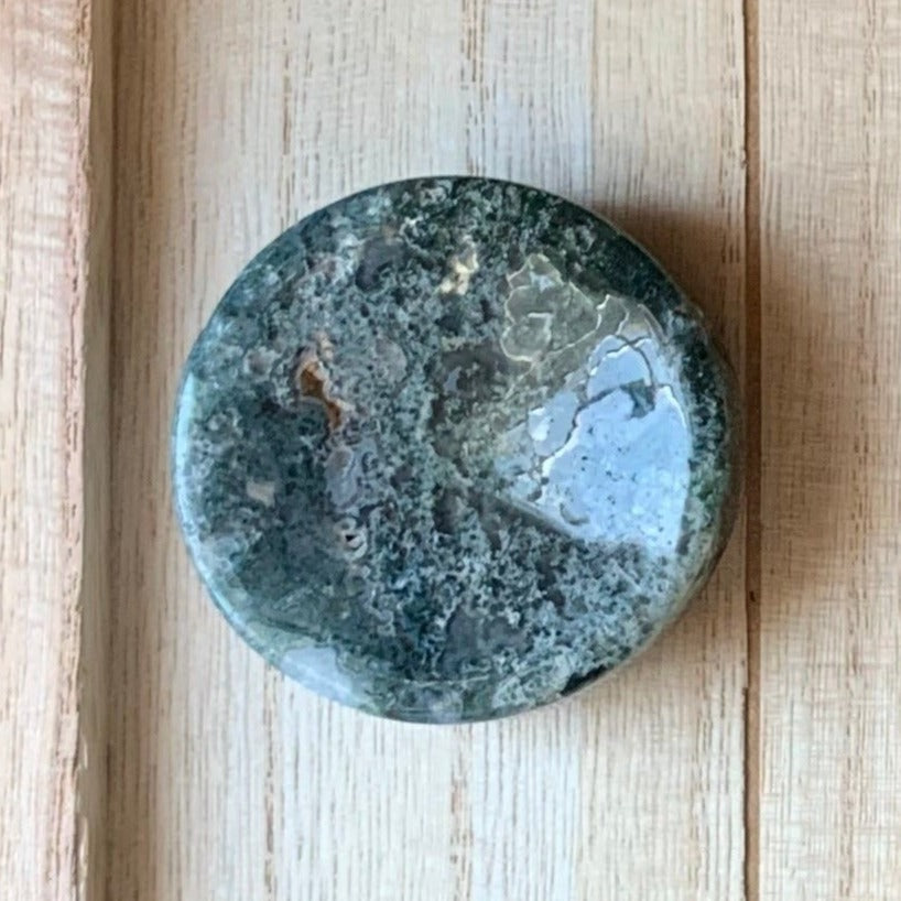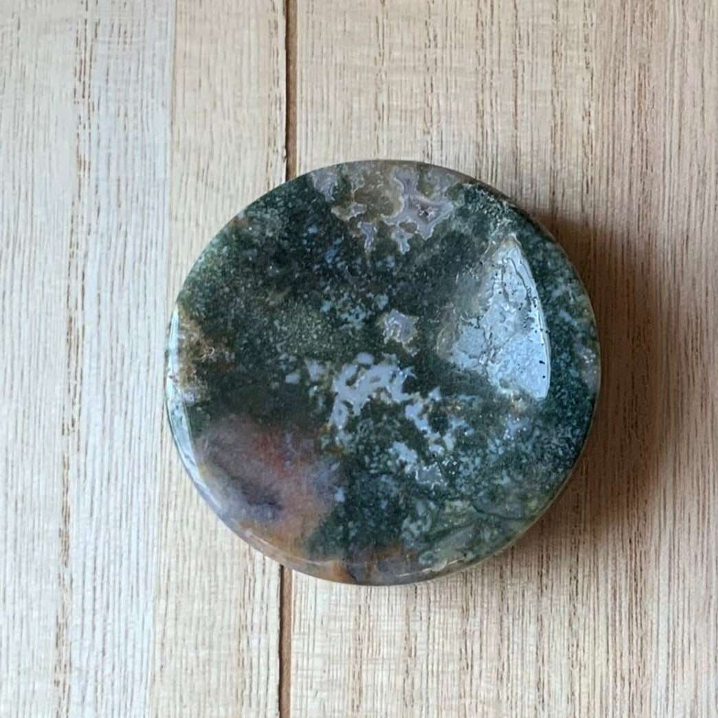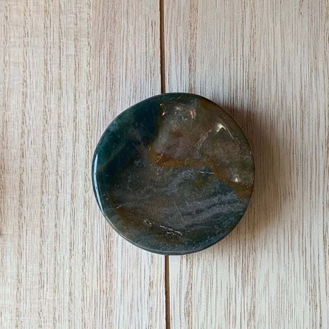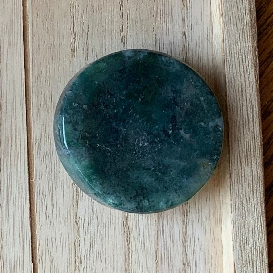These adorable 2.5" Moss Agate multi-use plates are so adorable you may want to collect them all. They can be useful as an altar piece for an offering or incense, a sphere holder (see photo), or to hold some small crystals.