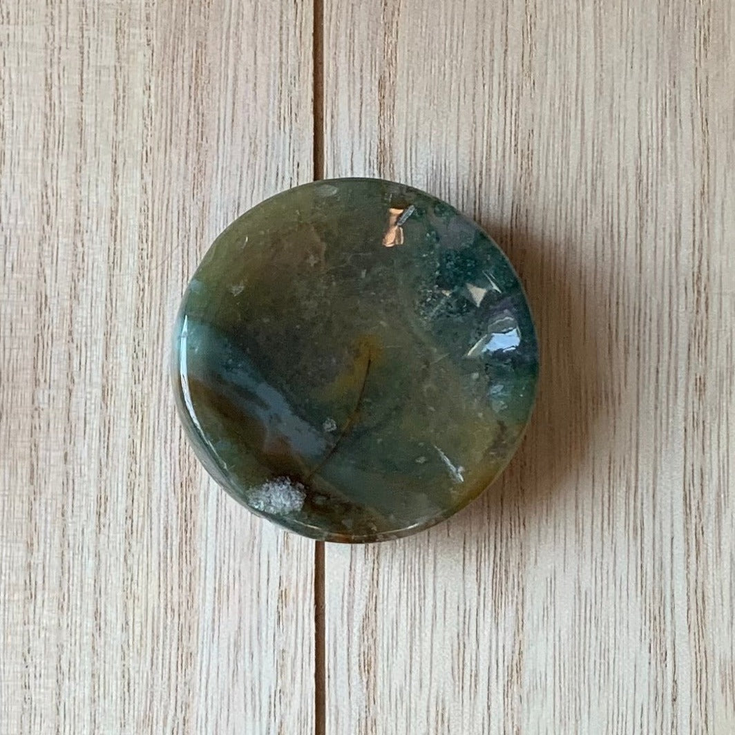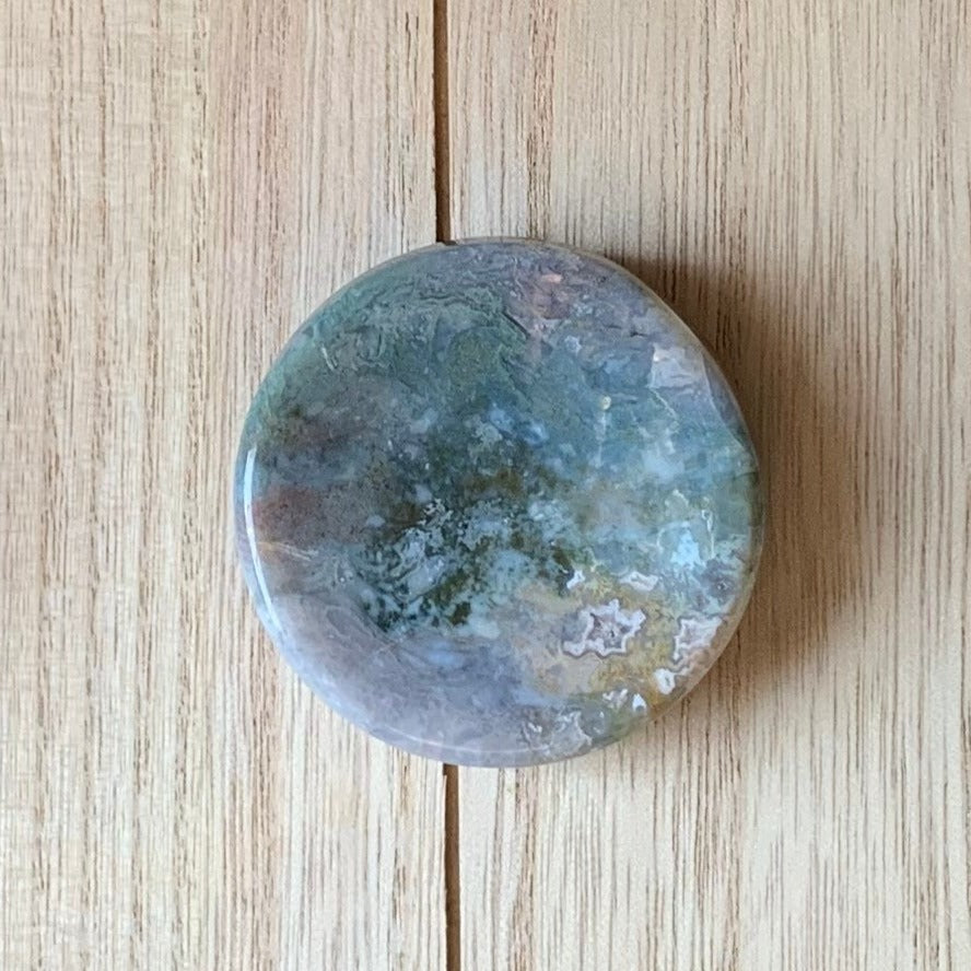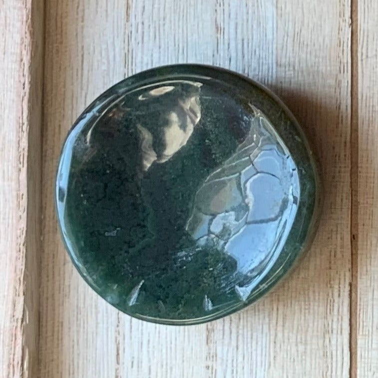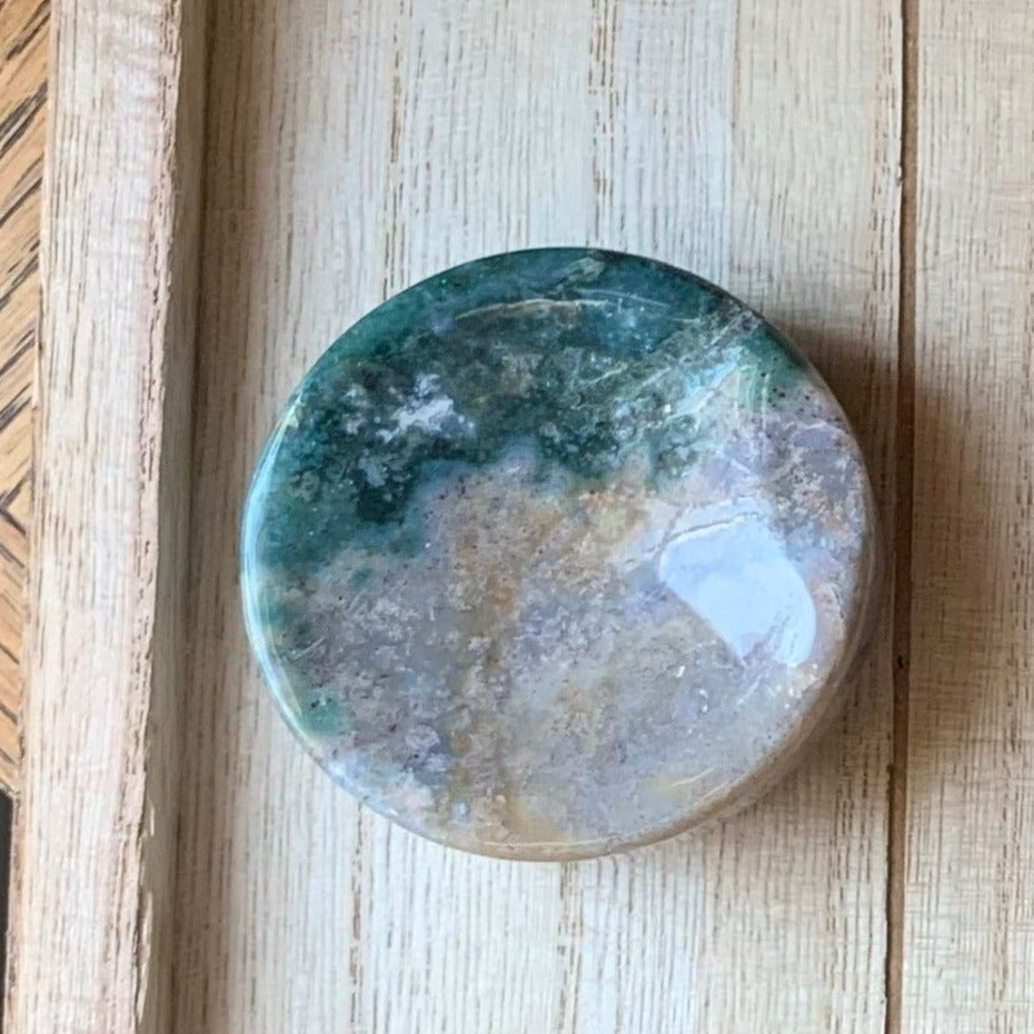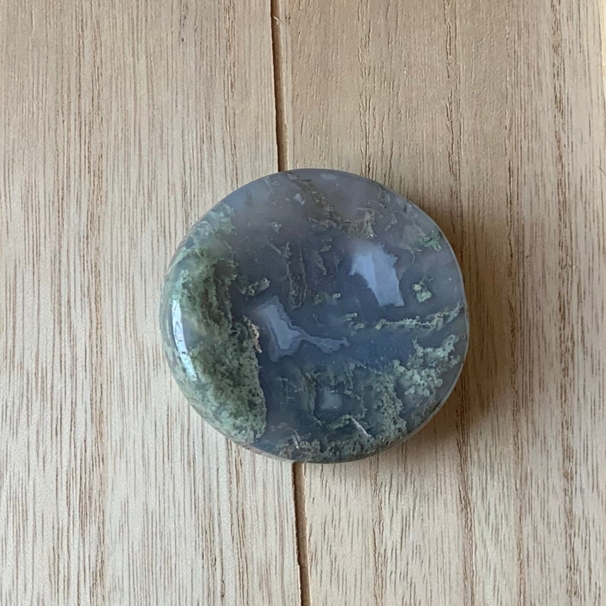 These adorable 2.5" Moss Agate multi-use plates are so adorable you may want to collect them all. They can be useful as an altar piece for an offering or incense, a sphere holder (see photo), or to hold some small crystals.