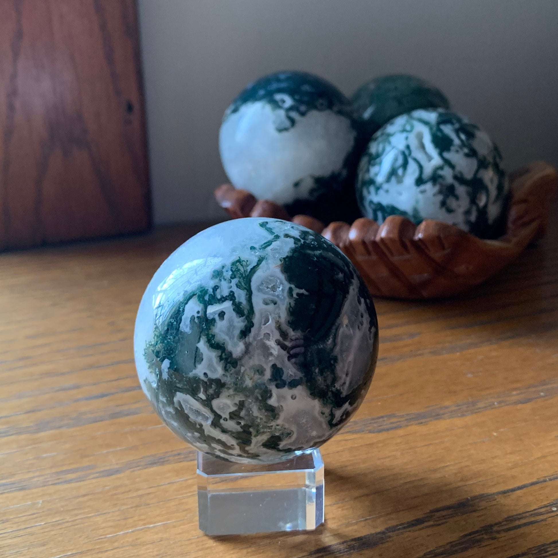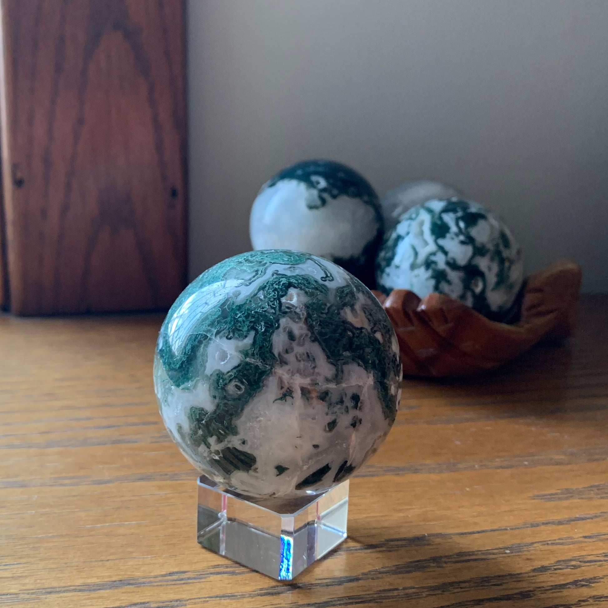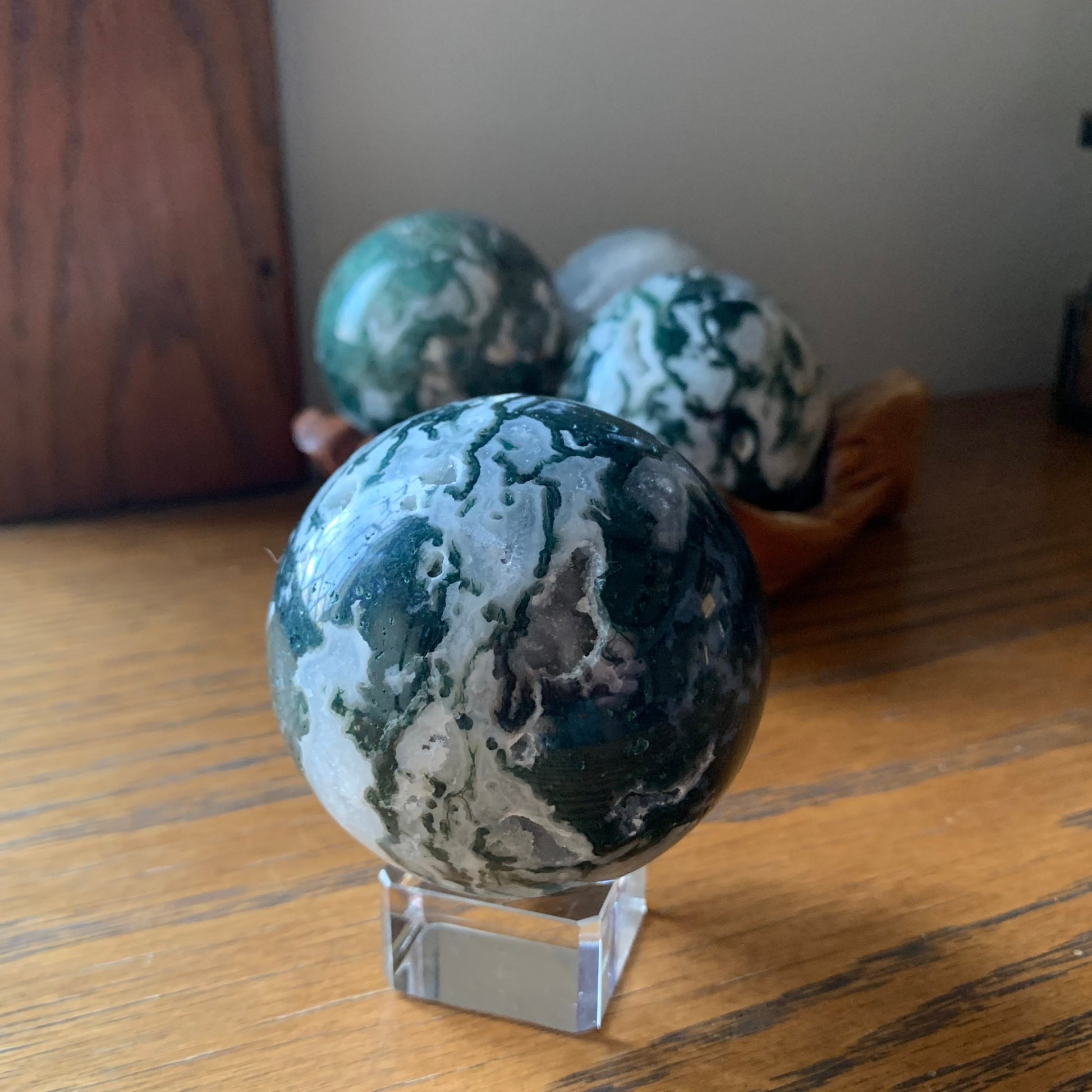 We have quite the collection of Moss Agate Spheres--some have druzy and sparkles, some are more clear and translucent, some have purple and blue tones or thinner growth. Either way, you are bound to find something appealing and tranquil for balance.