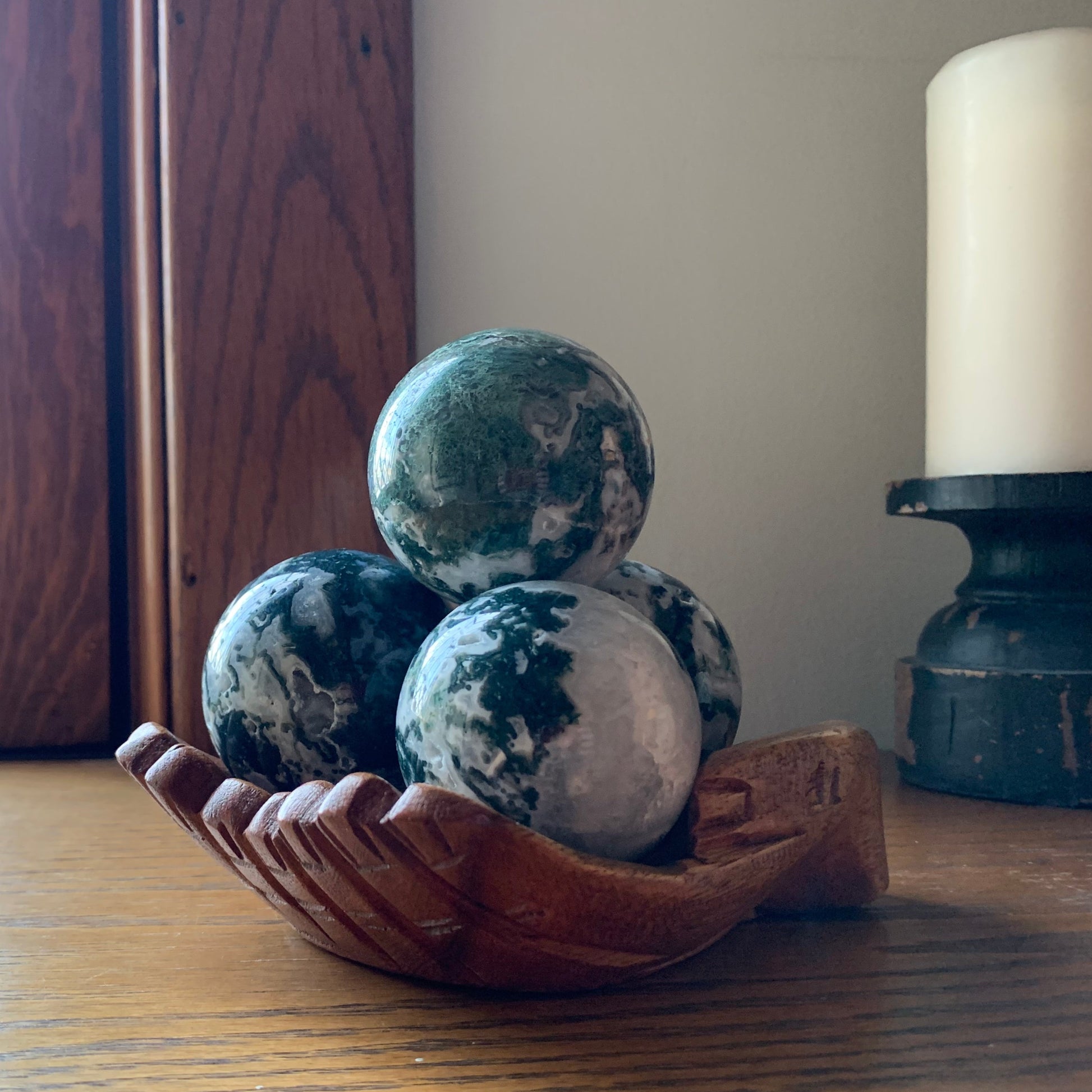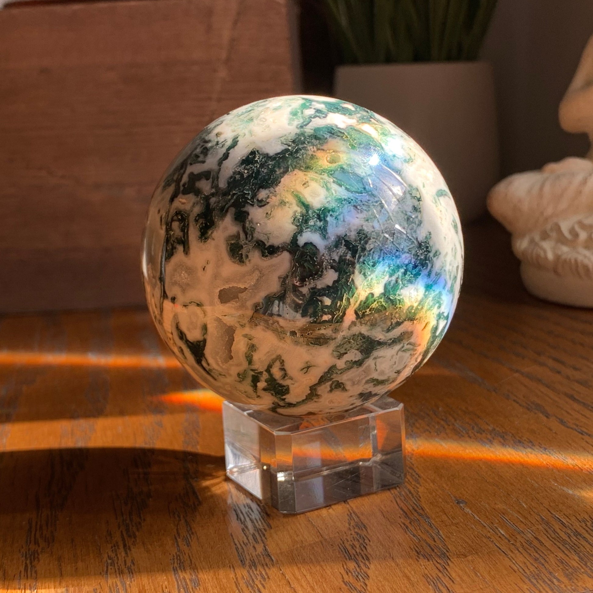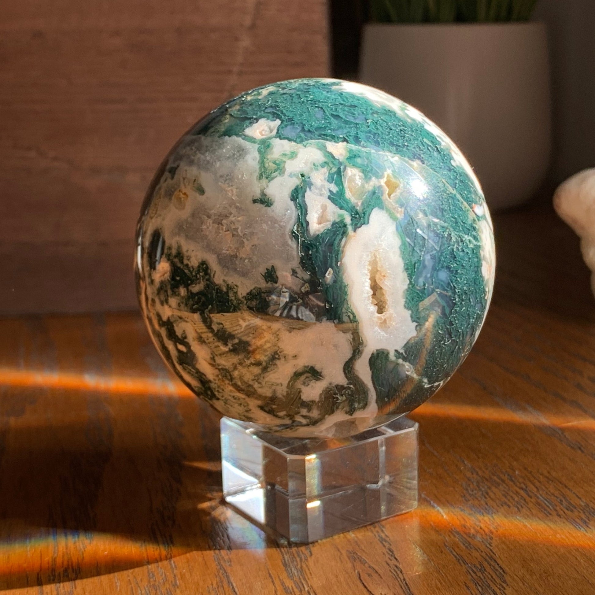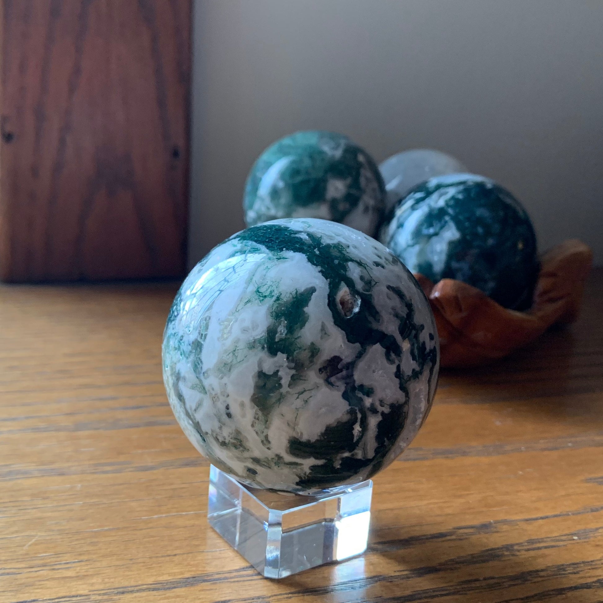 We have quite the collection of Moss Agate Spheres--some have druzy and sparkles, some are more clear and translucent, some have purple and blue tones or thinner growth. Either way, you are bound to find something appealing and tranquil for balance.