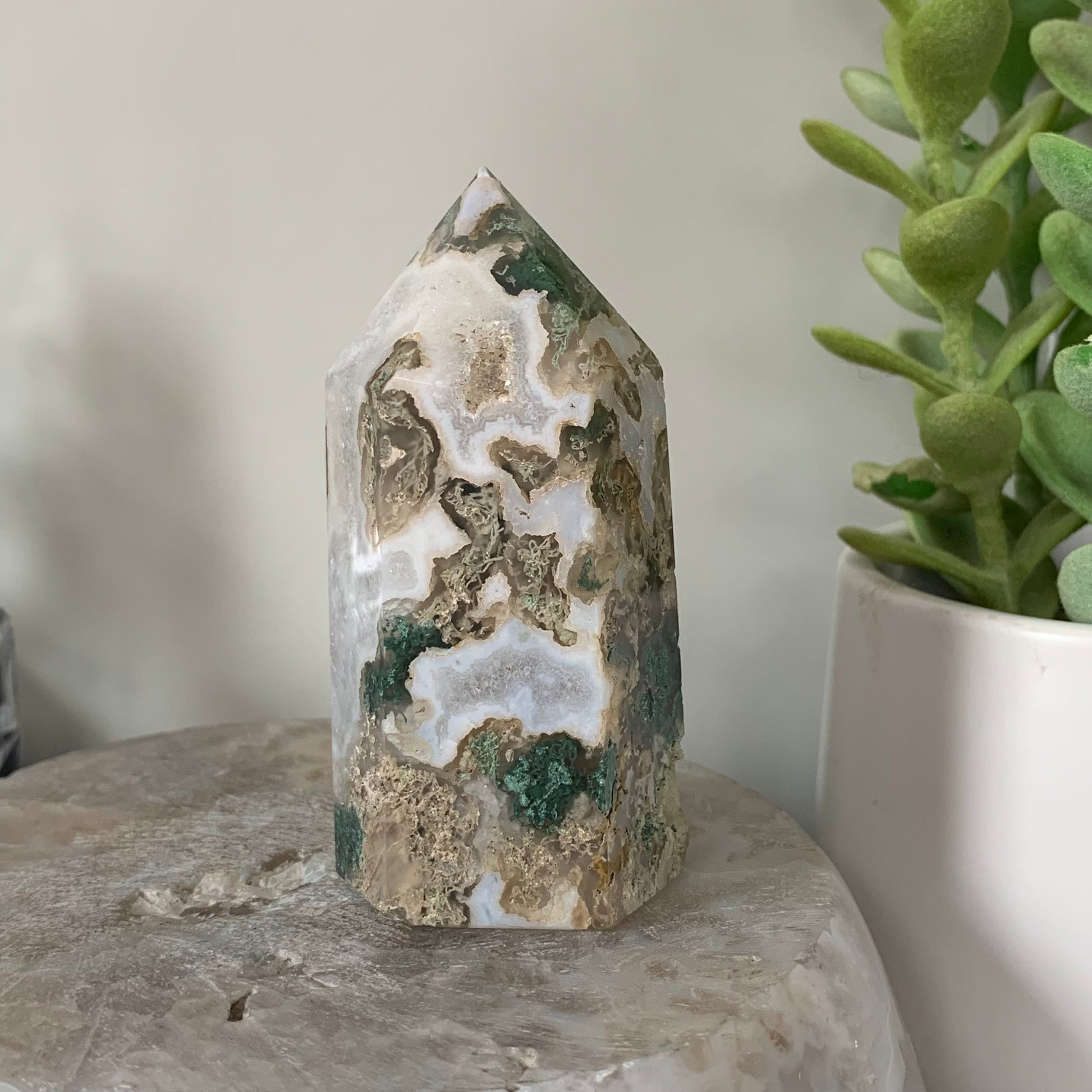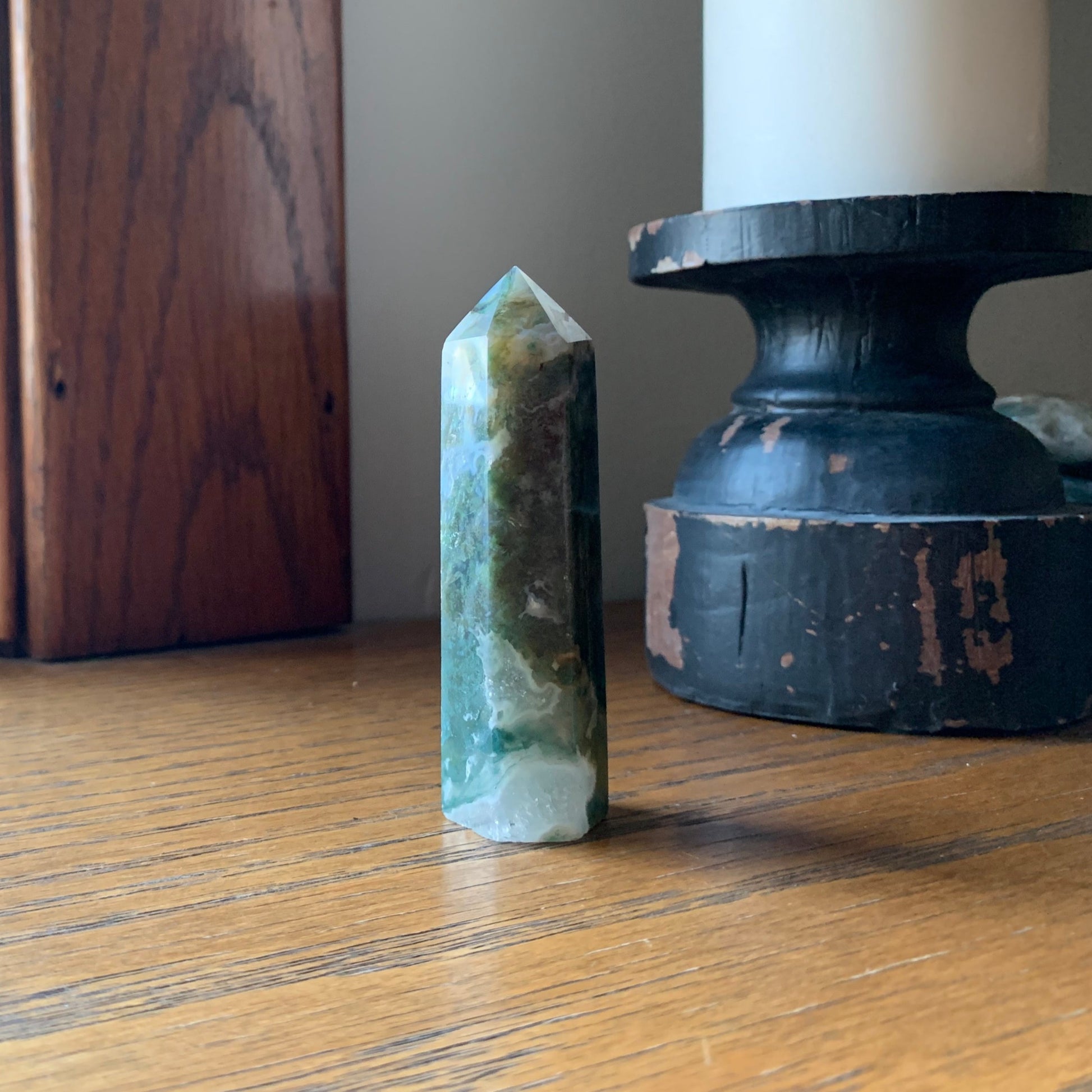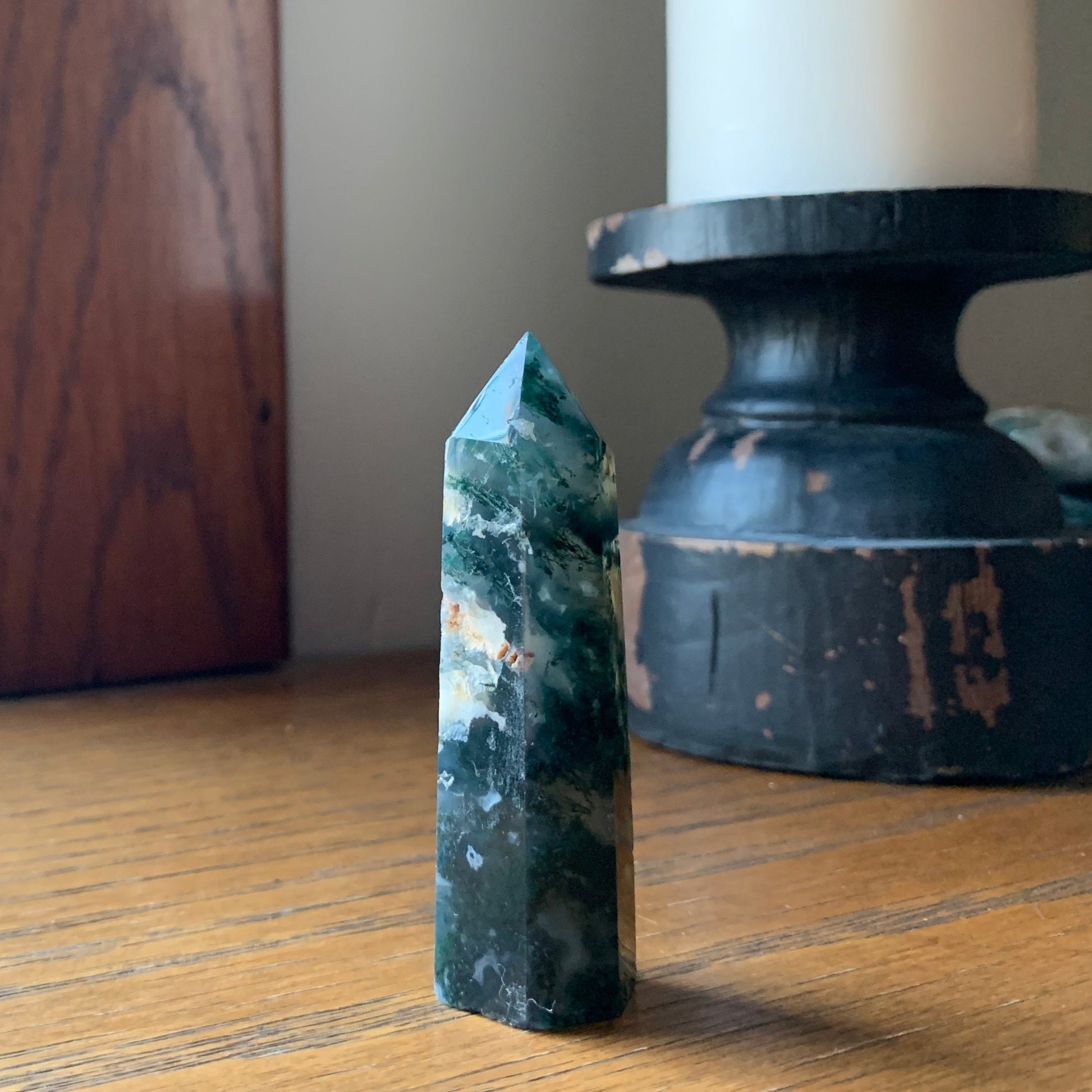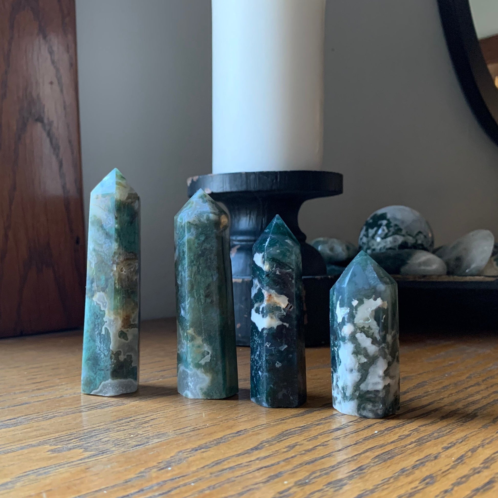 We have quite the collection of Moss Agate Towers--some have druzy and sparkles, some are more clear and translucent, some have purple and blue tones or thinner growth. Either way, you are bound to find something appealing and tranquil for balance.