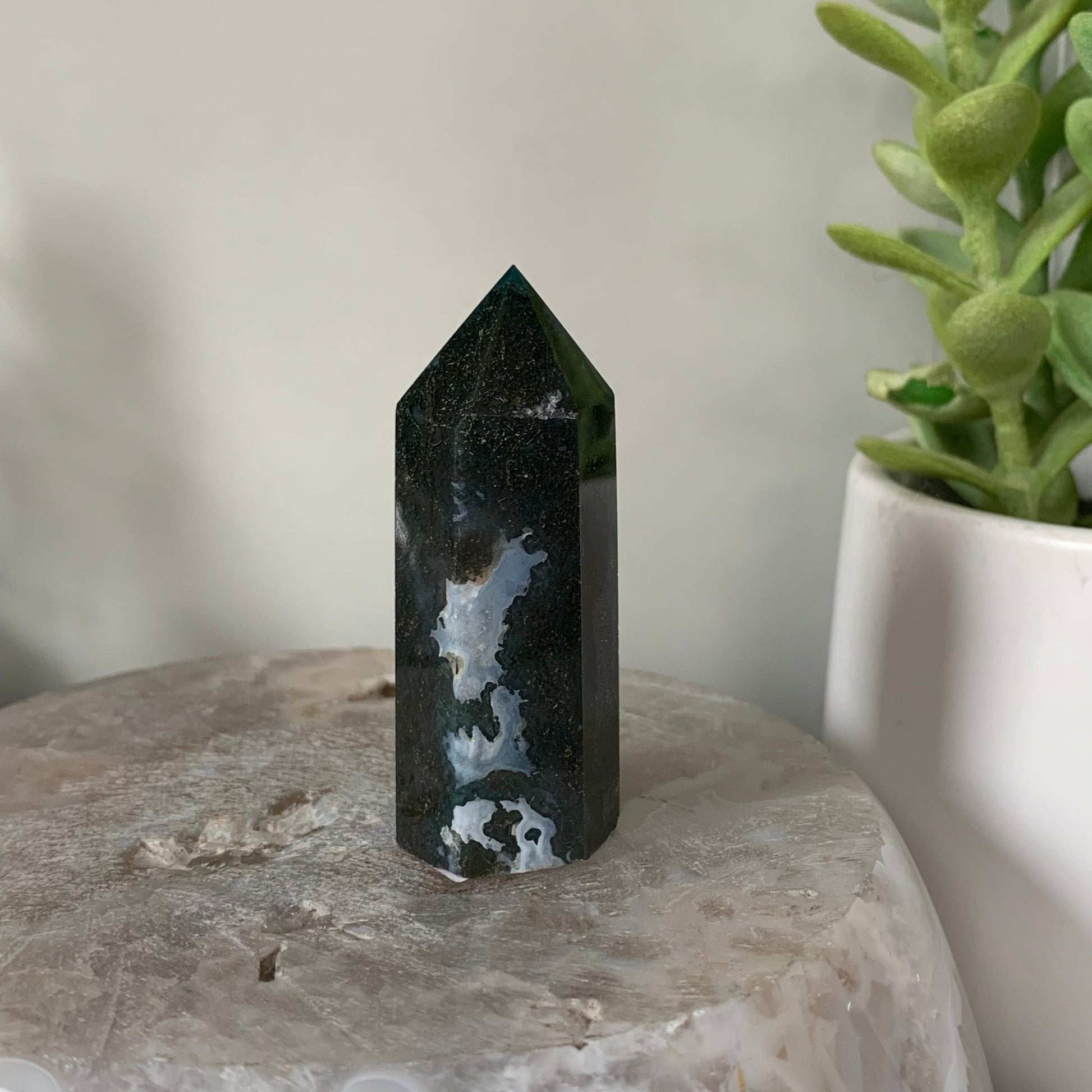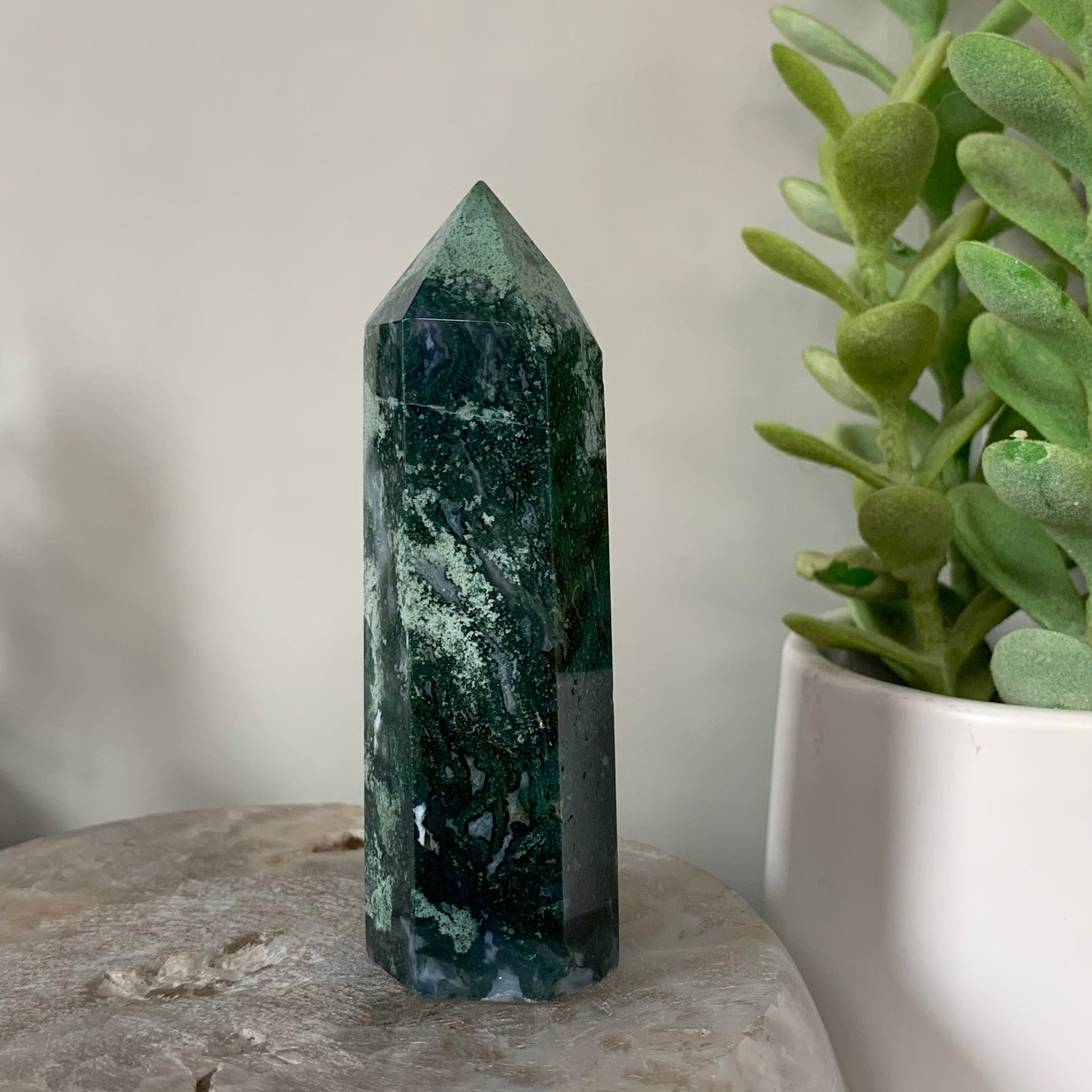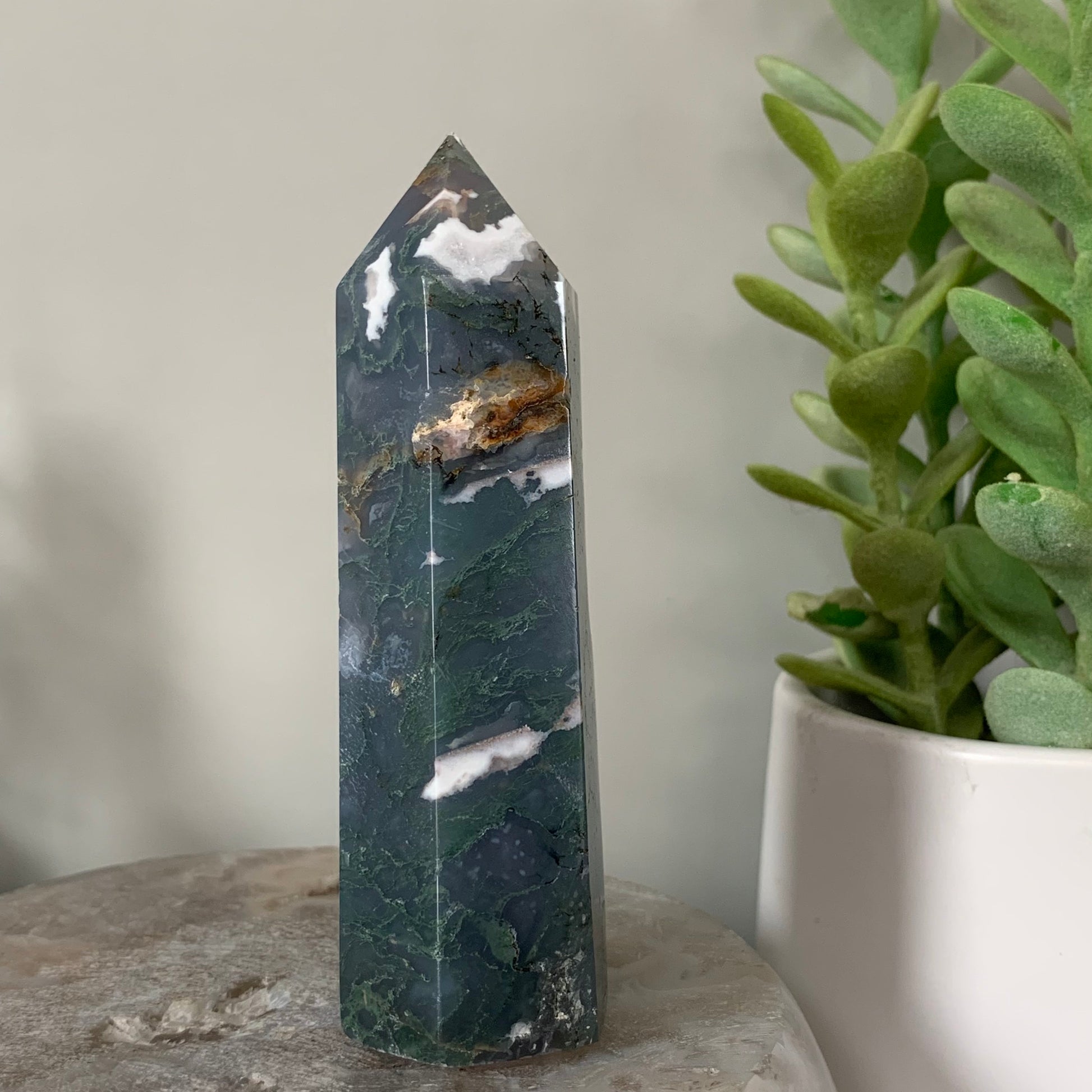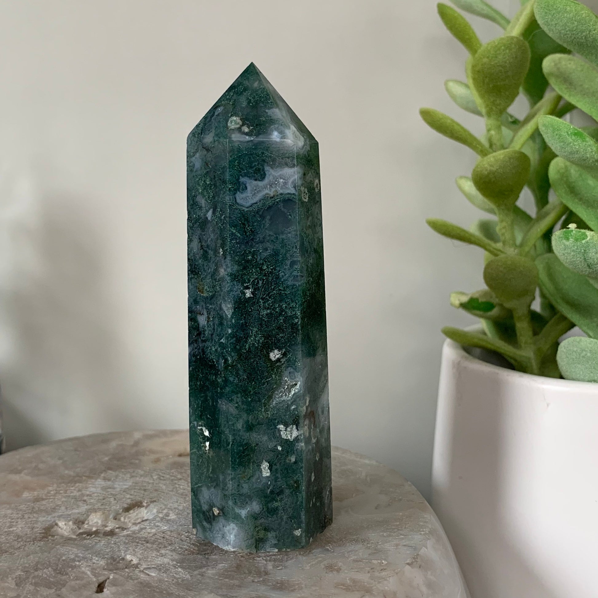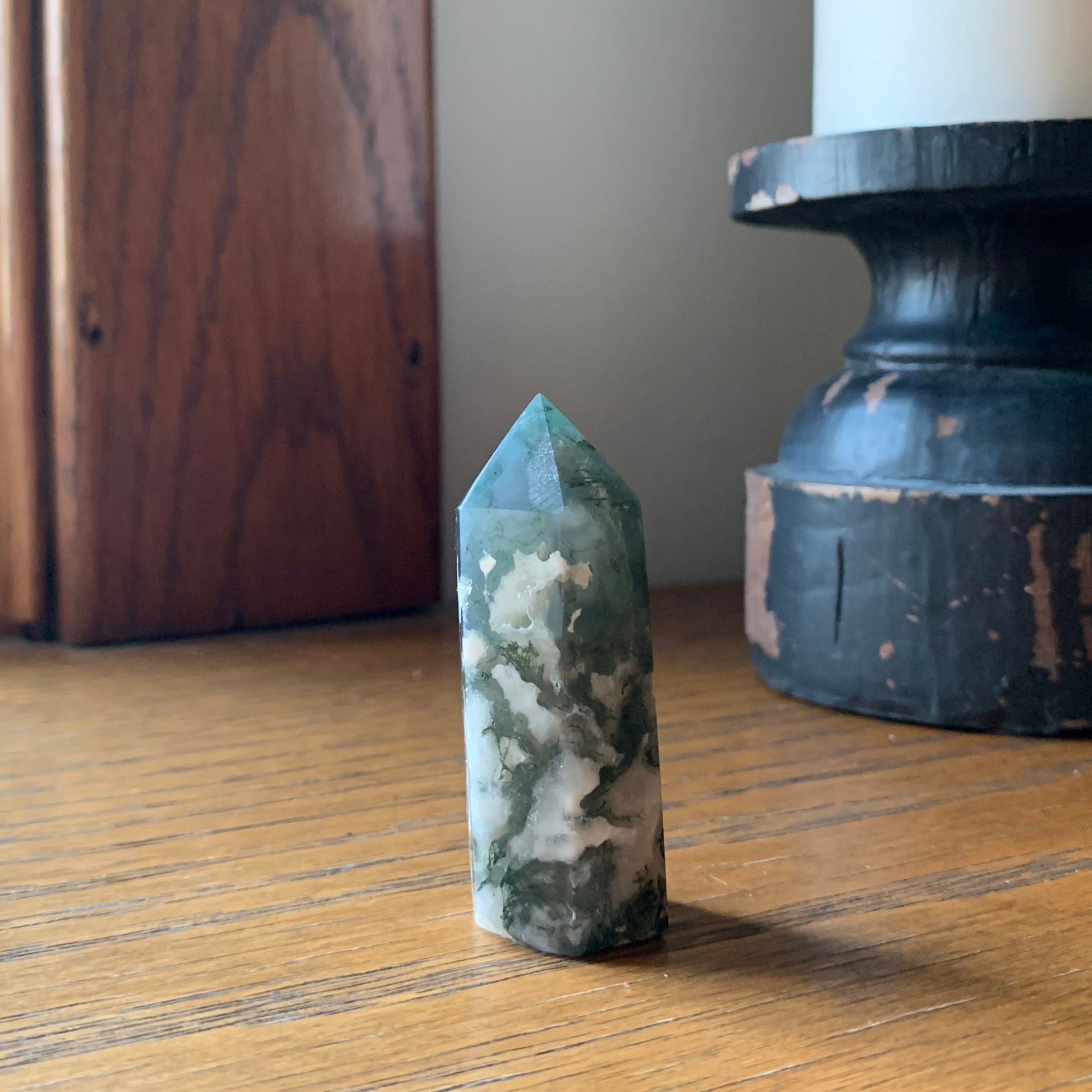 We have quite the collection of Moss Agate Towers--some have druzy and sparkles, some are more clear and translucent, some have purple and blue tones or thinner growth. Either way, you are bound to find something appealing and tranquil for balance.