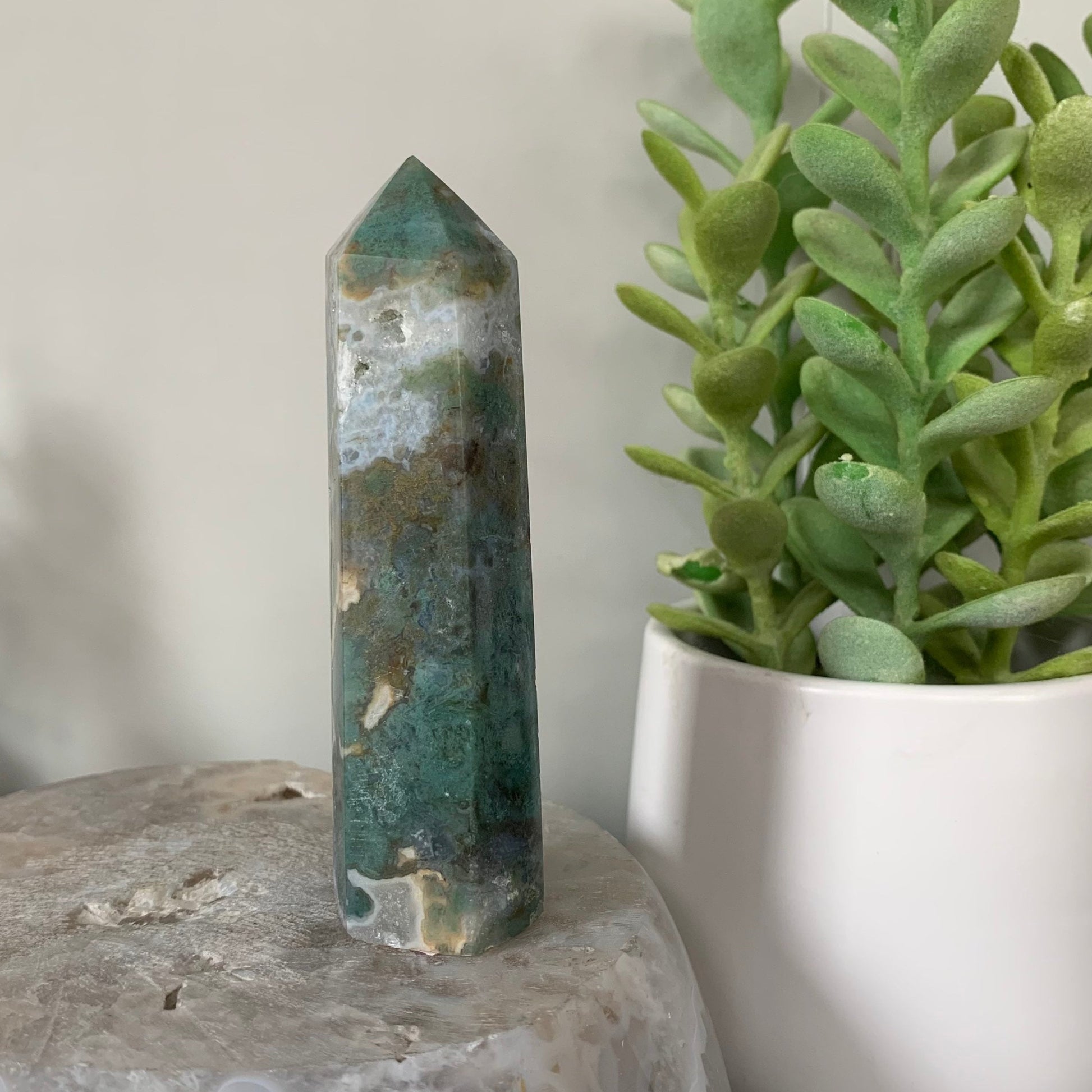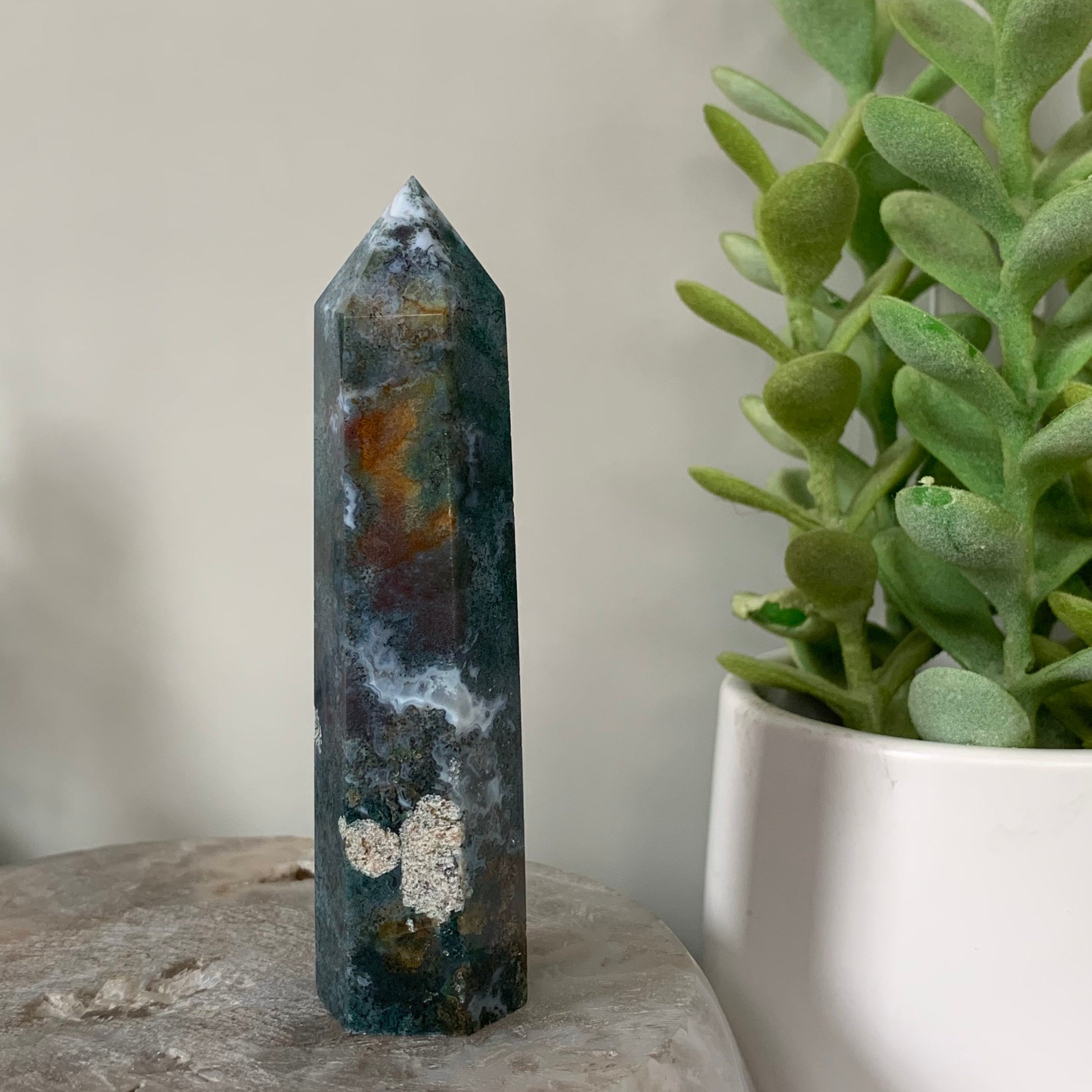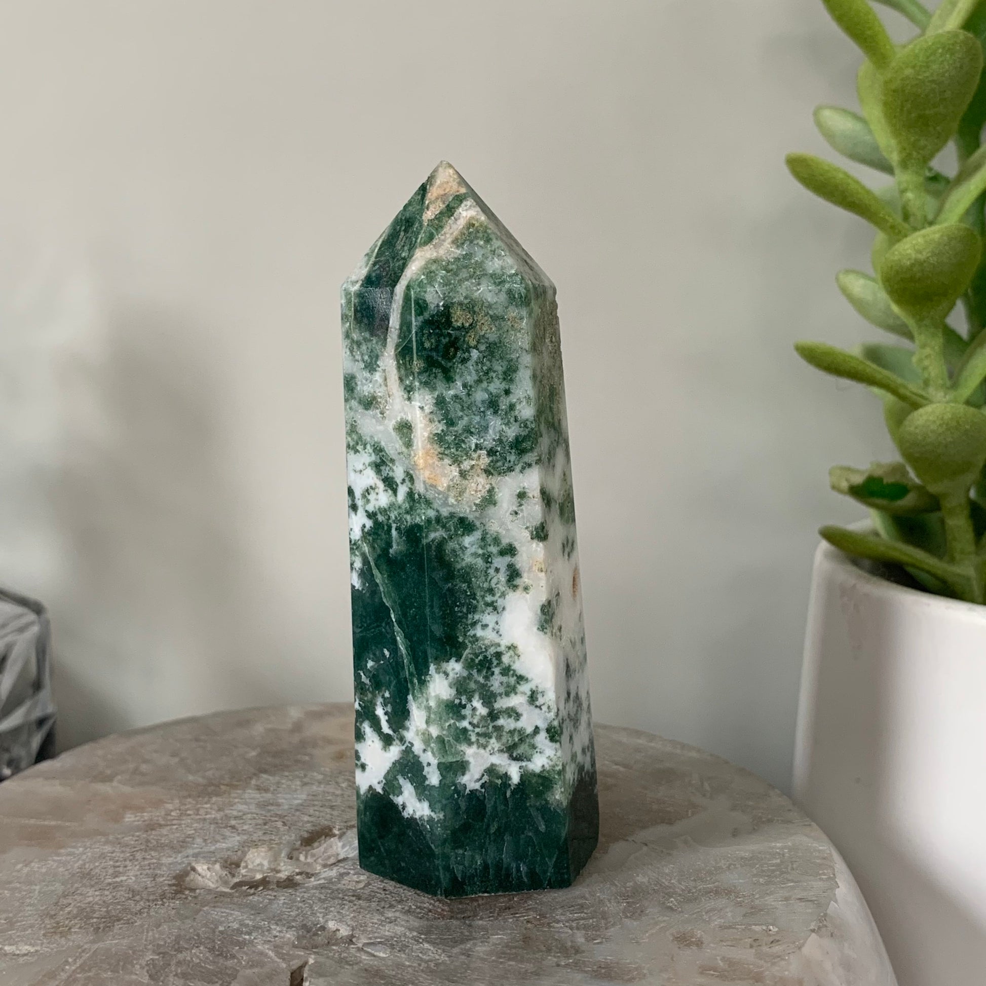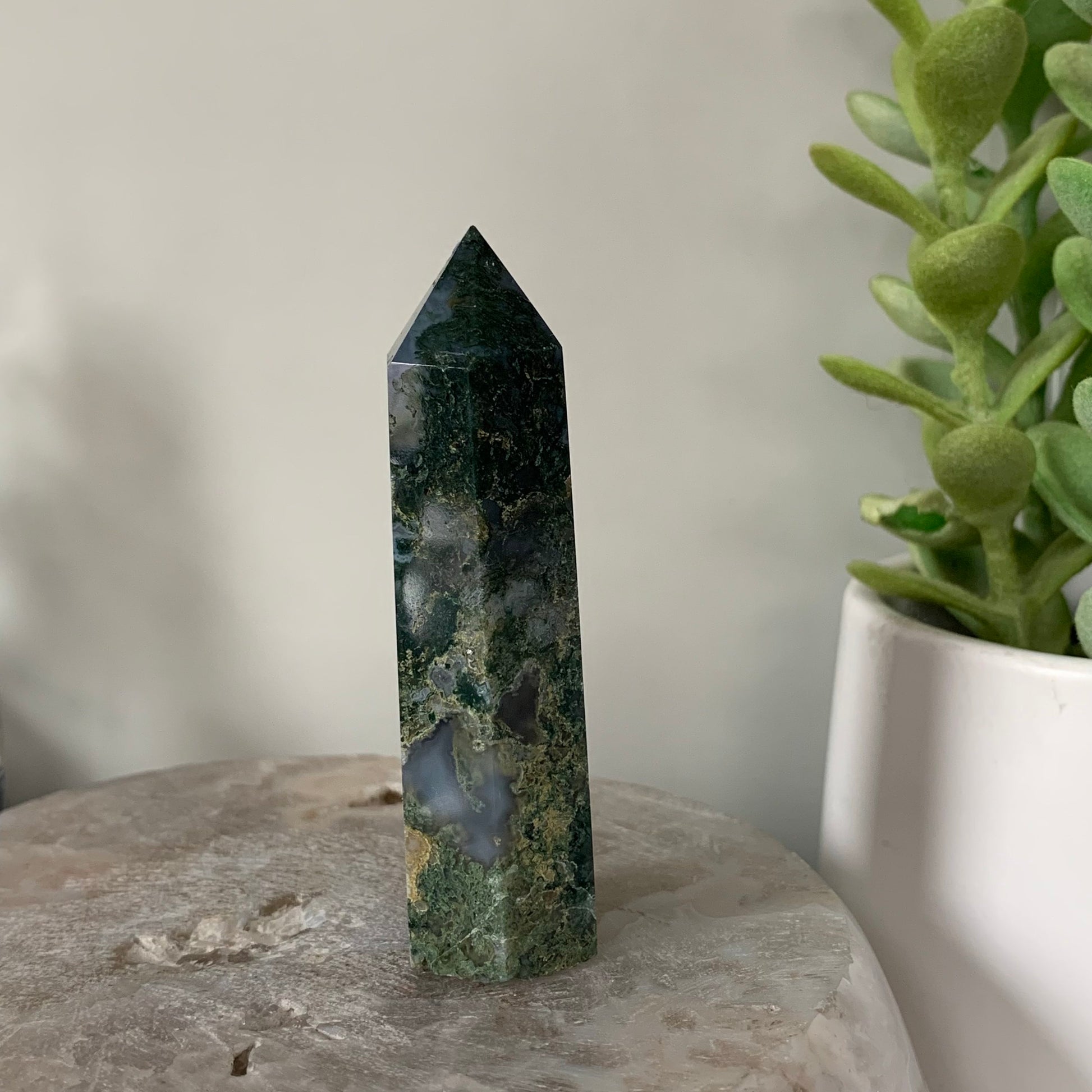 We have quite the collection of Moss Agate Towers--some have druzy and sparkles, some are more clear and translucent, some have purple and blue tones or thinner growth. Either way, you are bound to find something appealing and tranquil for balance.
