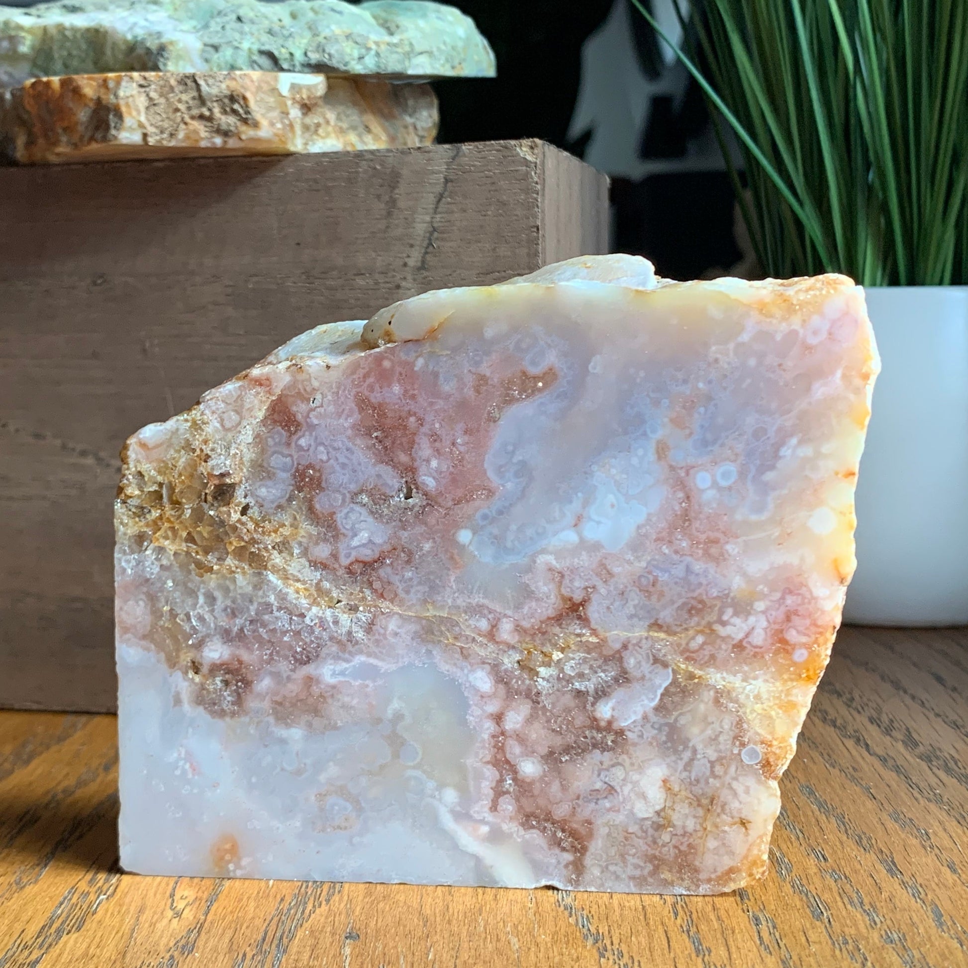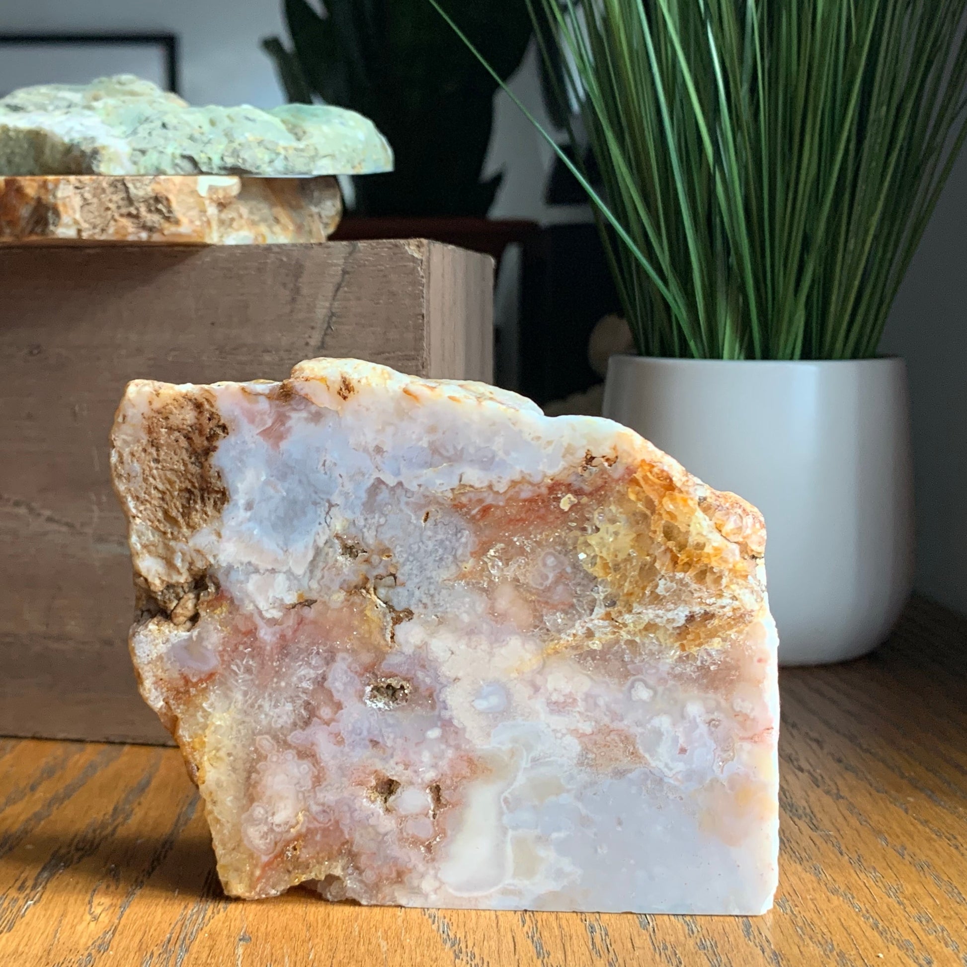 We are in love with these Flower Agate Mini Slabs. These can be displayed as a decorative item, used as a base for an altar or hung on a wall. This slab has a solid finished edge on two sides and stands on it's own. Both front and back are polished. See photos.