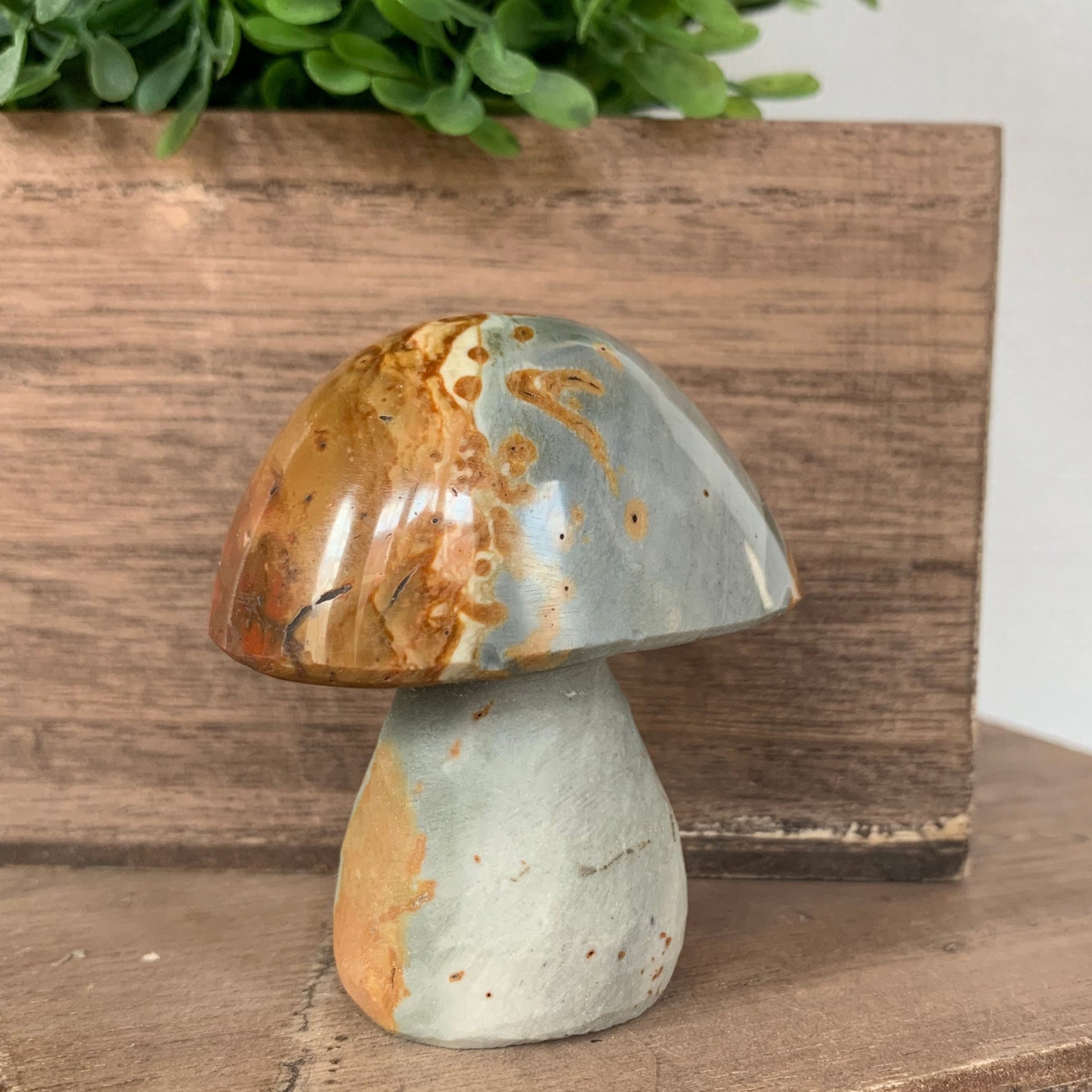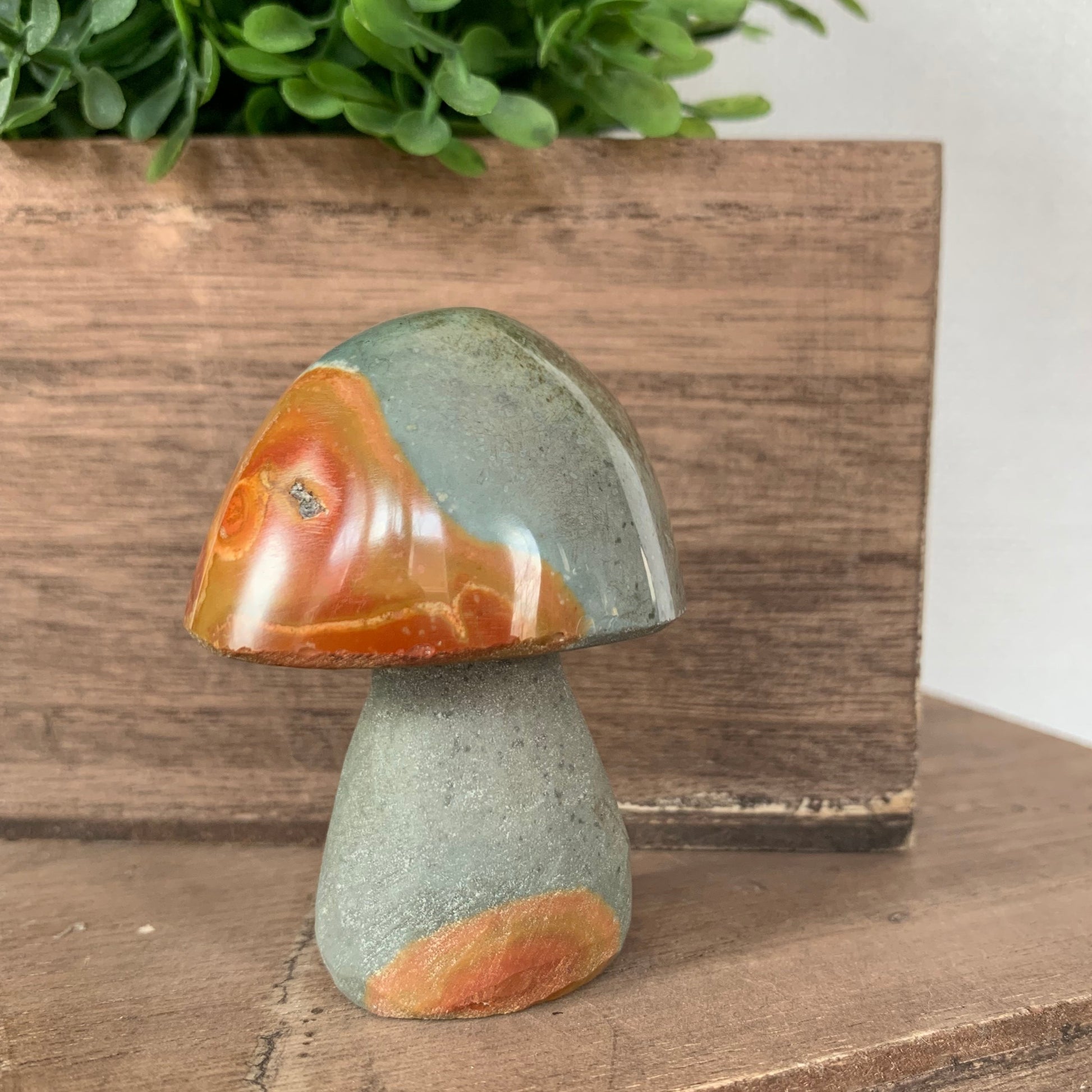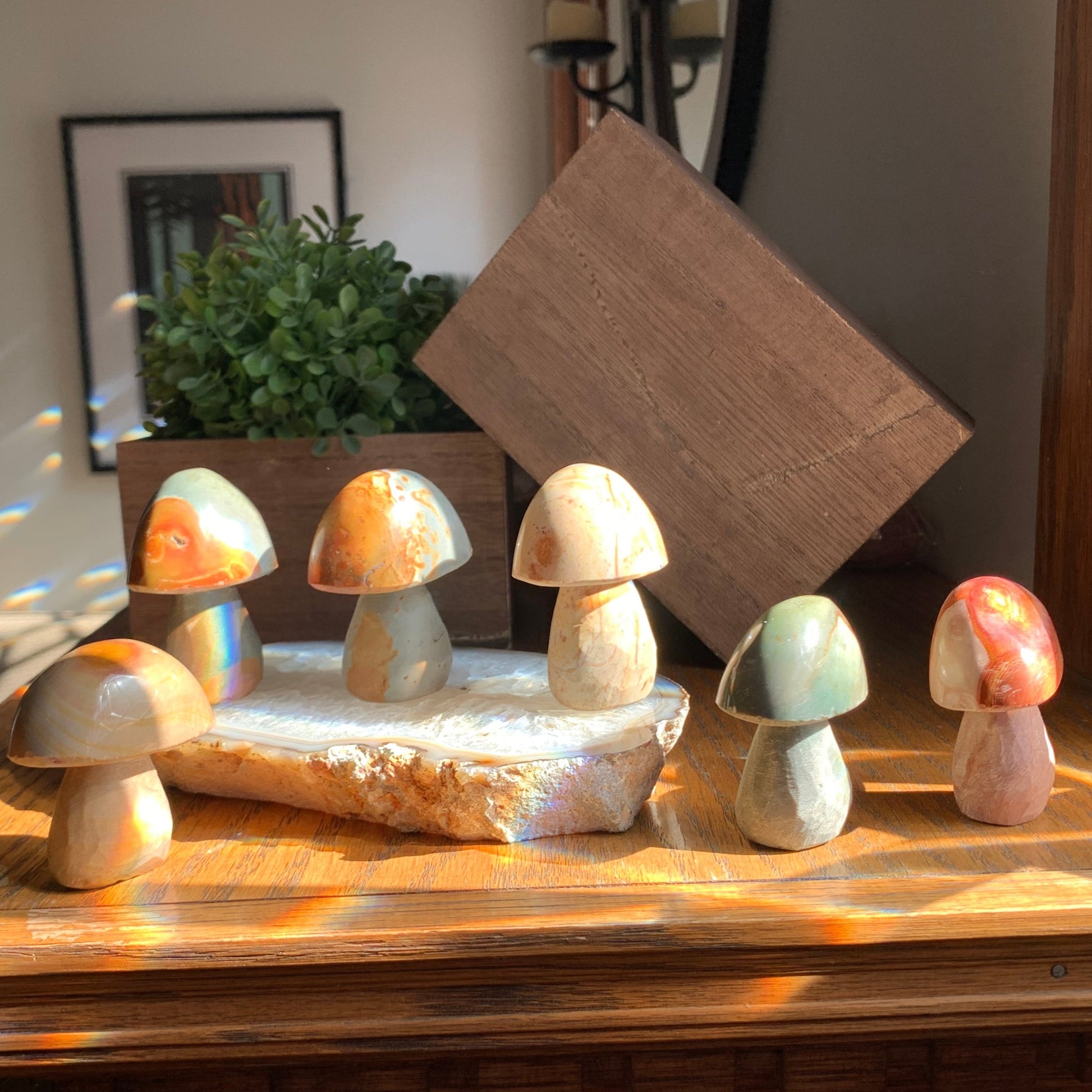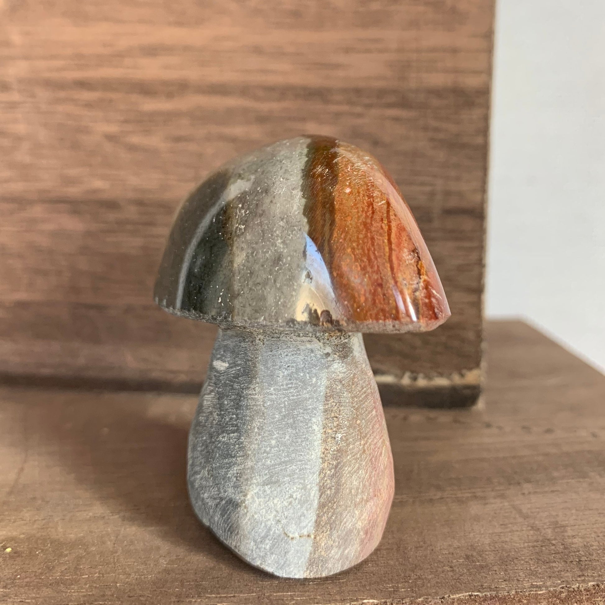 Polychrome Jasper comes in a variety of colors. It is a stabilizing stone connecting and grounding us. How delightful to have these mushroom shapes to bring the energy full circle.
