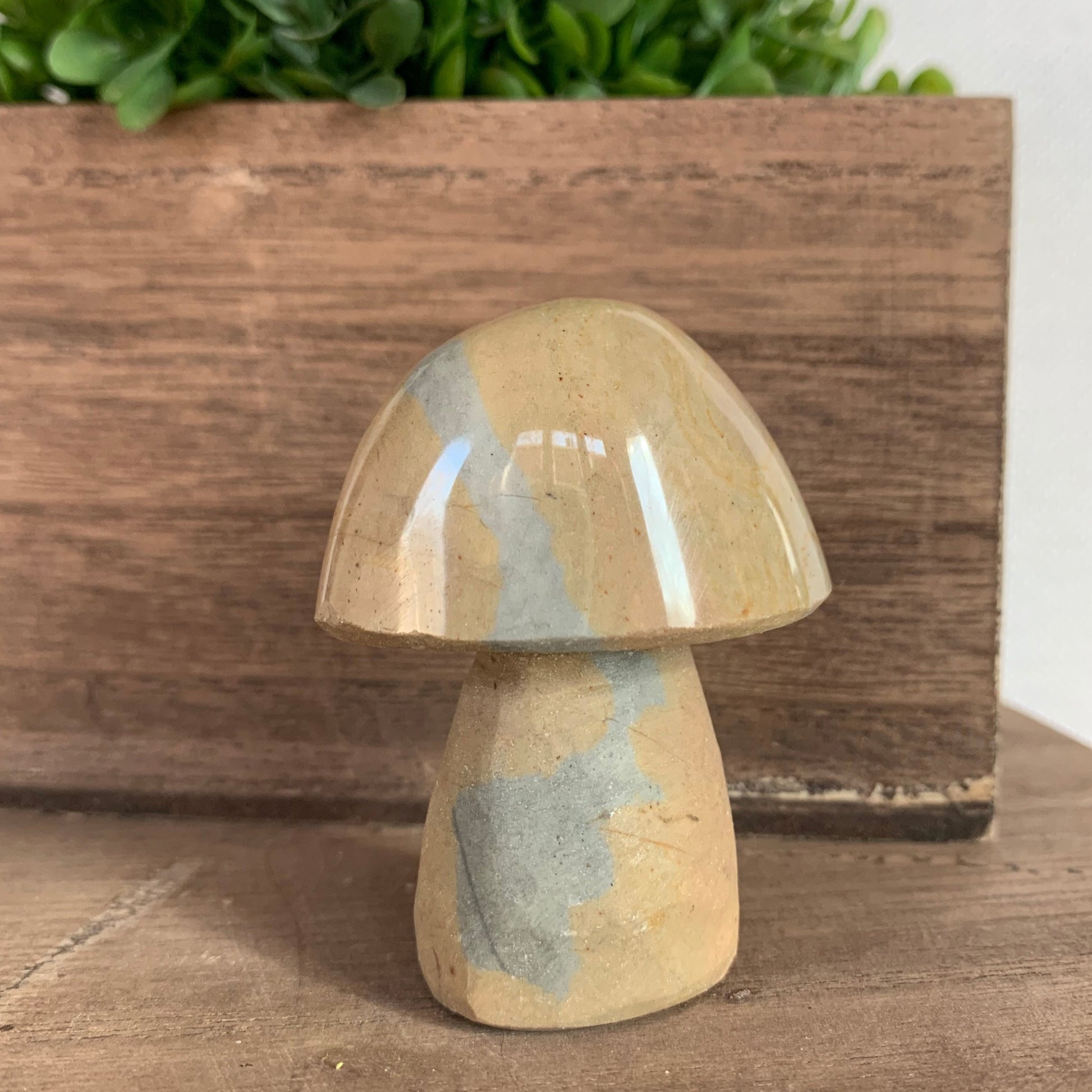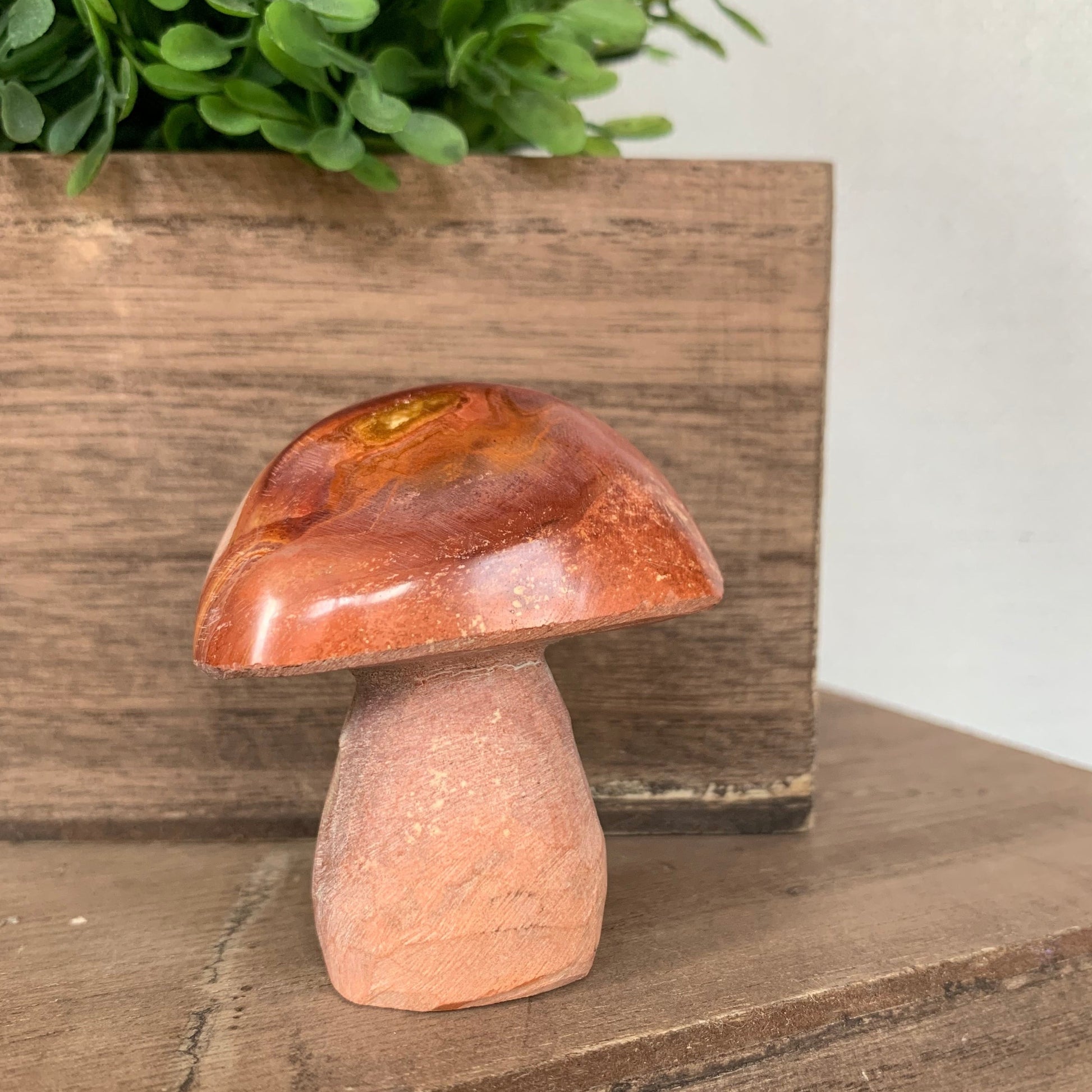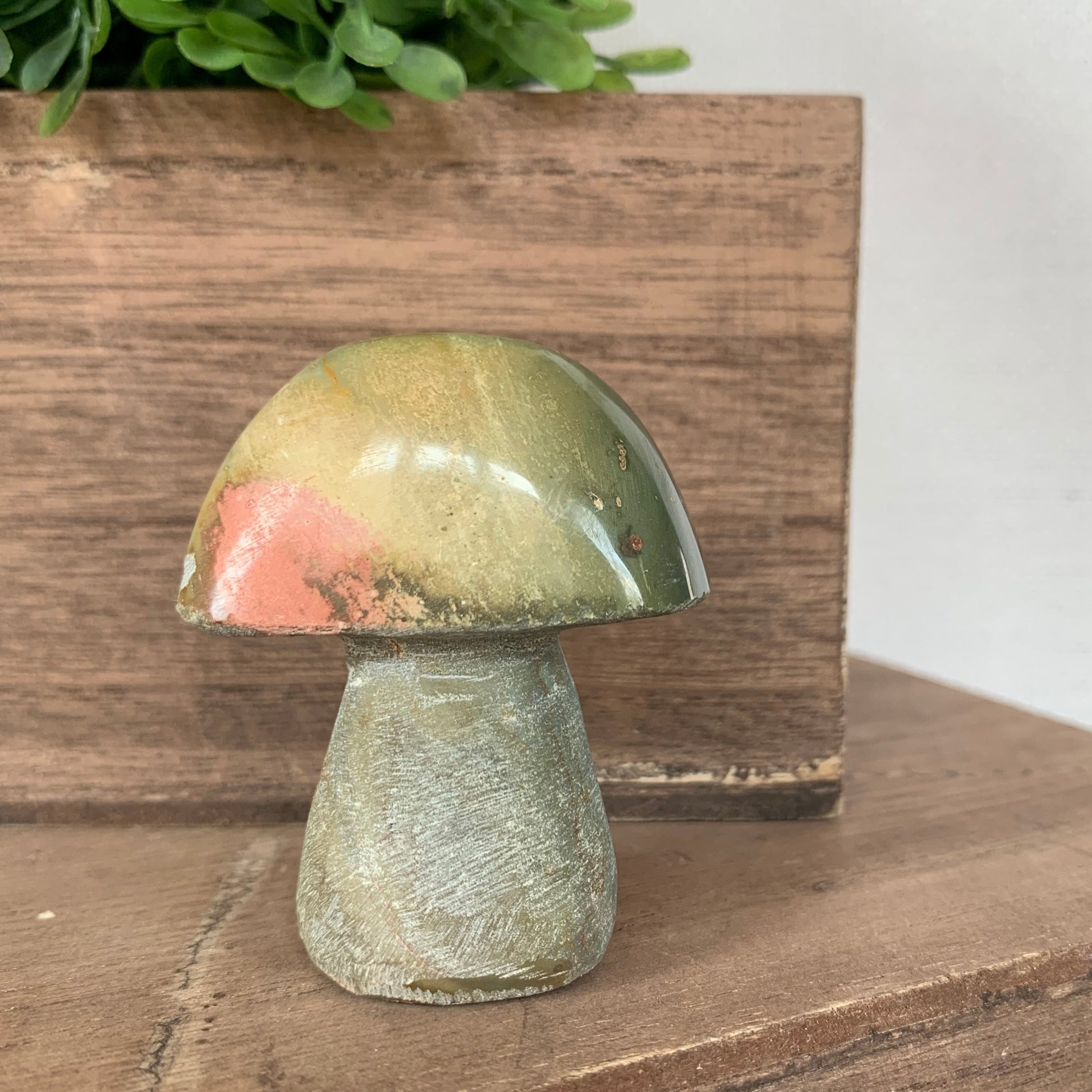 Polychrome Jasper comes in a variety of colors. It is a stabilizing stone connecting and grounding us. How delightful to have these mushroom shapes to bring the energy full circle.
