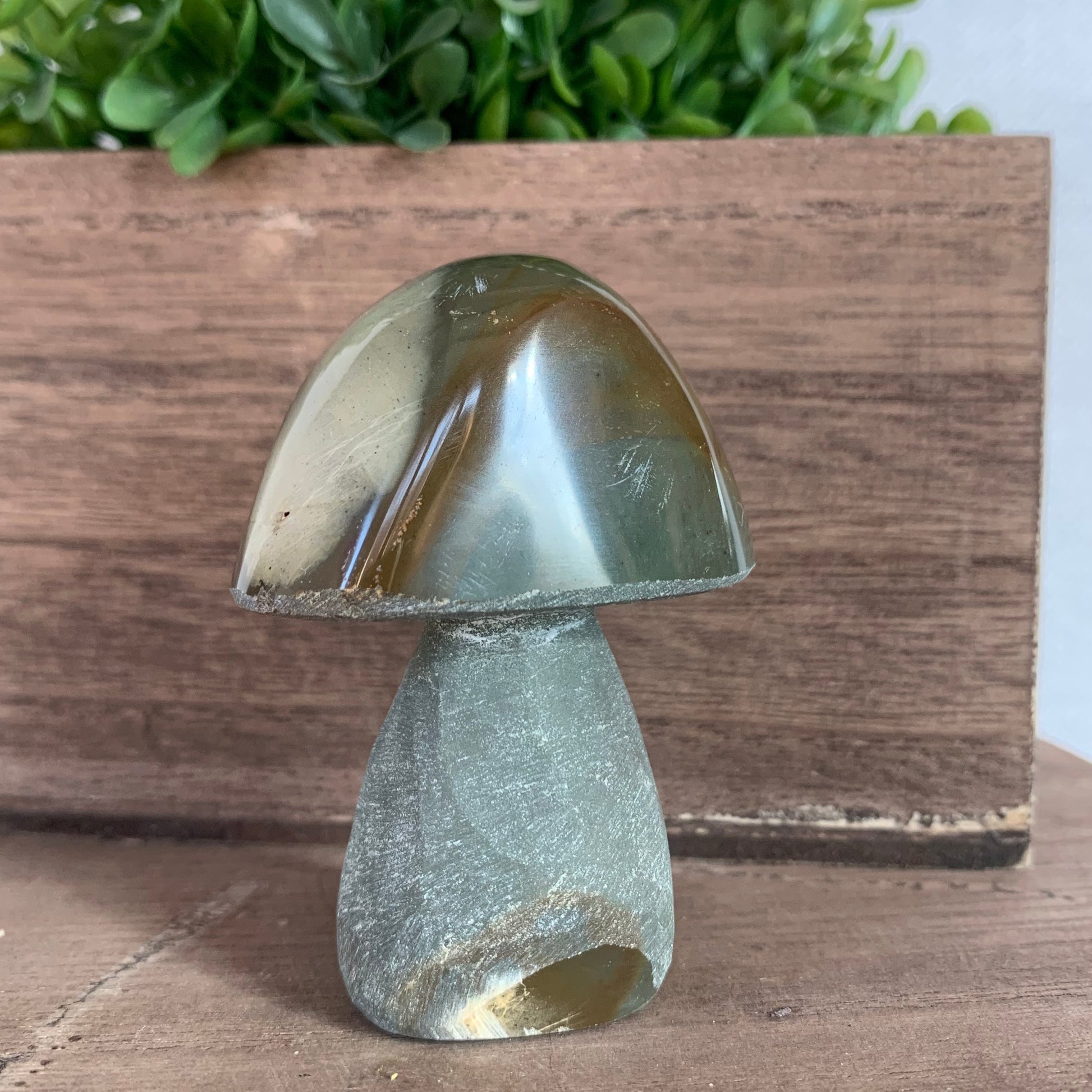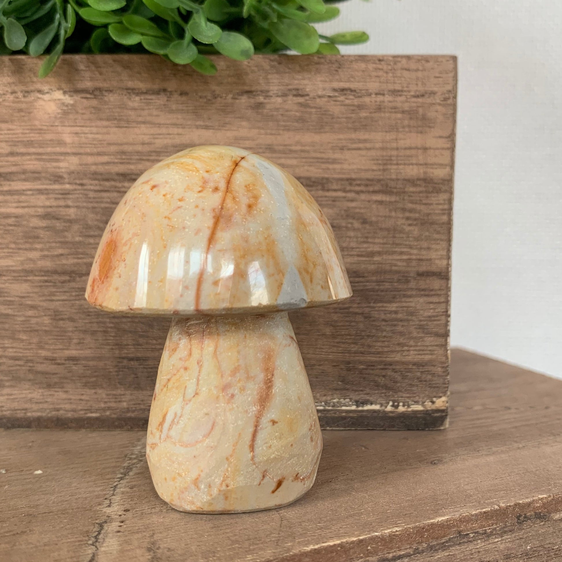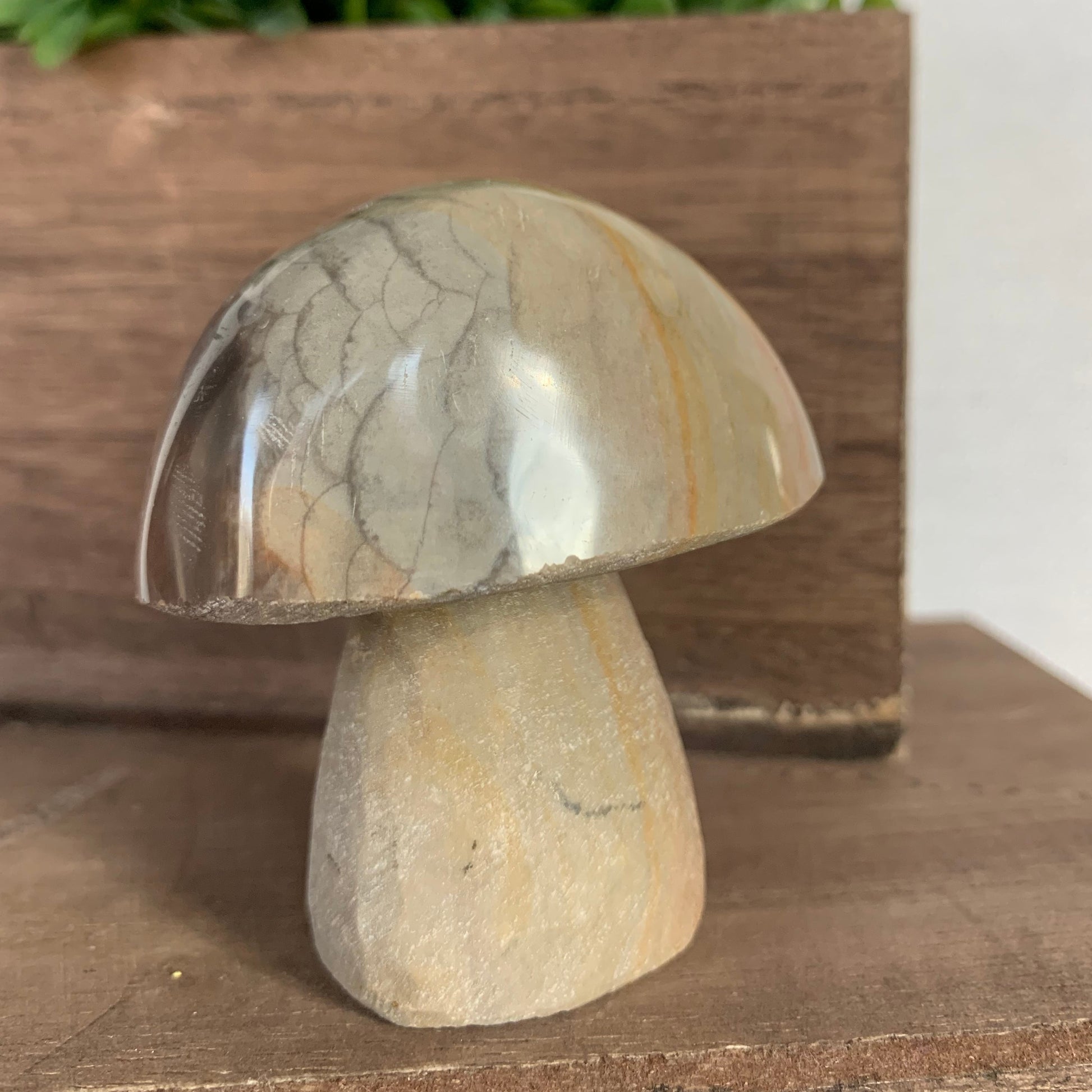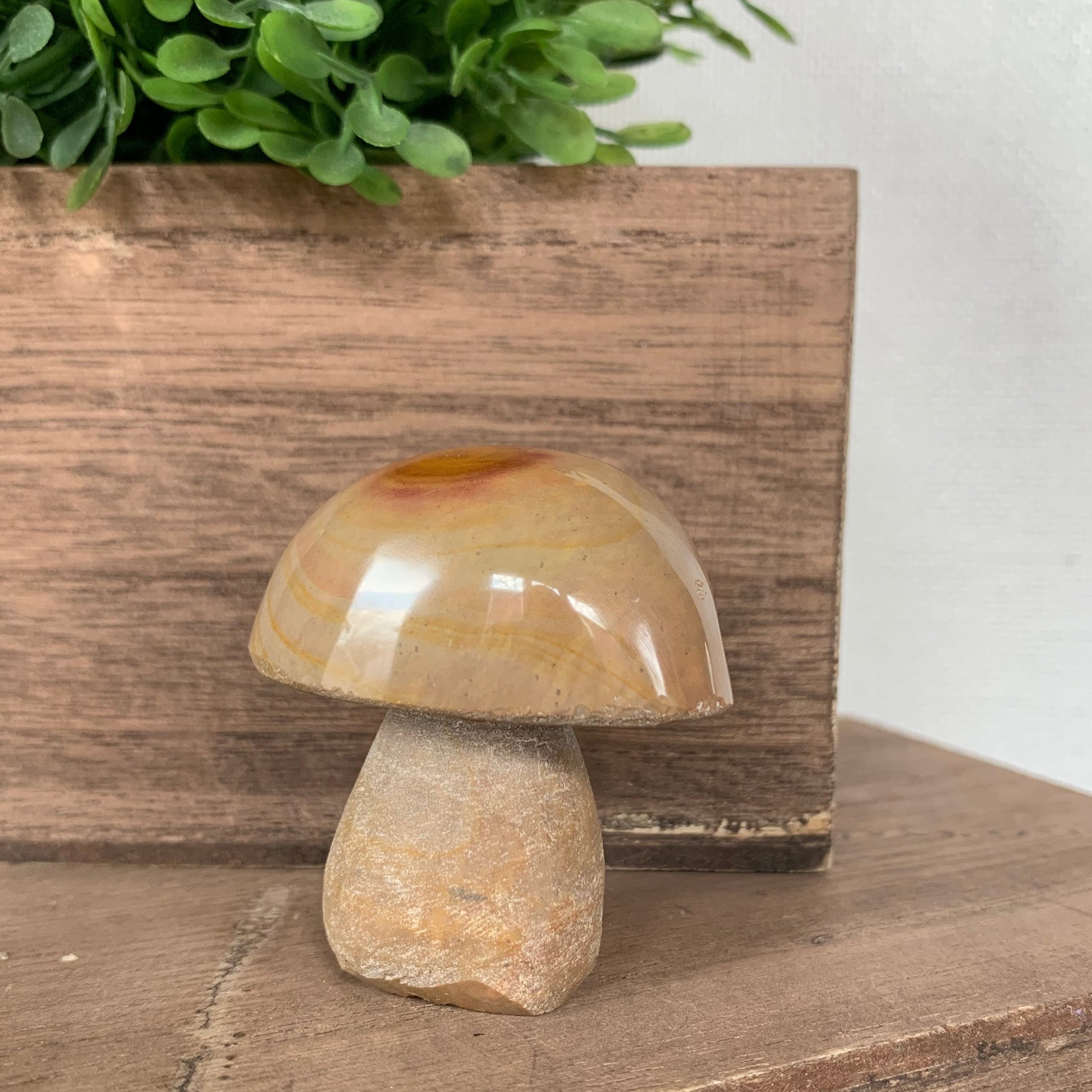 Polychrome Jasper comes in a variety of colors. It is a stabilizing stone connecting and grounding us. How delightful to have these mushroom shapes to bring the energy full circle.