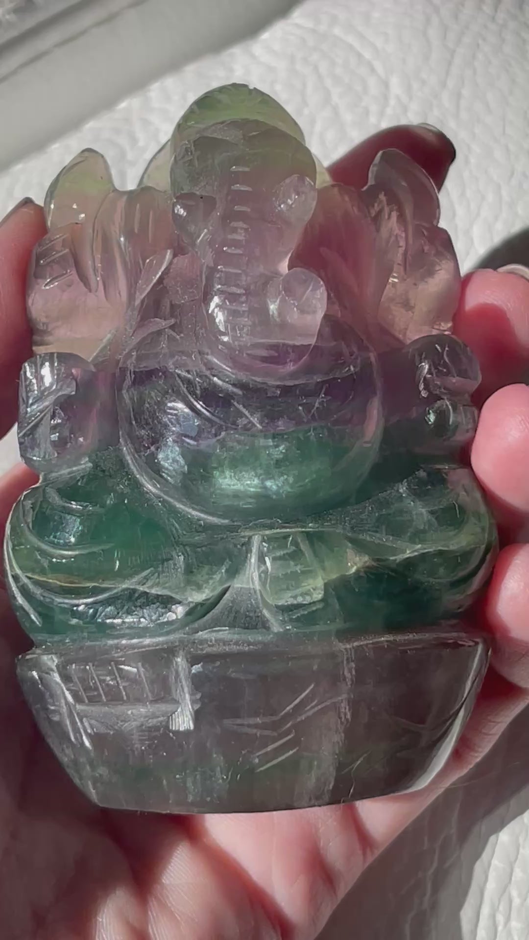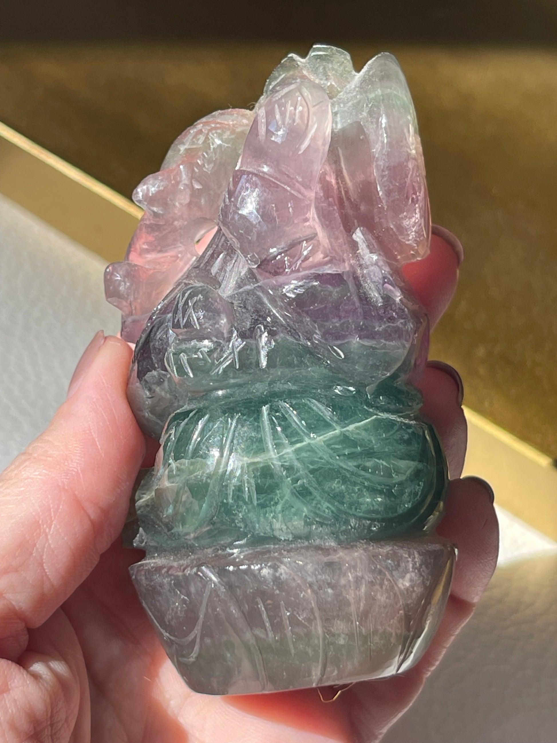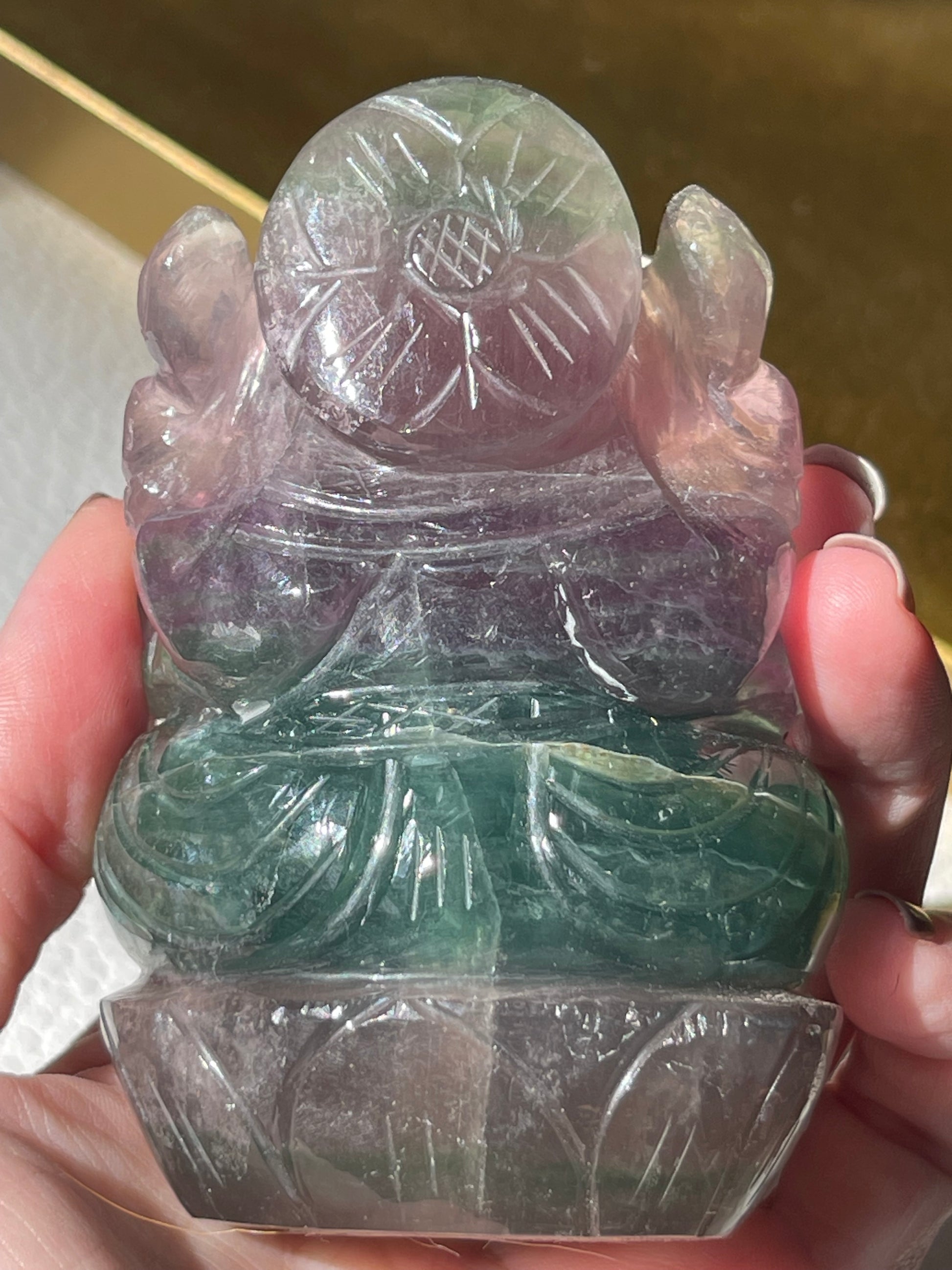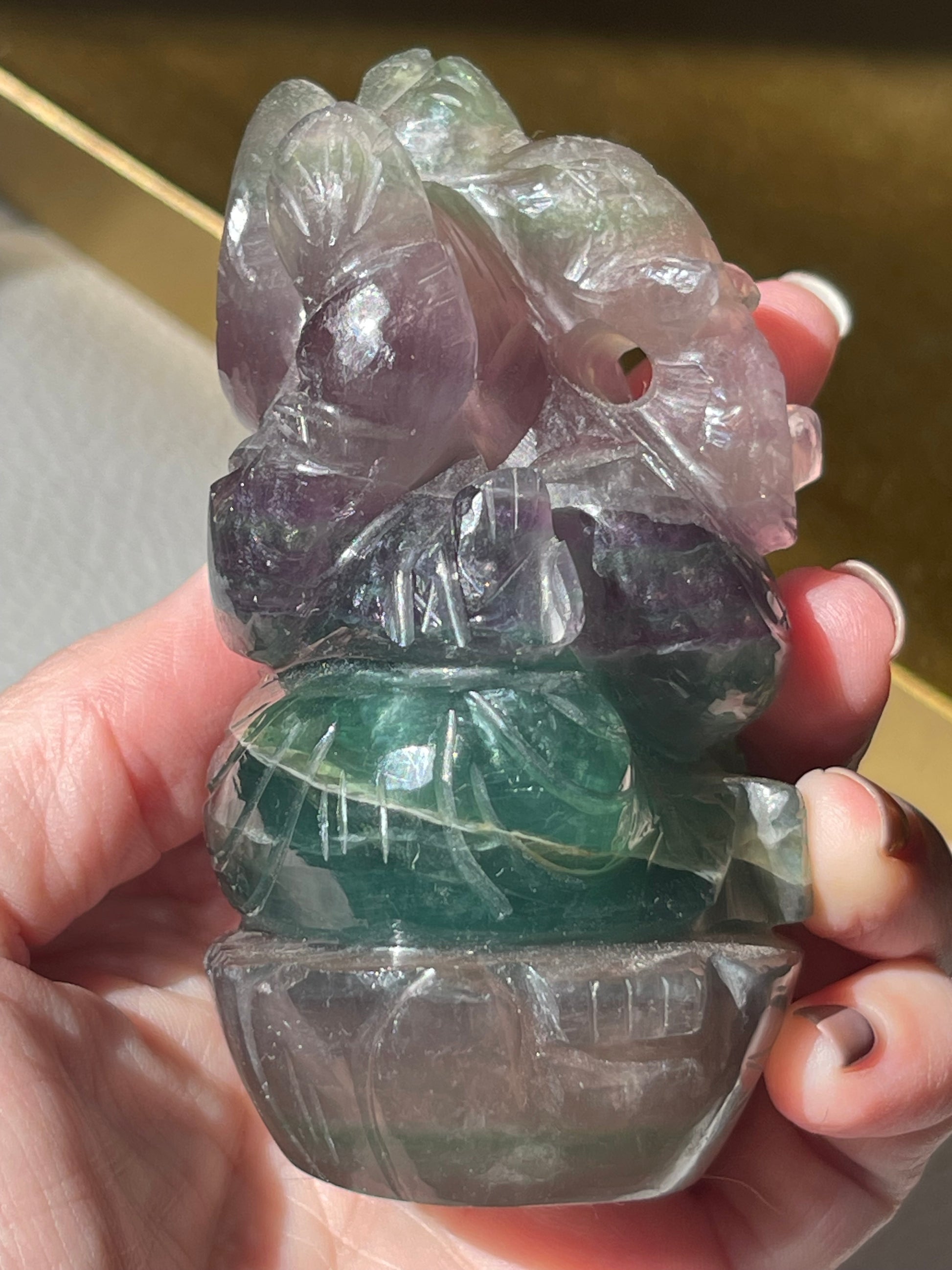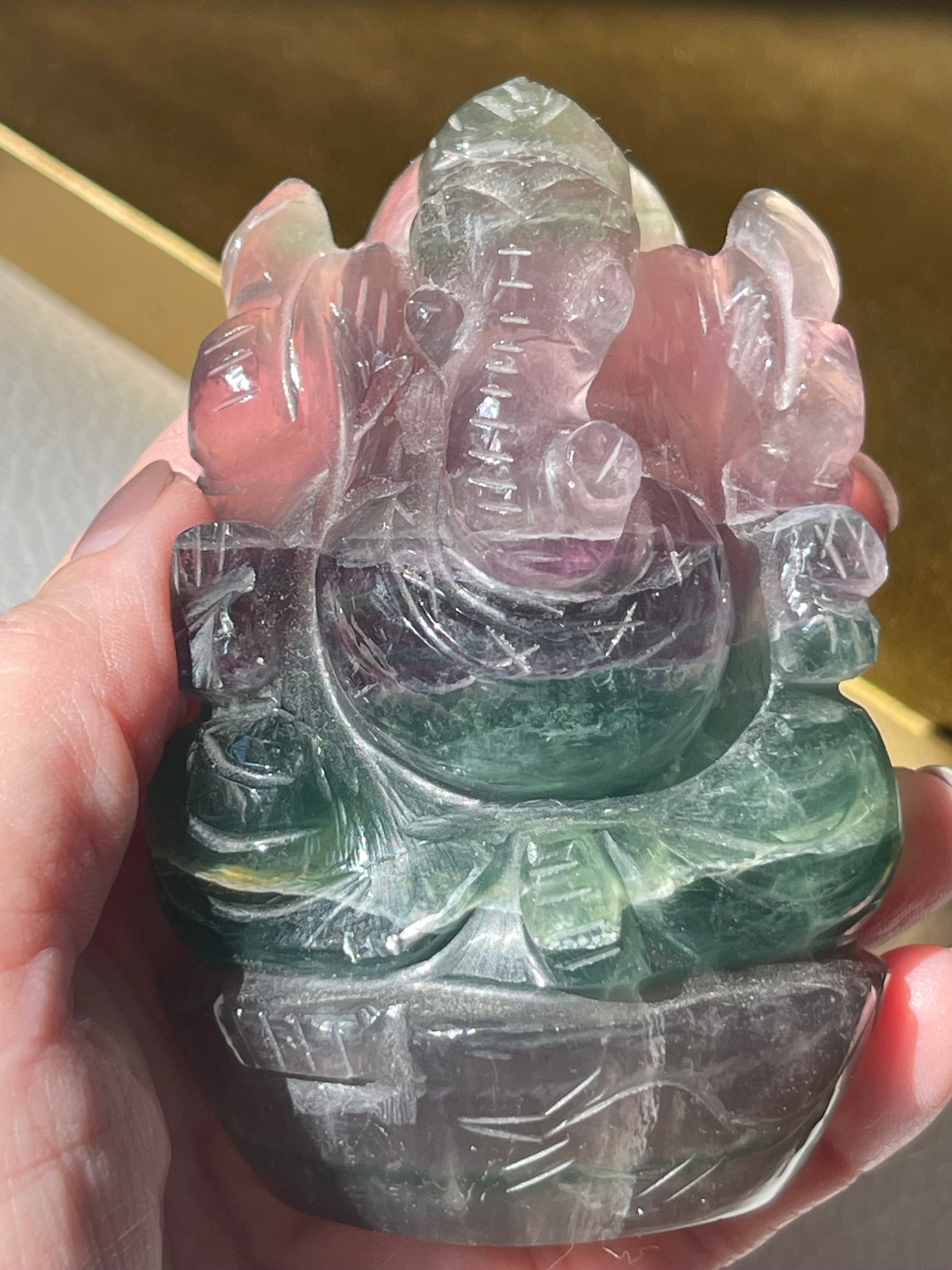 We are so honored to offer this hand carved Lord Ganesha carving from India made of Rainbow Fluorite.