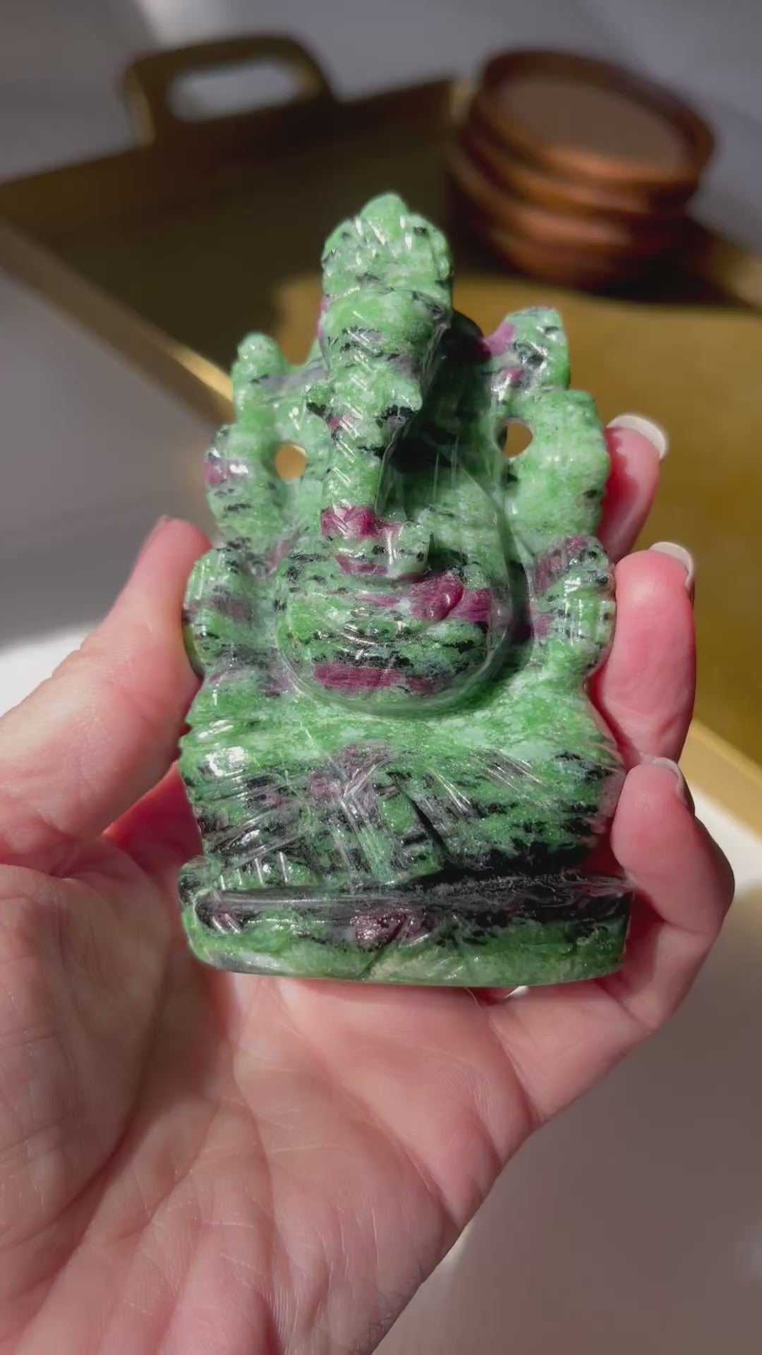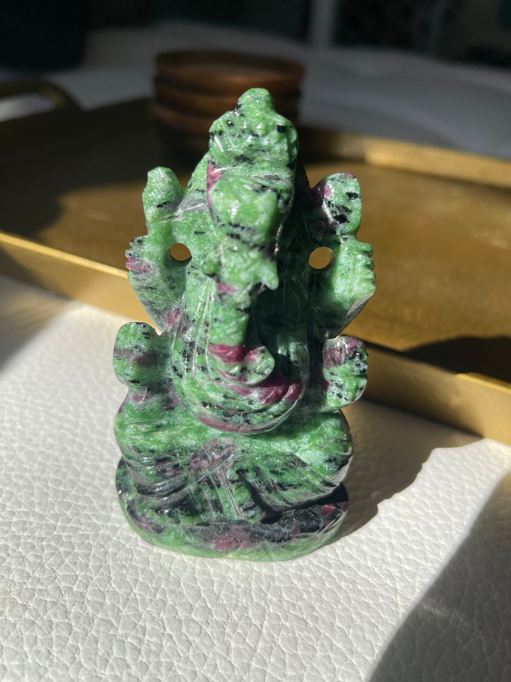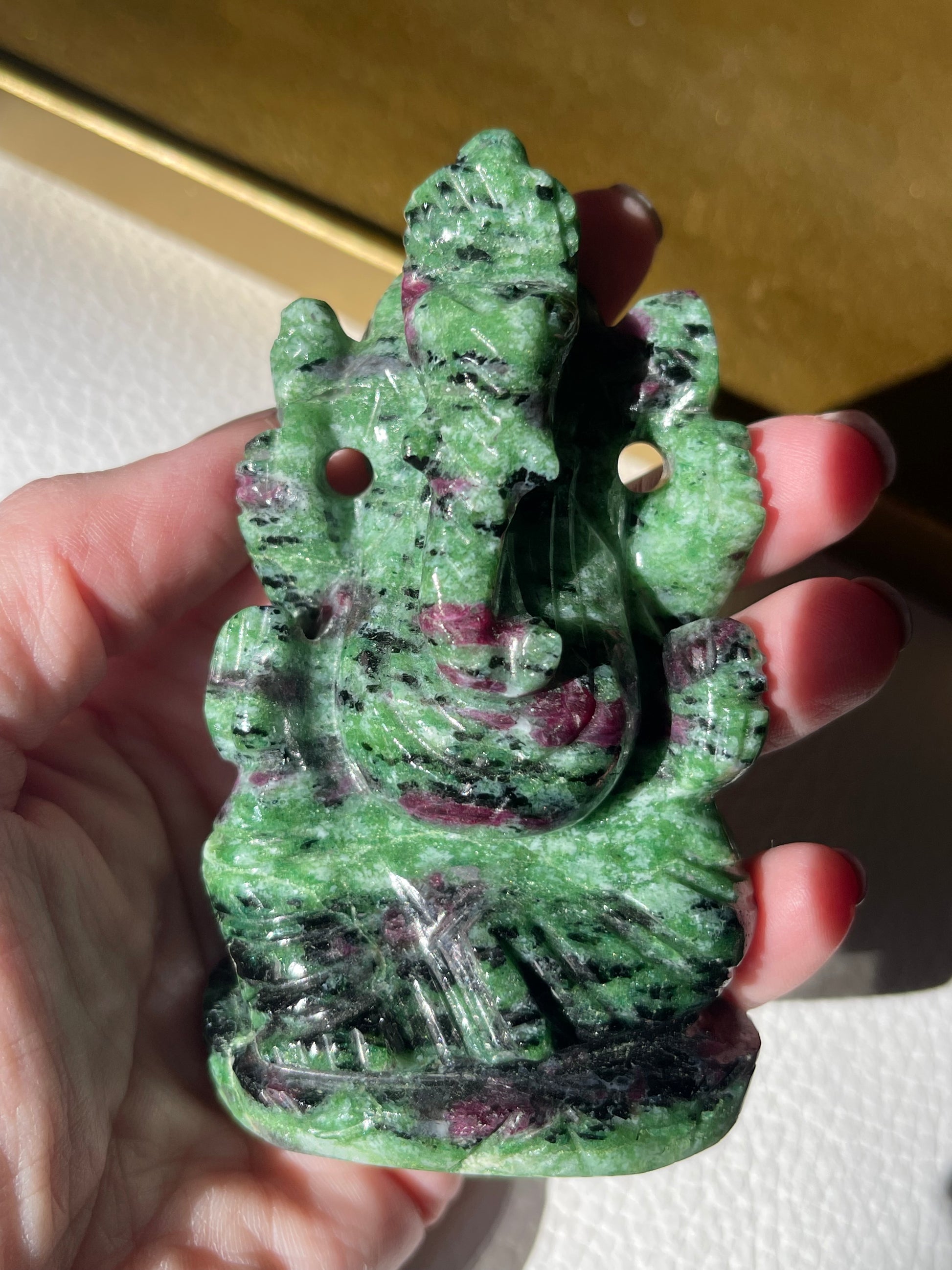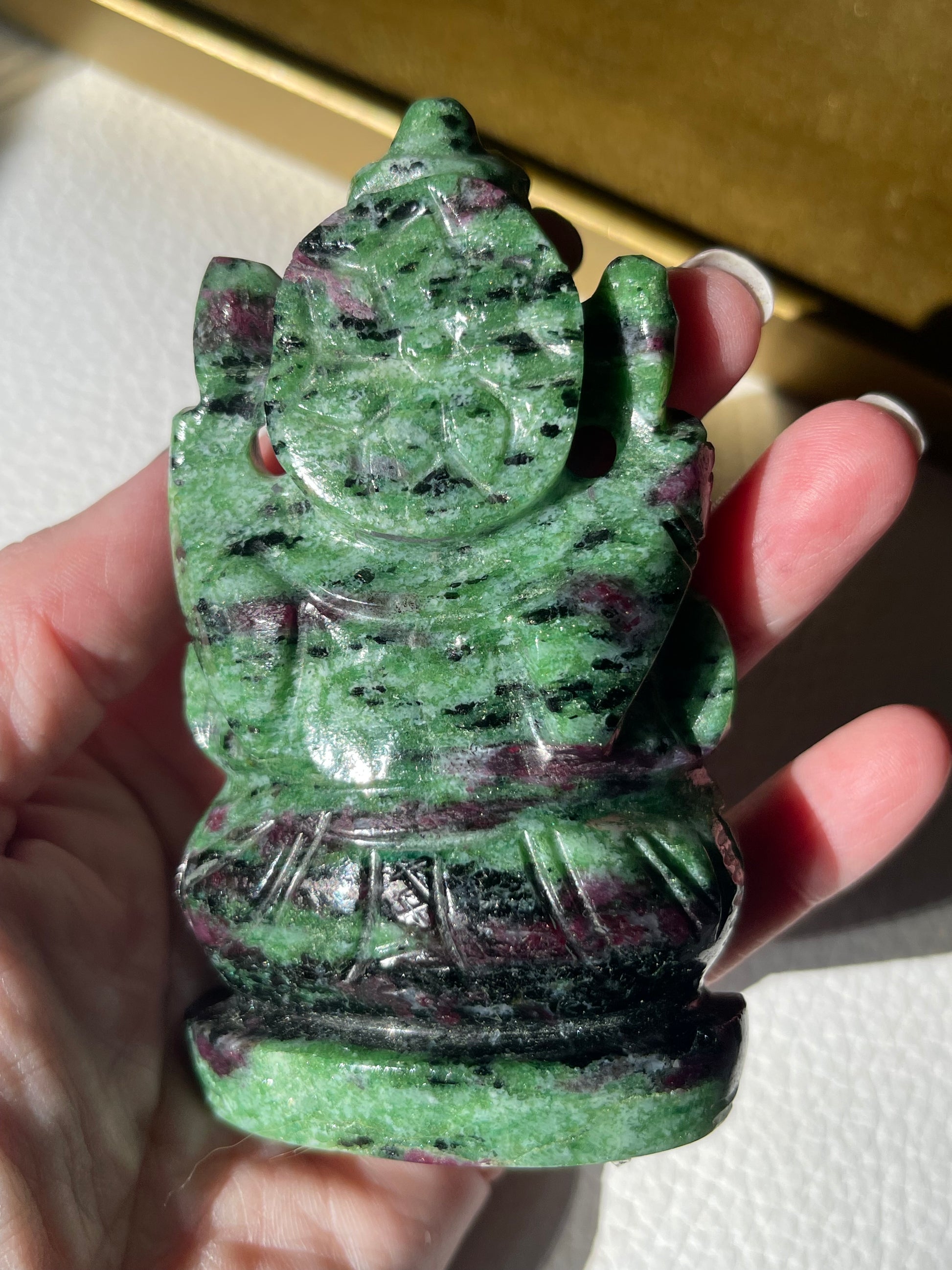 We are so honored to offer this hand carved Lord Ganesha carving from India made of Ruby Zoisite.