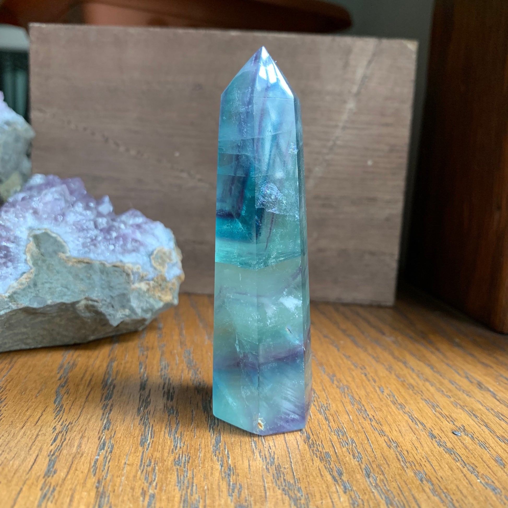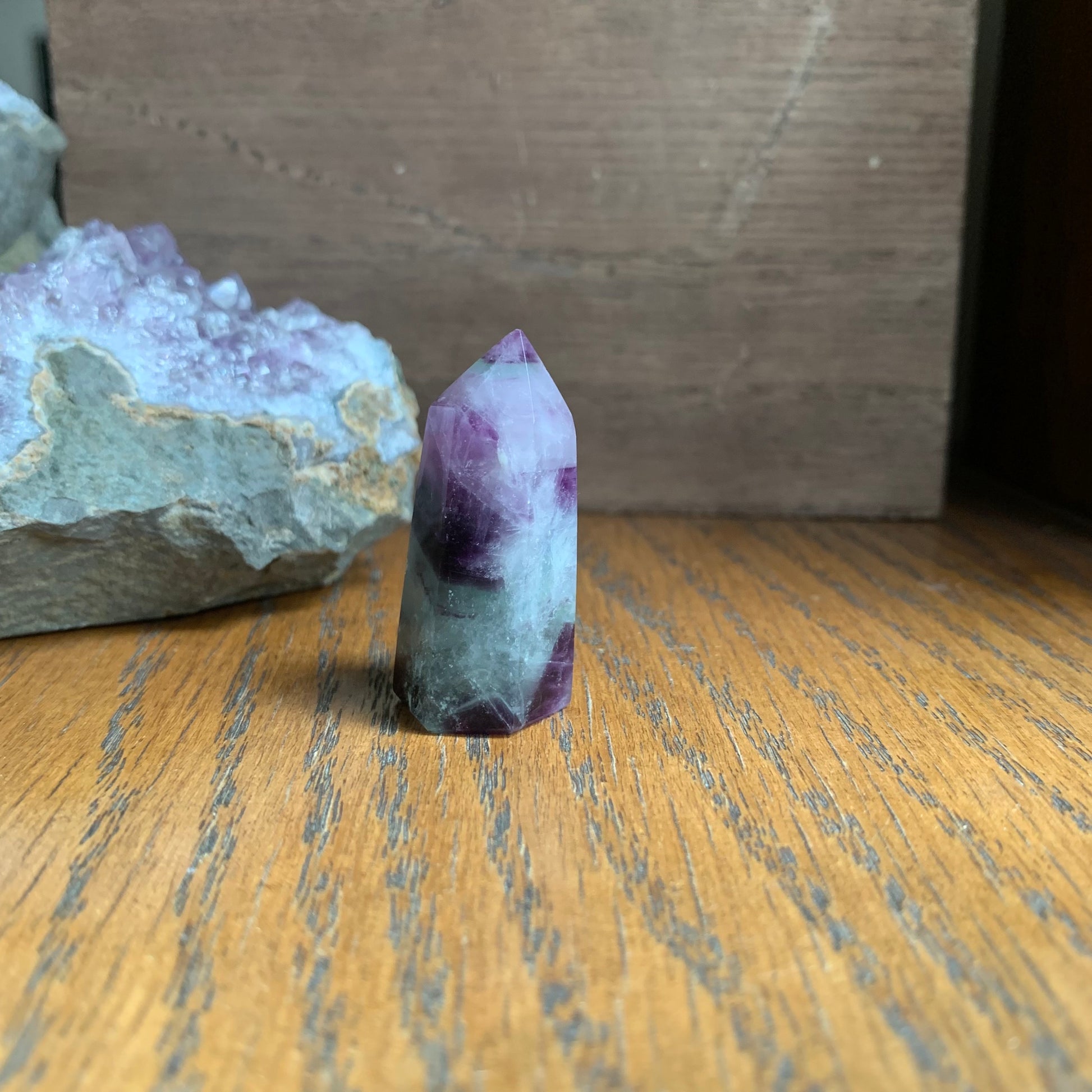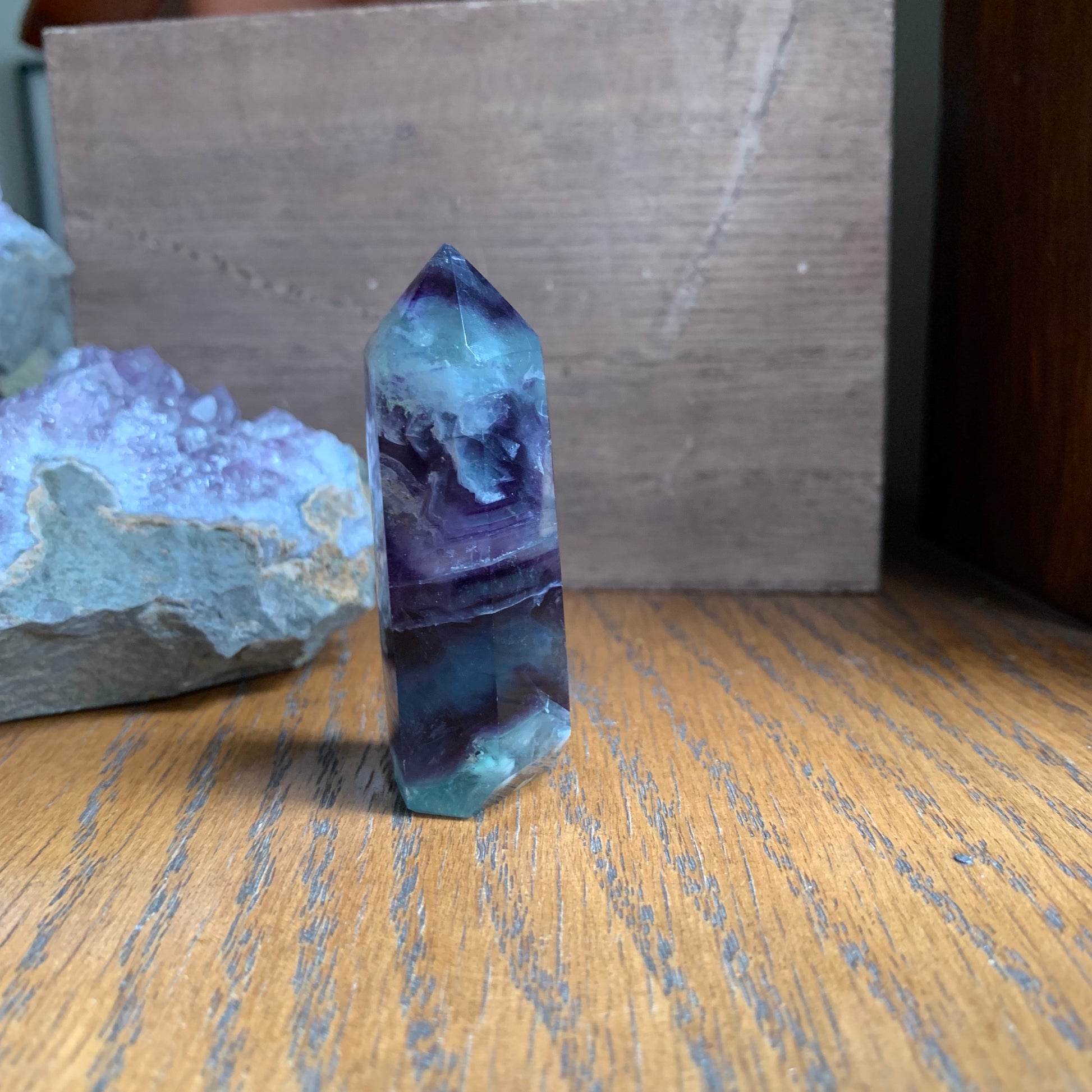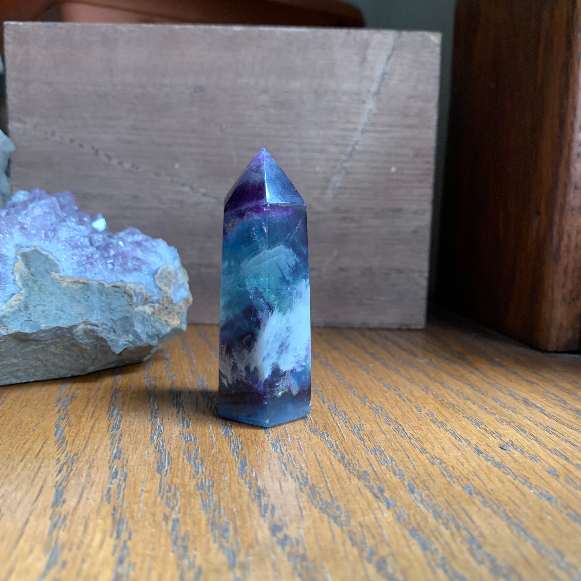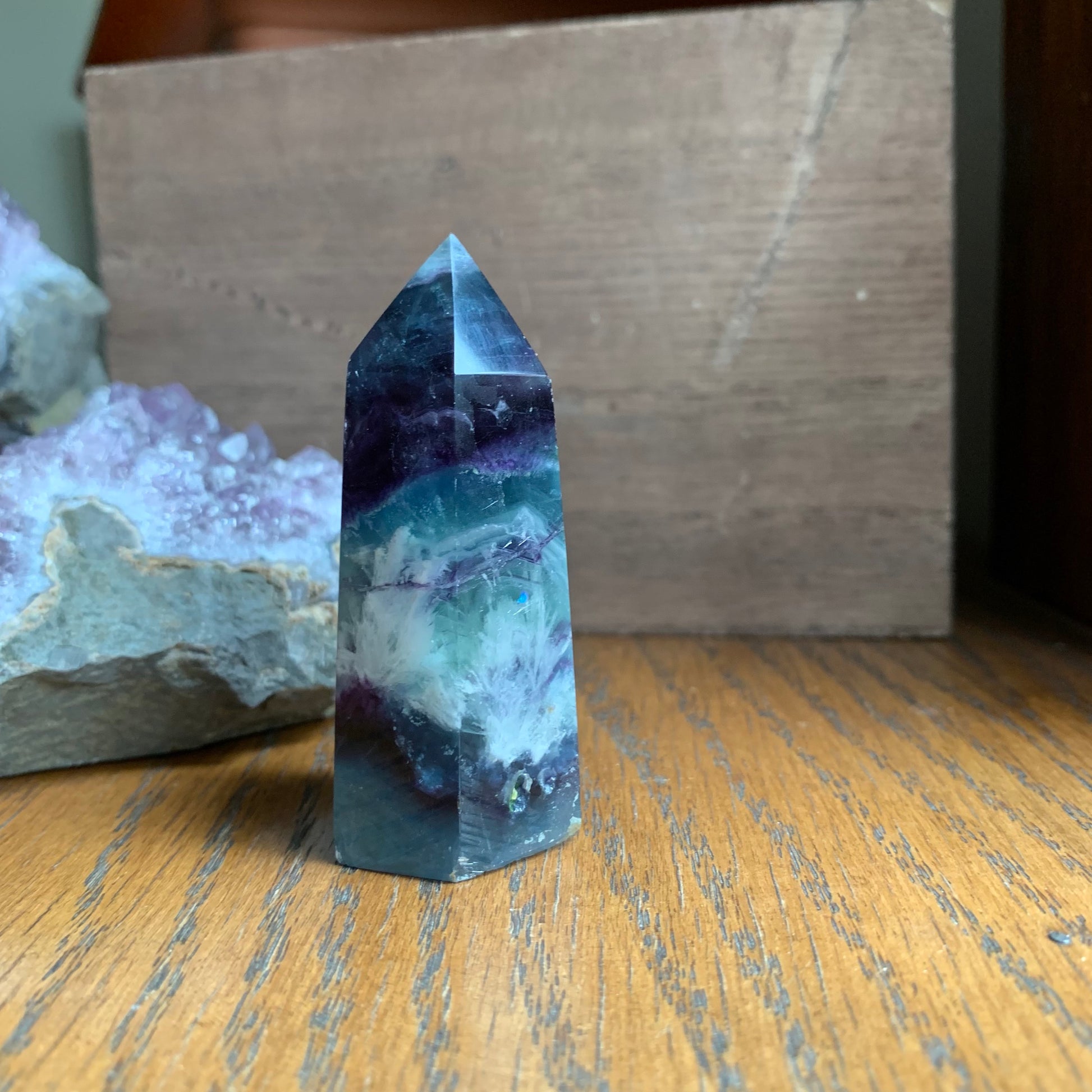 These amazing purple, blue and white towers are named "snowflake" fluorite for their white dendrites that look like snowflakes. This high-quality fluorite has gorgeous clarity, rainbow reflections and gorgeous stair stepping. They won't disappoint!